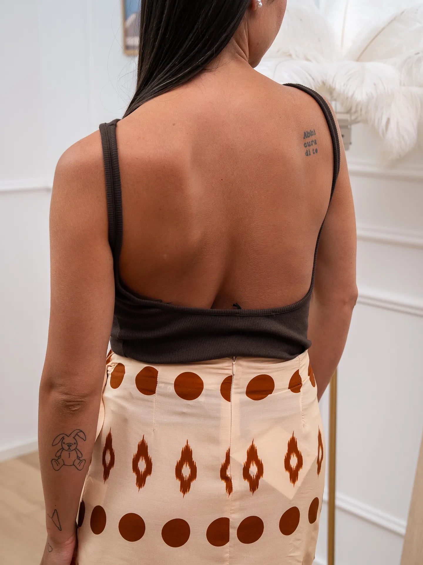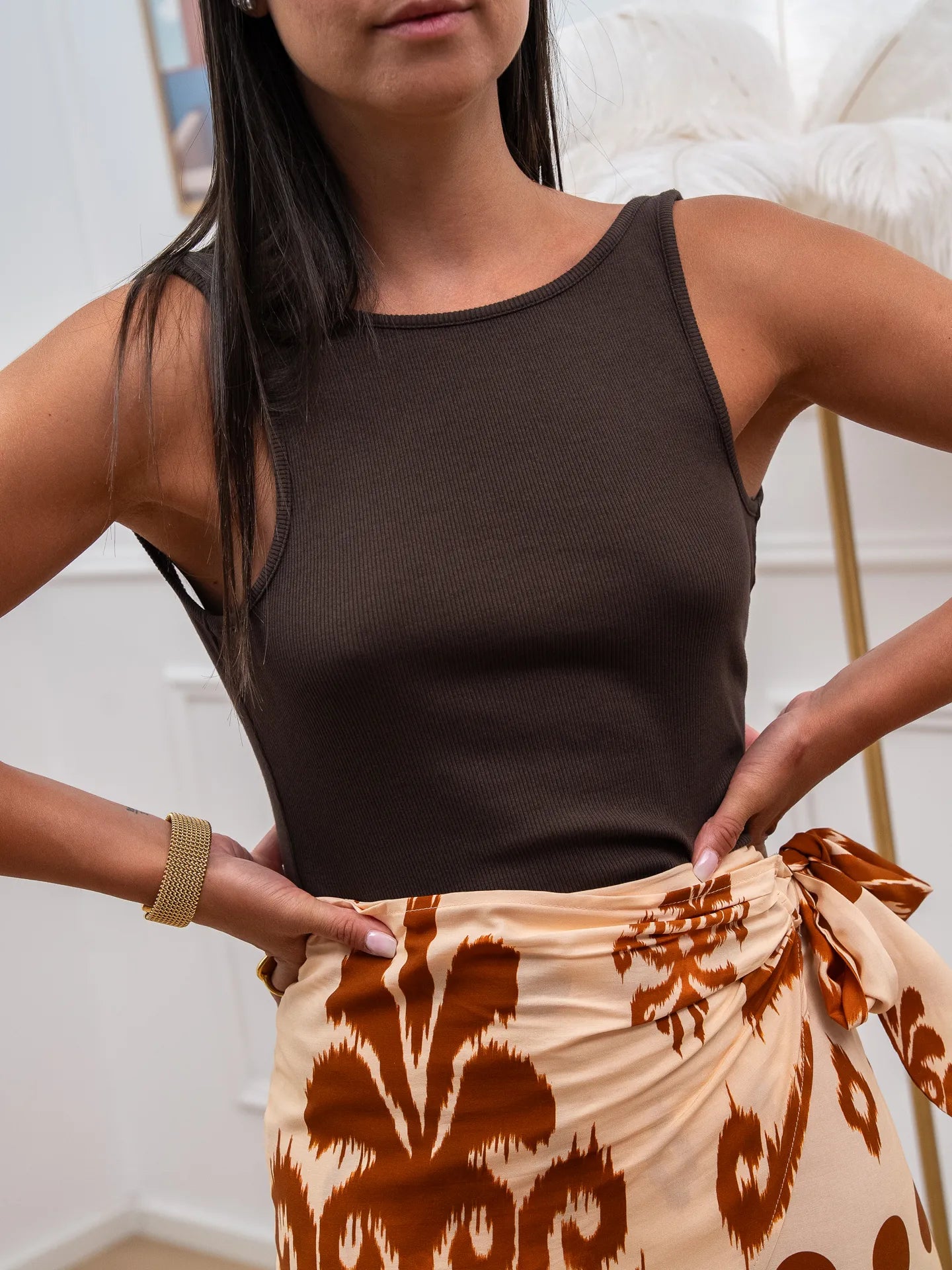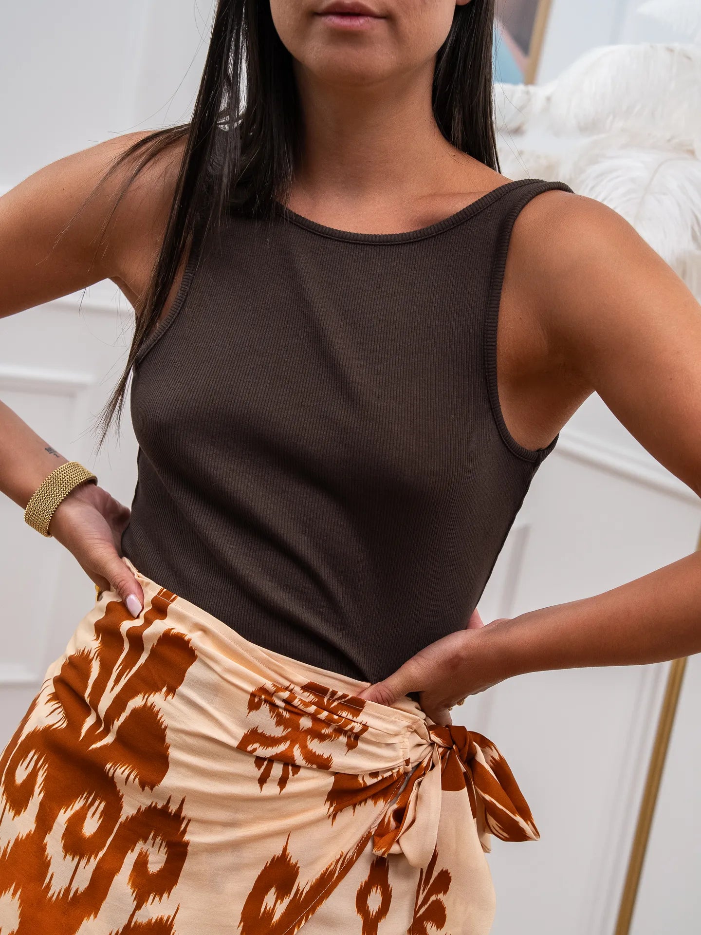 Top a costine color moro Vicolo. Modello fit regolare a canotta con scollo rotondo profondo sul retro.