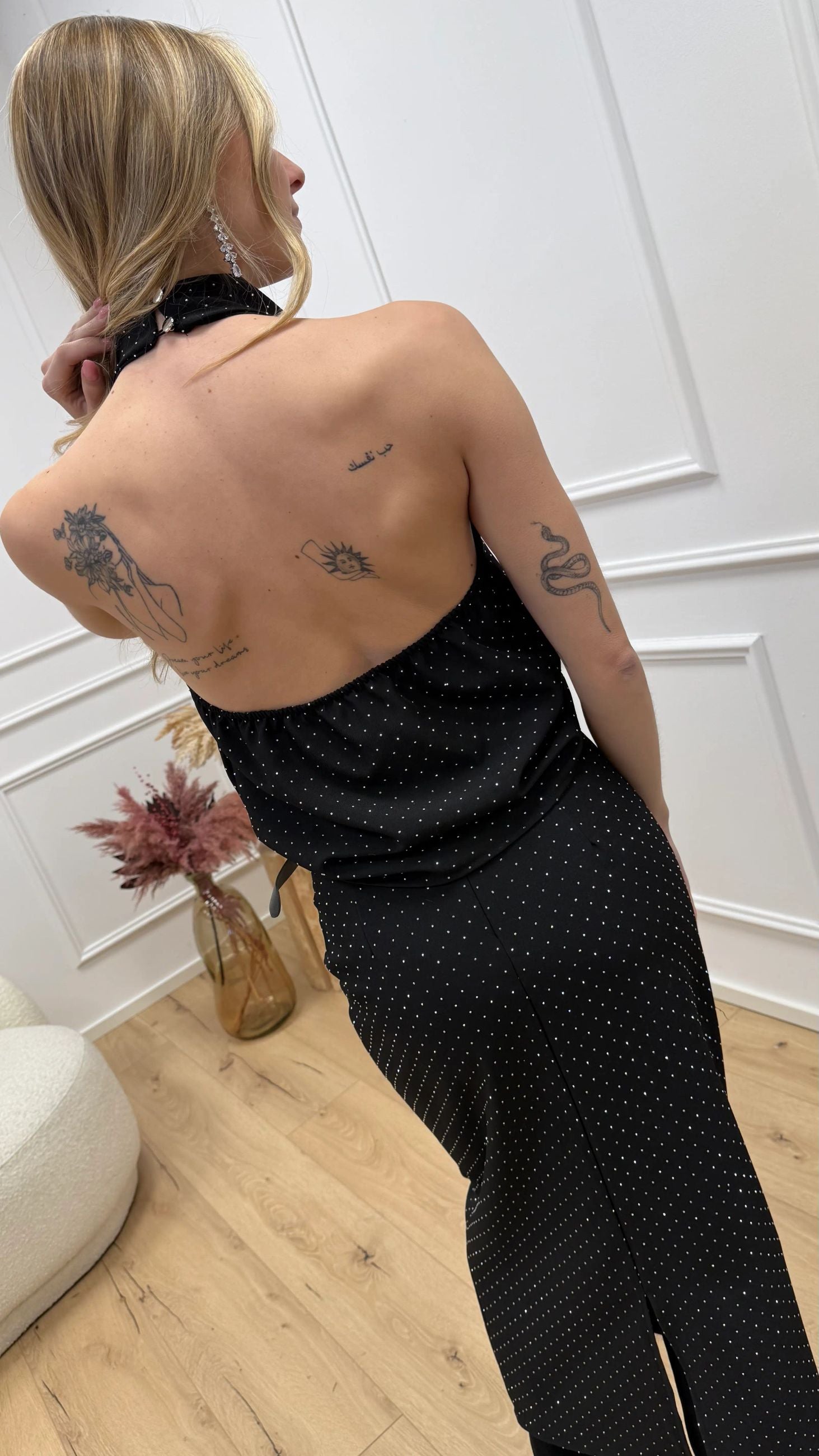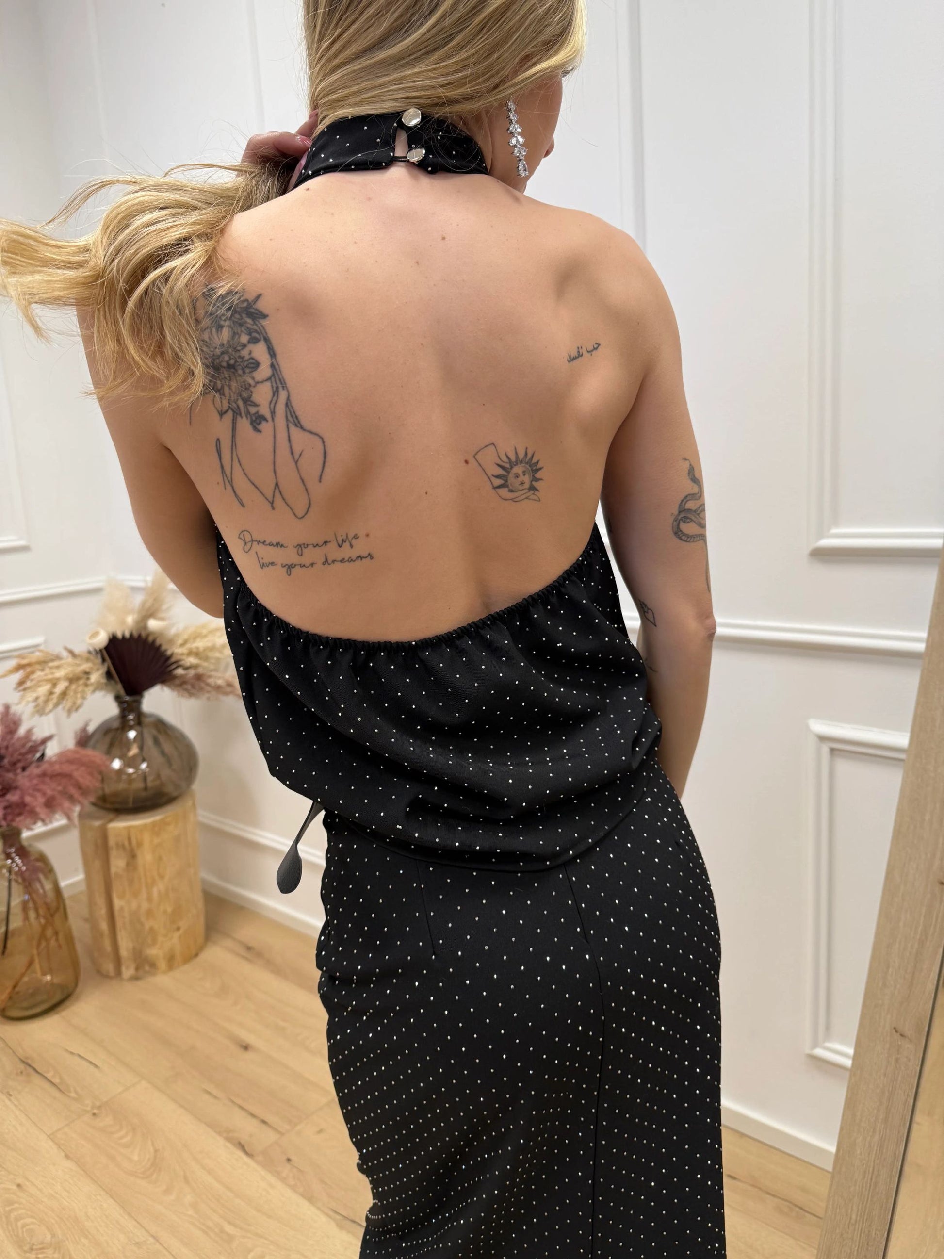 Top color nero HaveOne. Modello scollo a goccia con bottoni da allacciare sul retro del collo, schiena semi scoperta e elastico arricciato. Fit regolare. Dettaglio di strass argento all over.