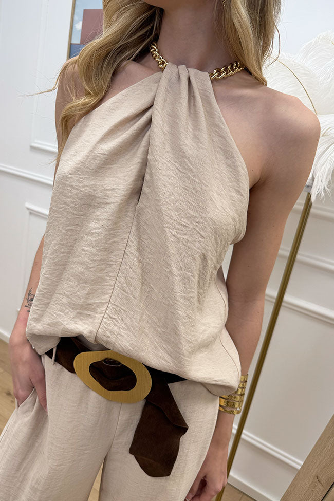 Top color sabbia in viscosa effetto stropicciato HaveOne. Modello scollo halter smanicato con dettaglio di collana a catena dorata.