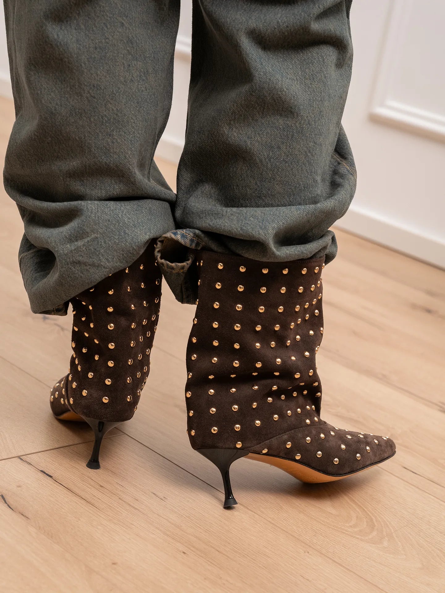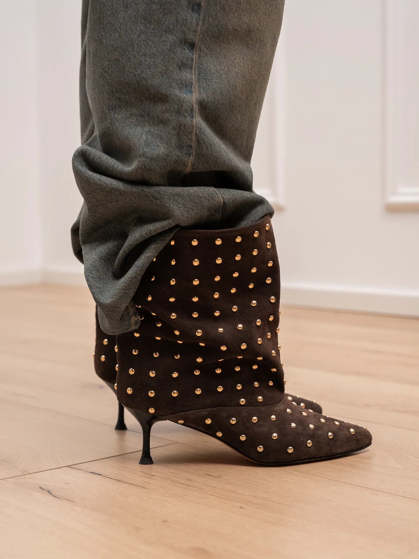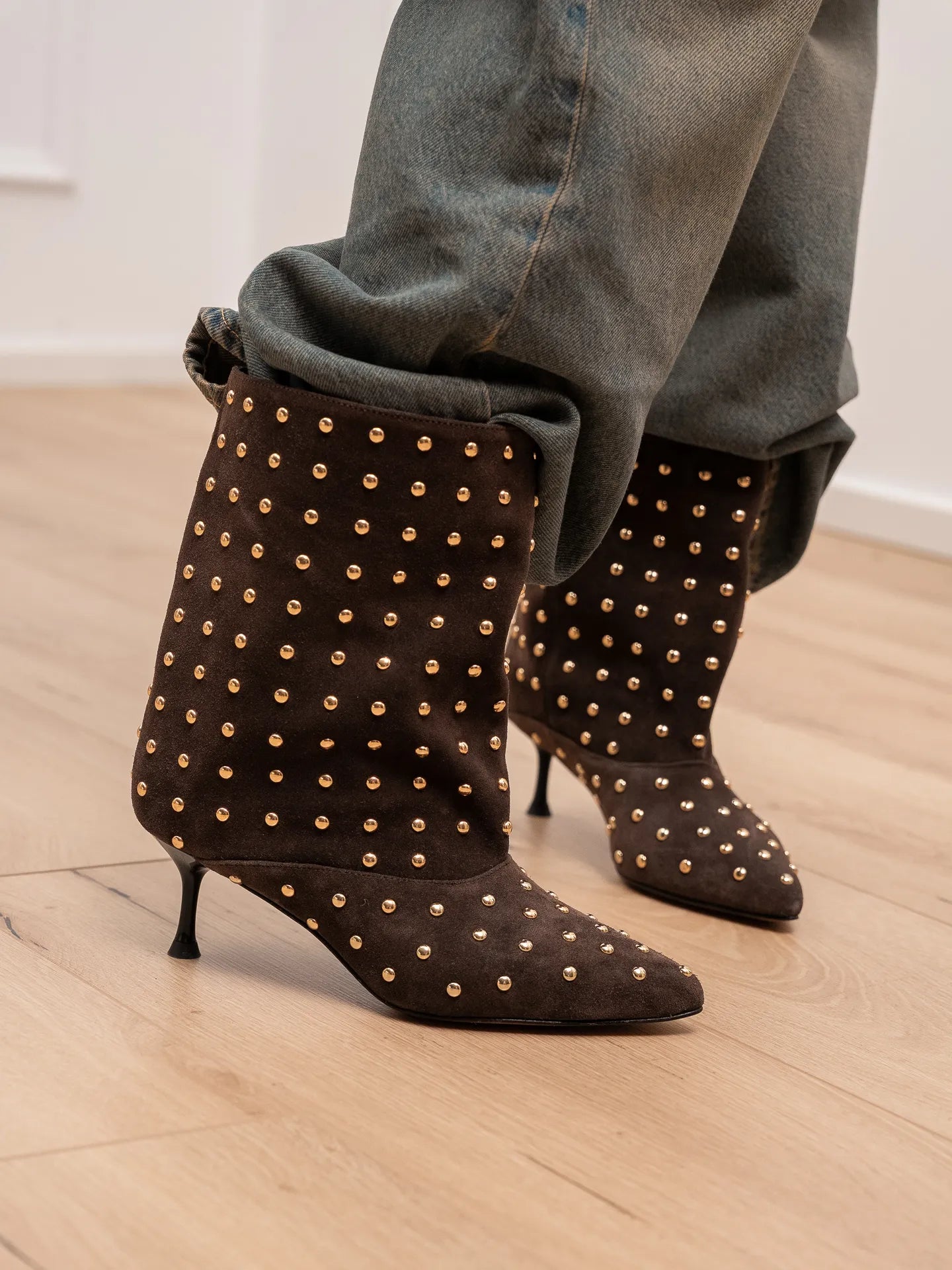 Tronchetto in crosta color moro Divine Follie. Modello a punta con tacco a rocchetto. Dettaglio di borchie rotonde oro. Gambale ampio.