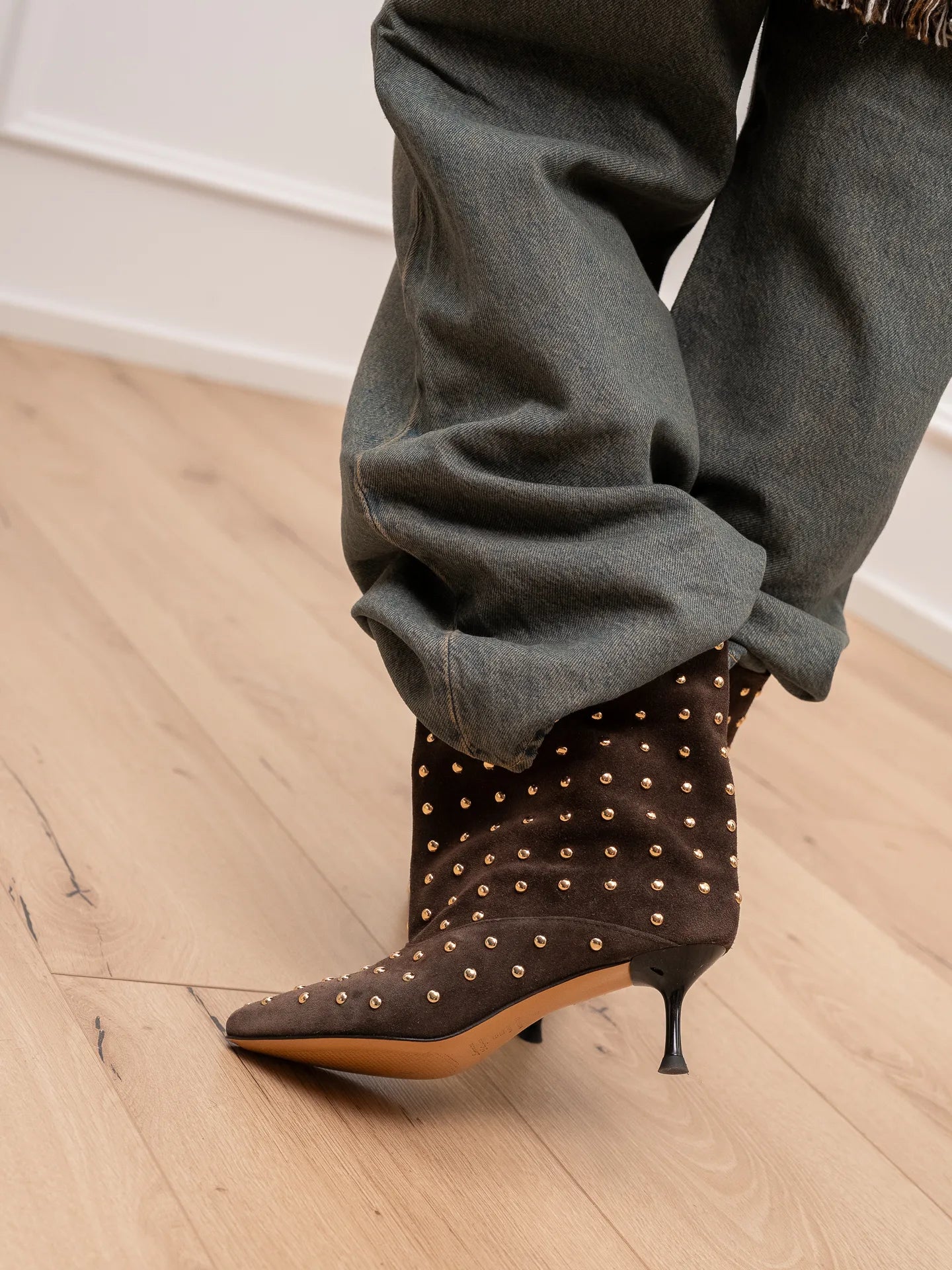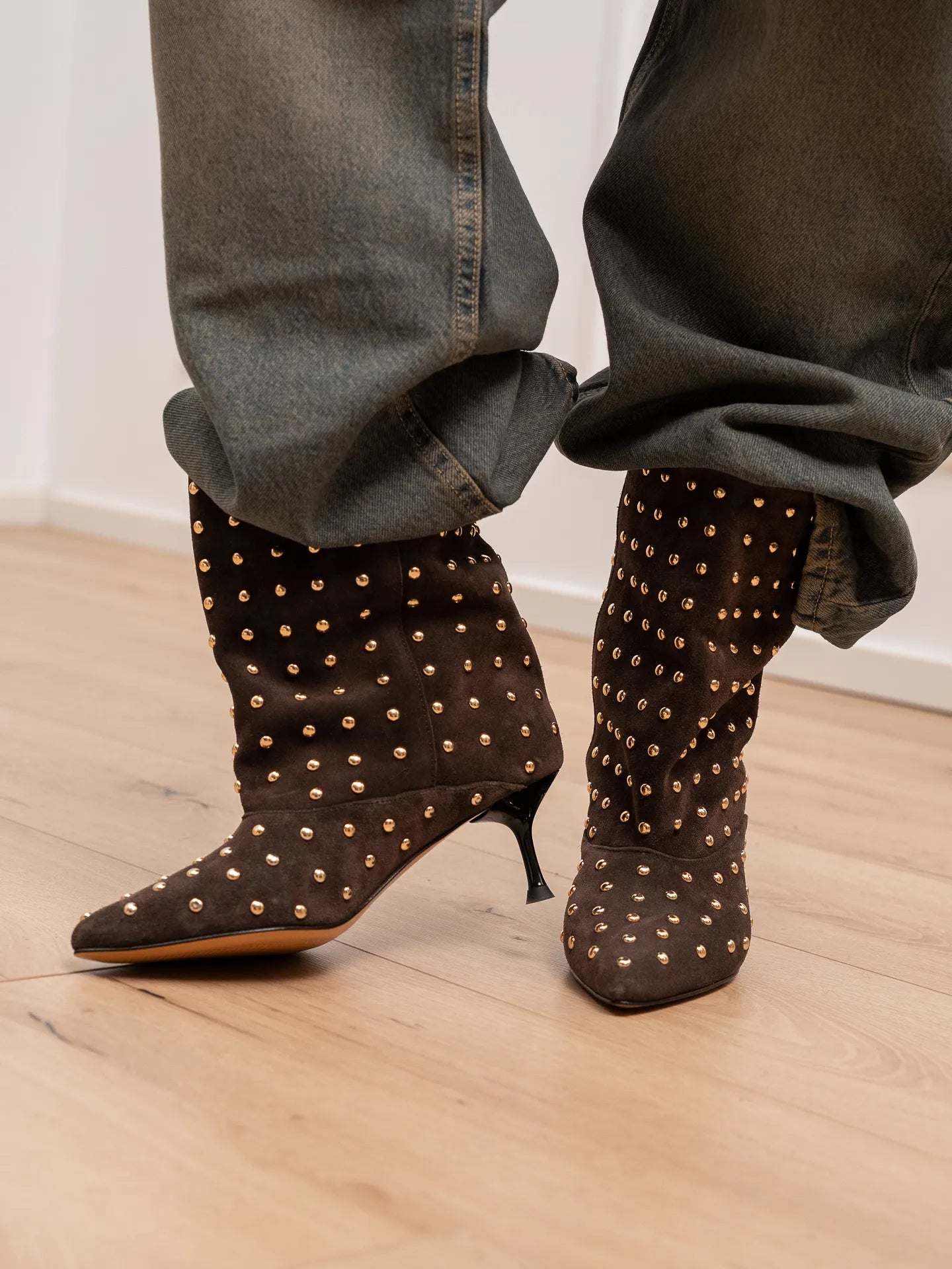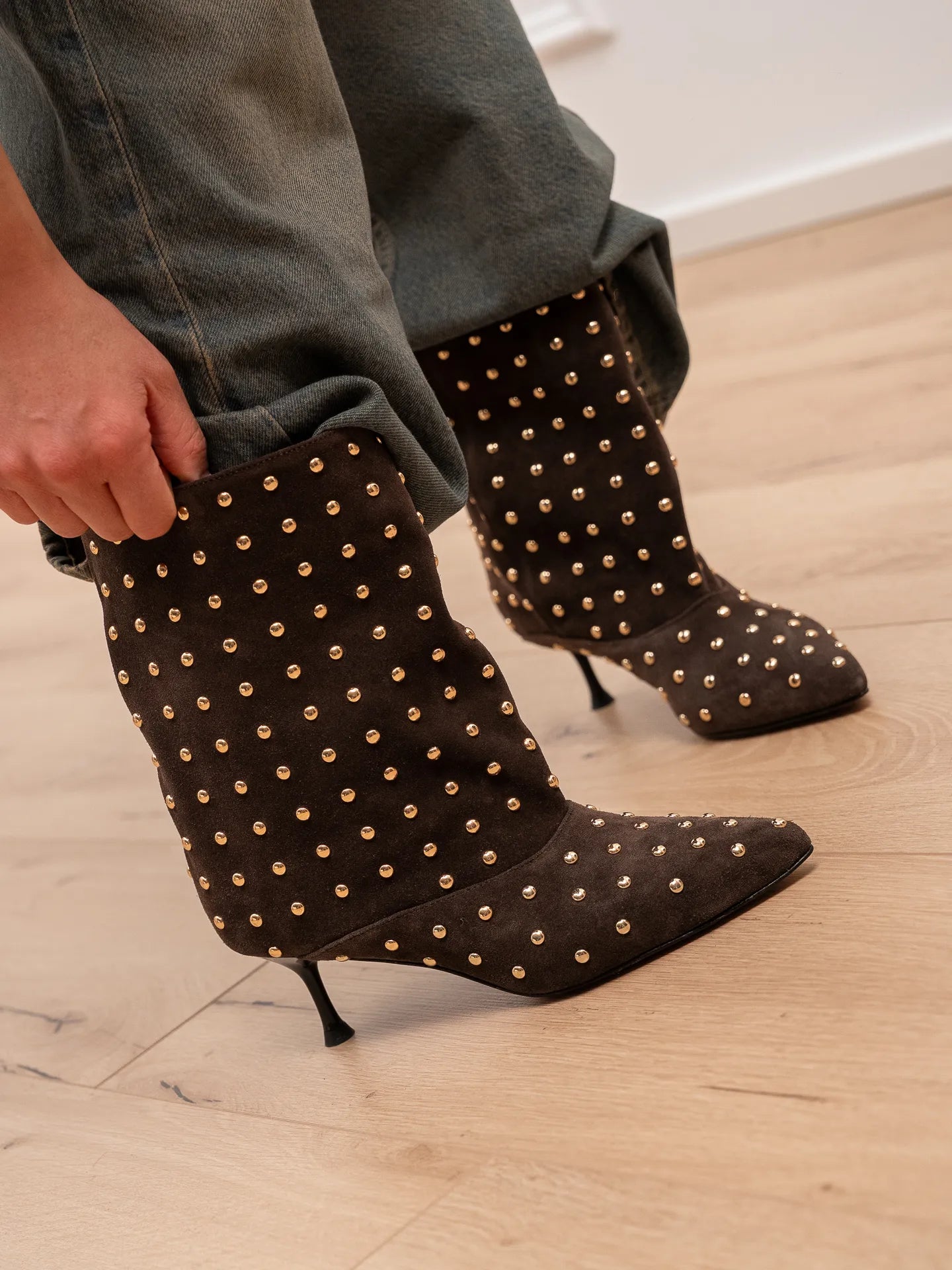 Tronchetto in crosta color moro Divine Follie. Modello a punta con tacco a rocchetto. Dettaglio di borchie rotonde oro. Gambale ampio.