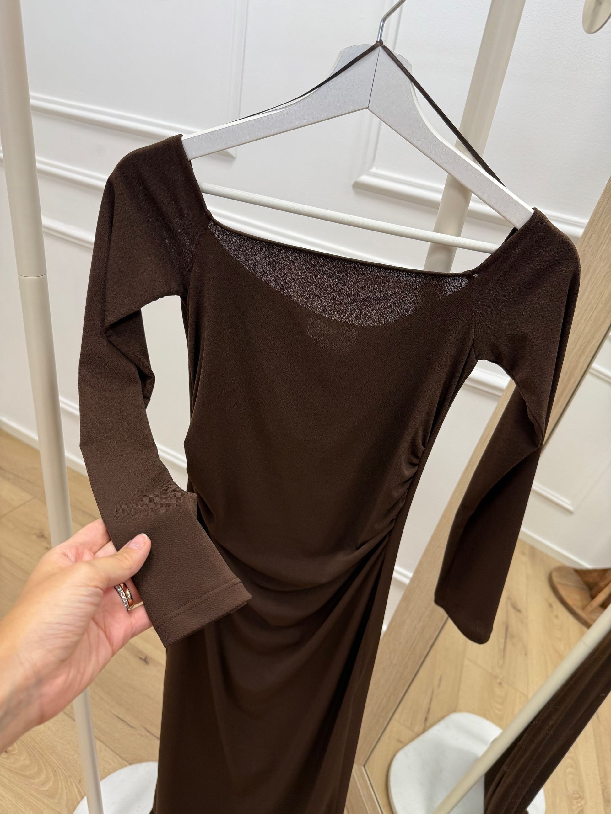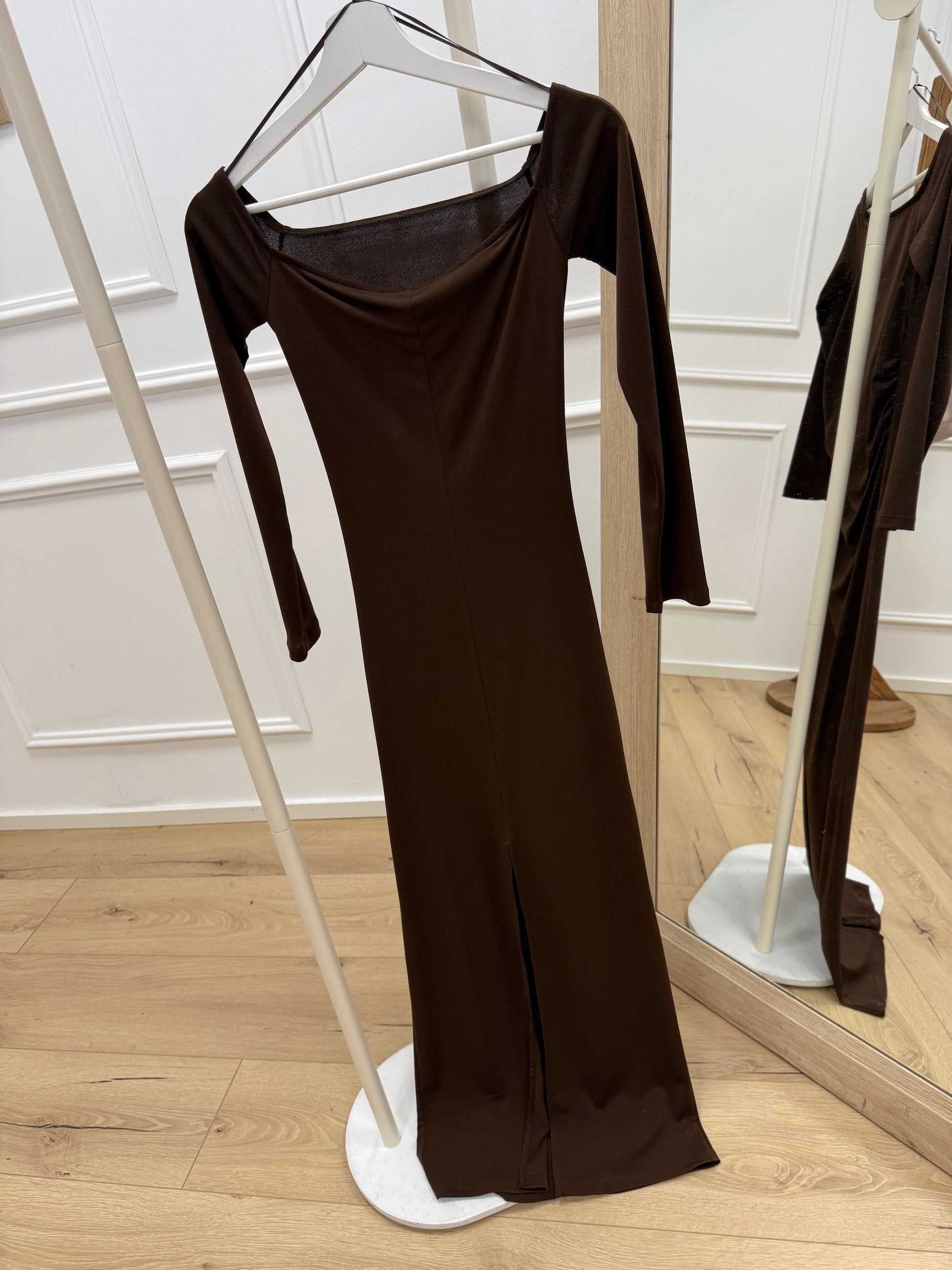 Vestito cioccolato in jersey Vicolo. Modello lungo con scollo bardot e maniche lunghe. Fit aderente con arricci laterali e spacco sul retro.