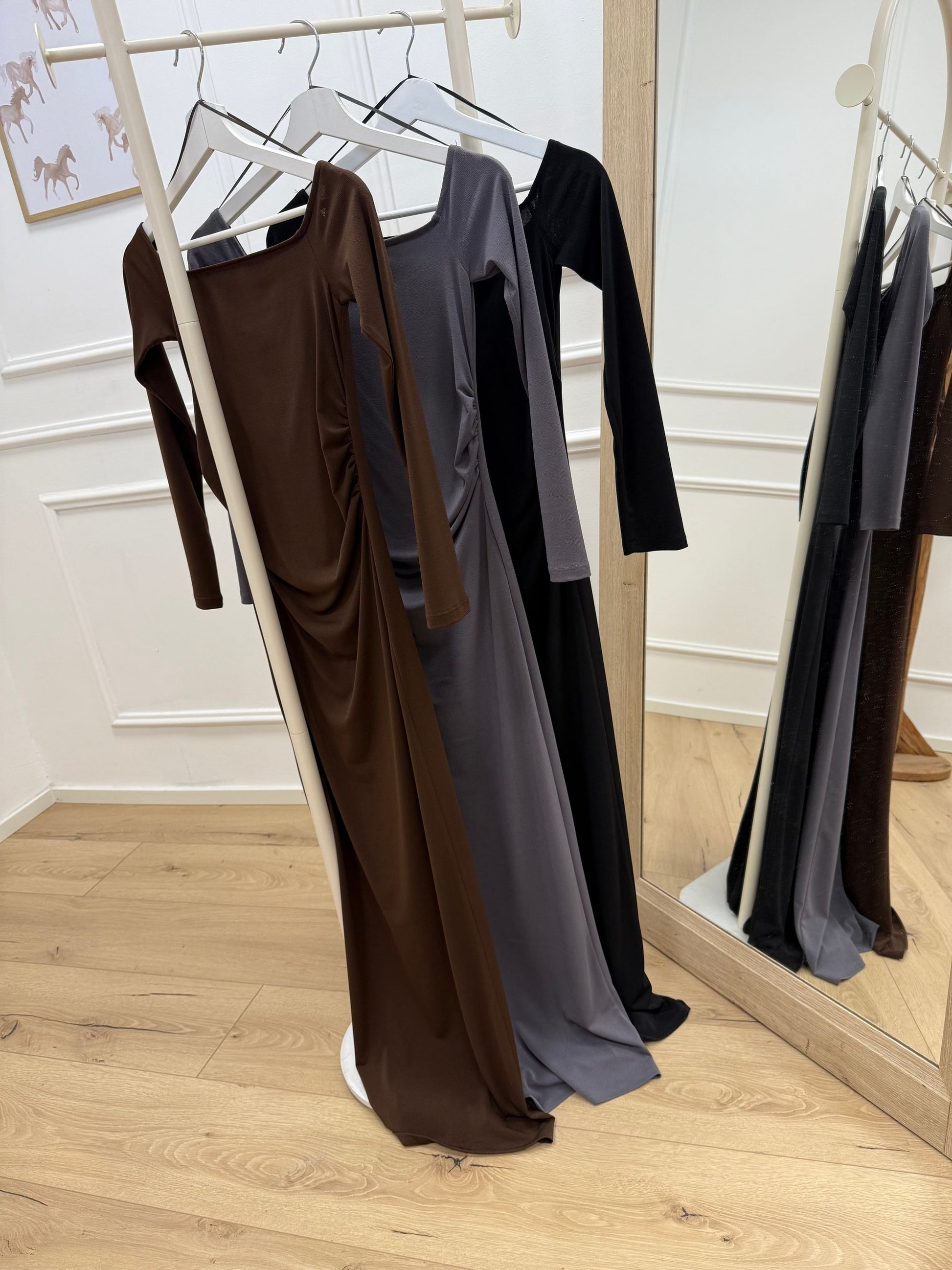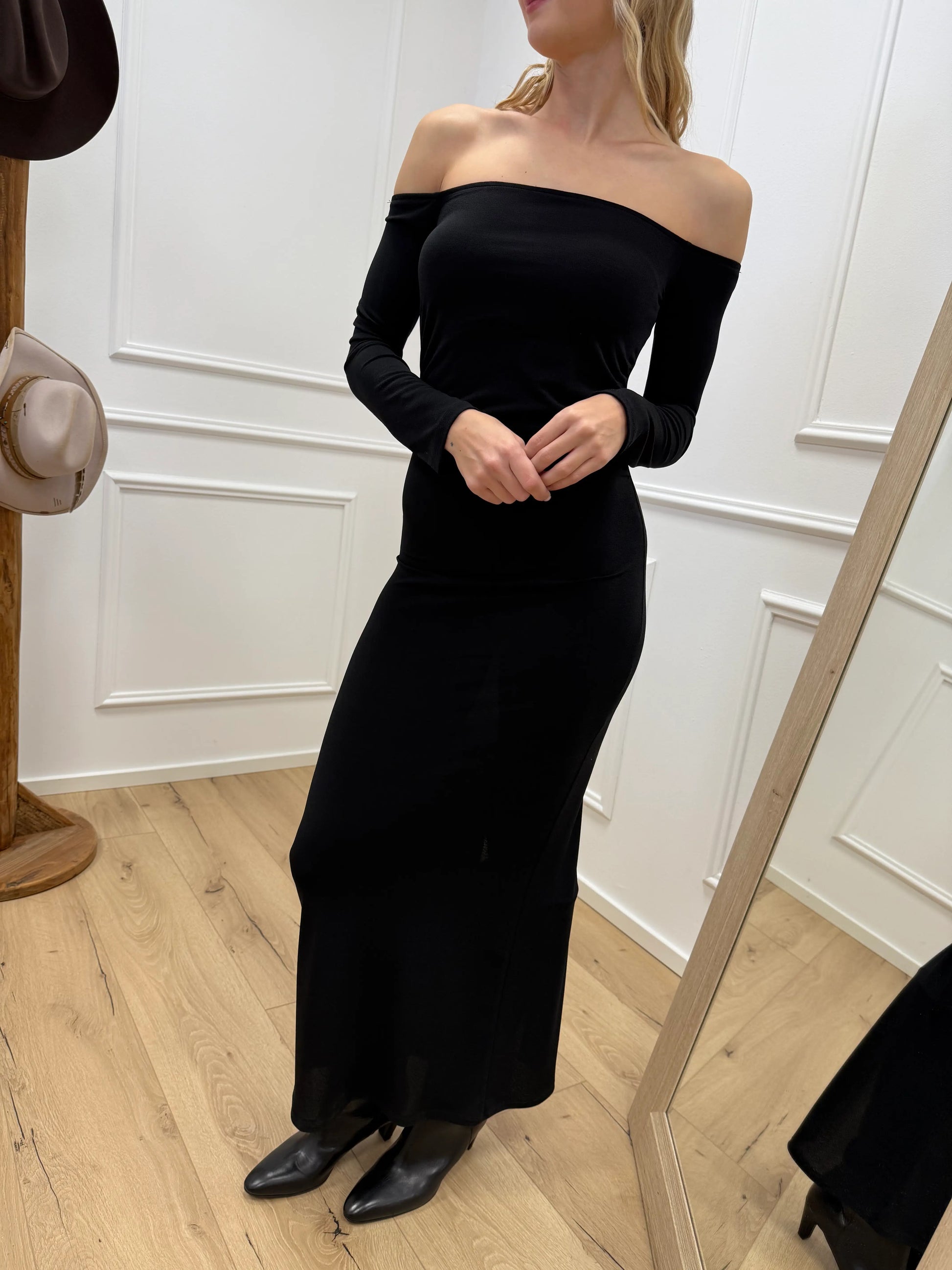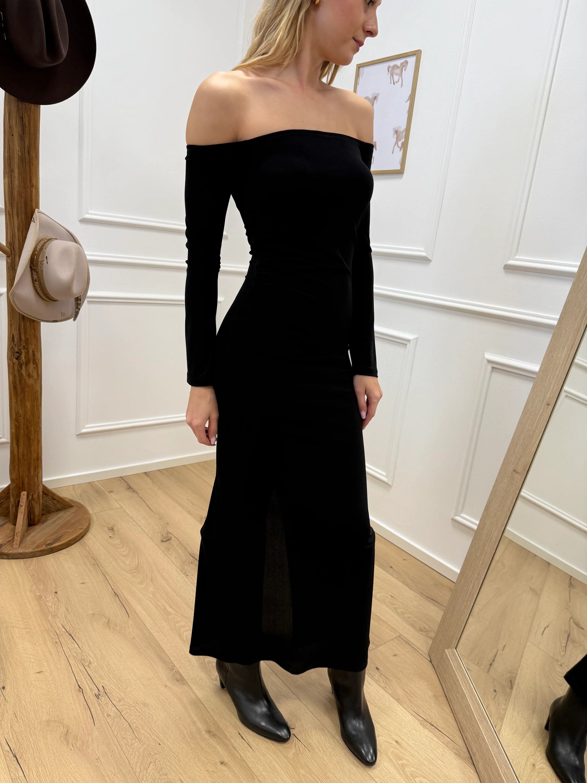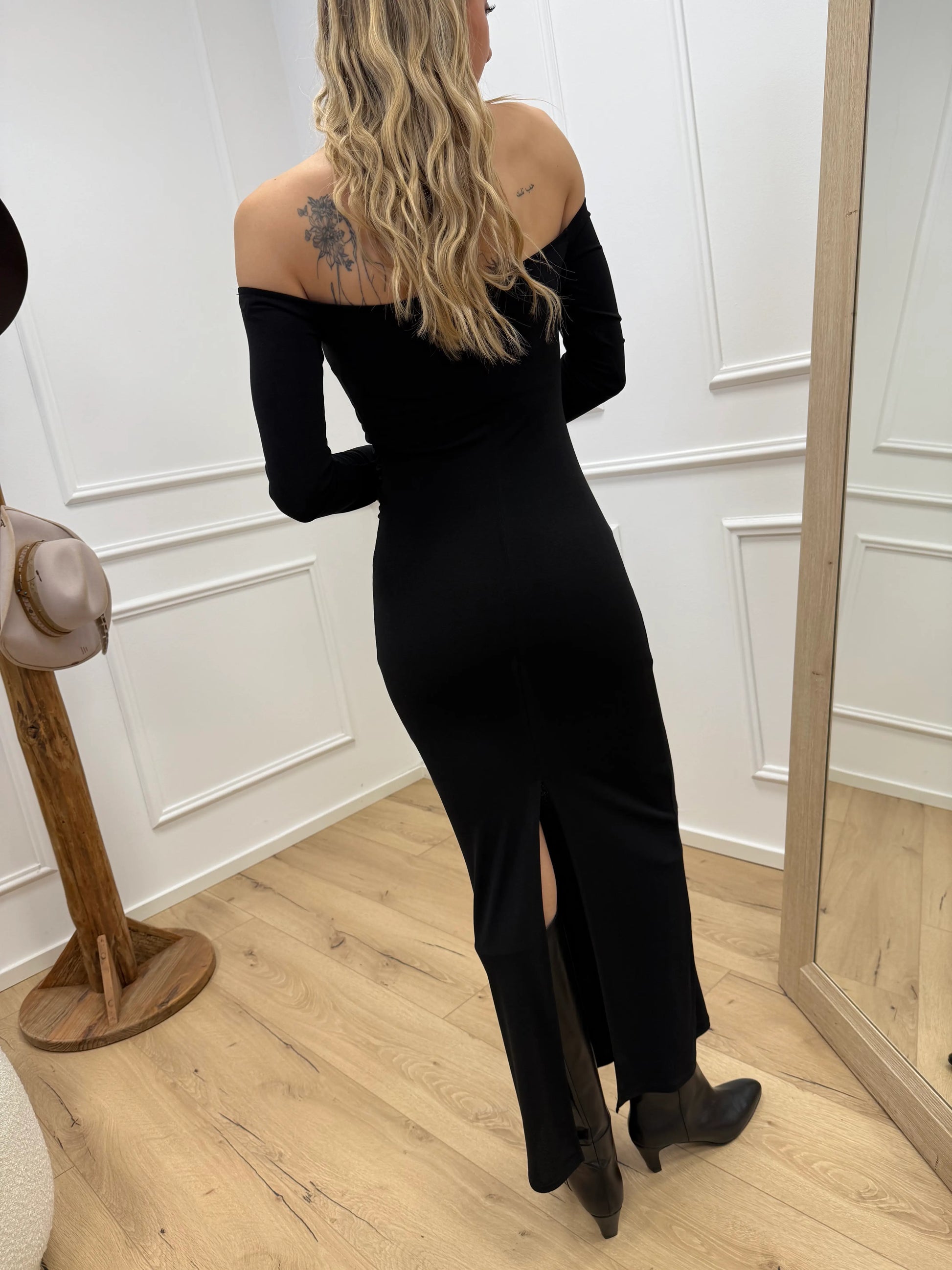 Vestito nero in jersey Vicolo. Modello lungo con scollo bardot e maniche lunghe. Fit aderente con arricci laterali e spacco sul retro.