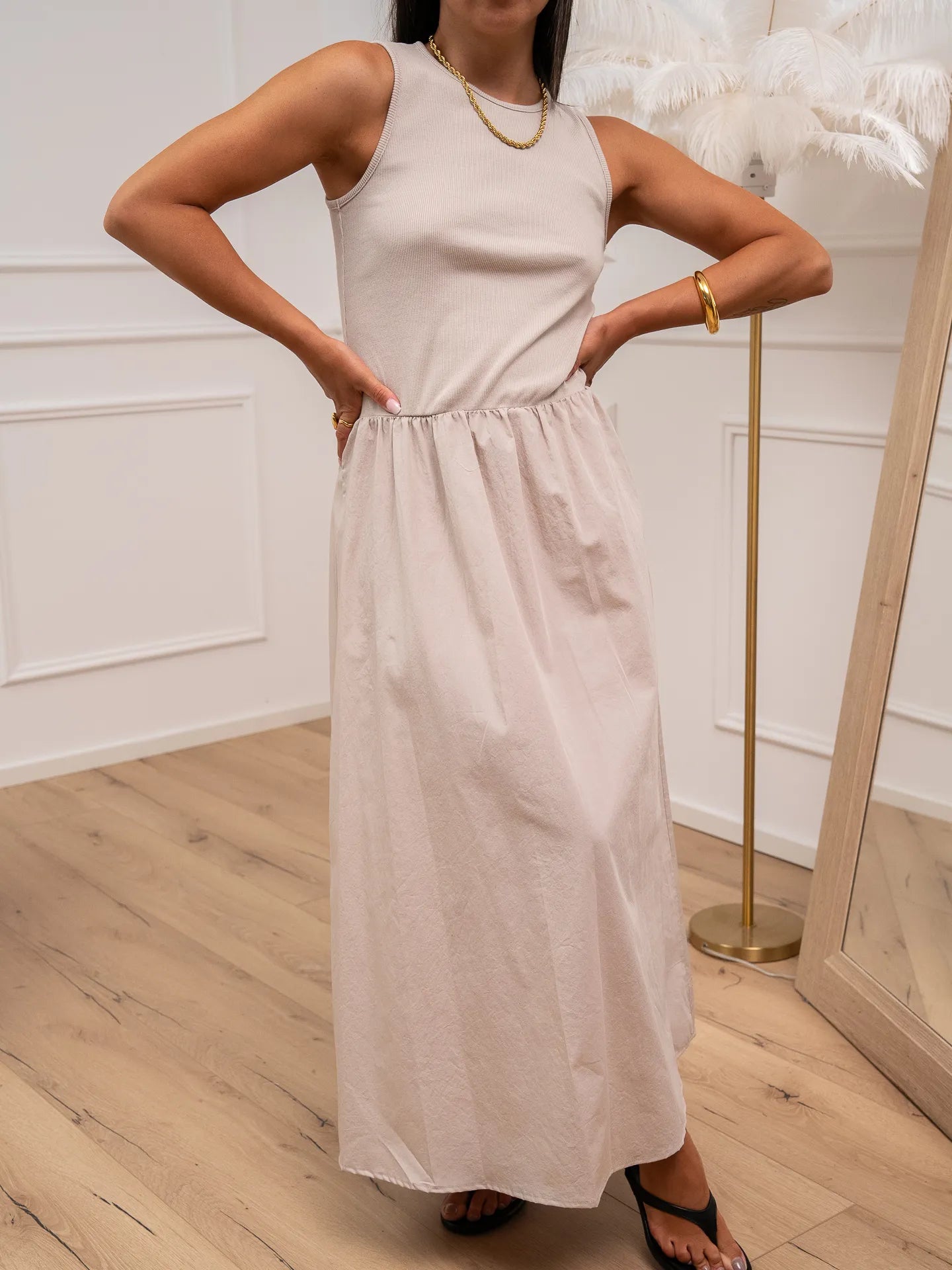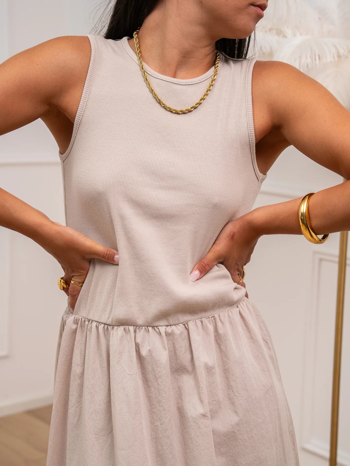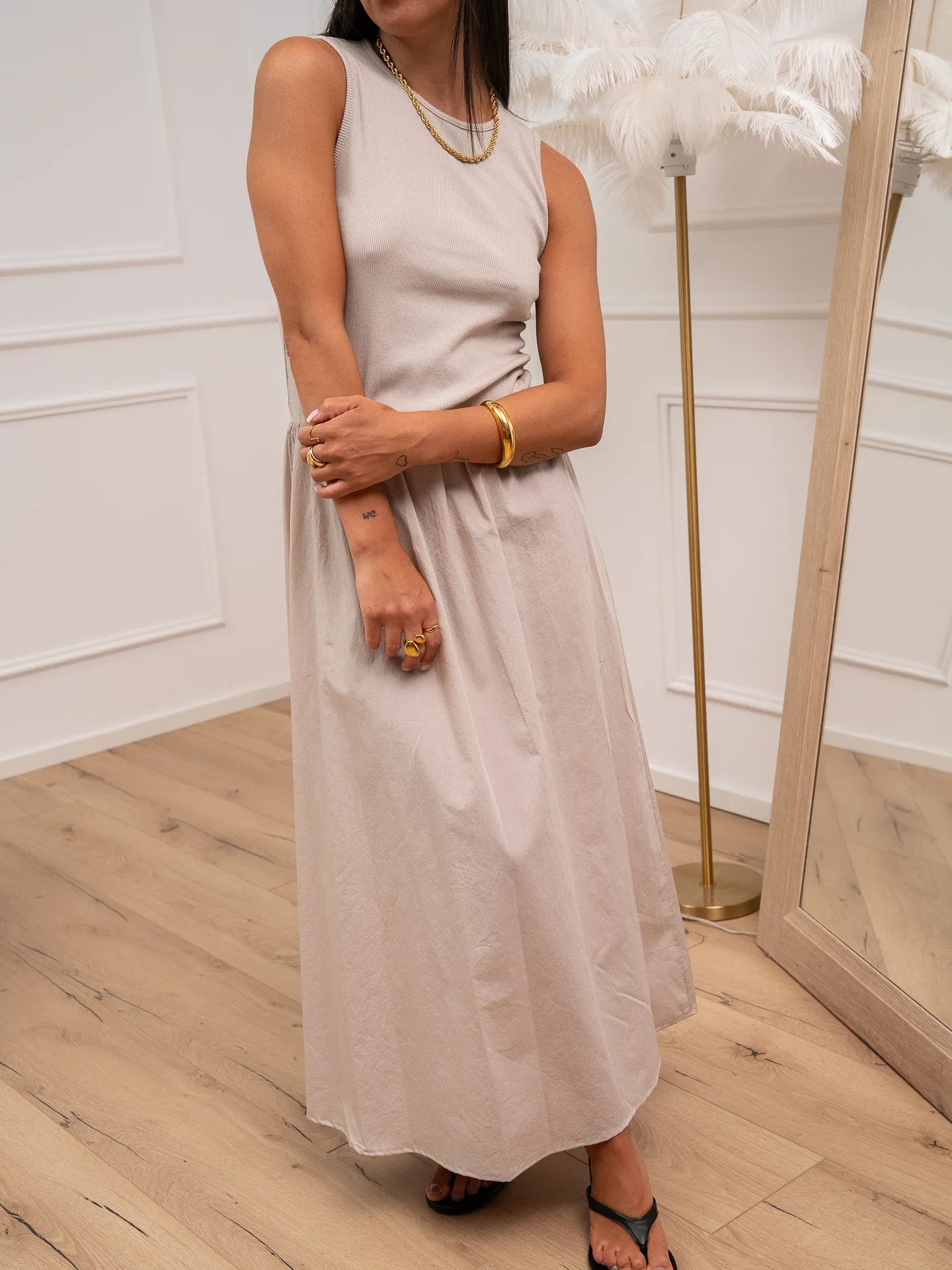 Vestito Cassandra in bimateriale color nero Vicolo. Modello con canotta a costine girocollo, e gonna lunga a palloncino in popeline di cotone.