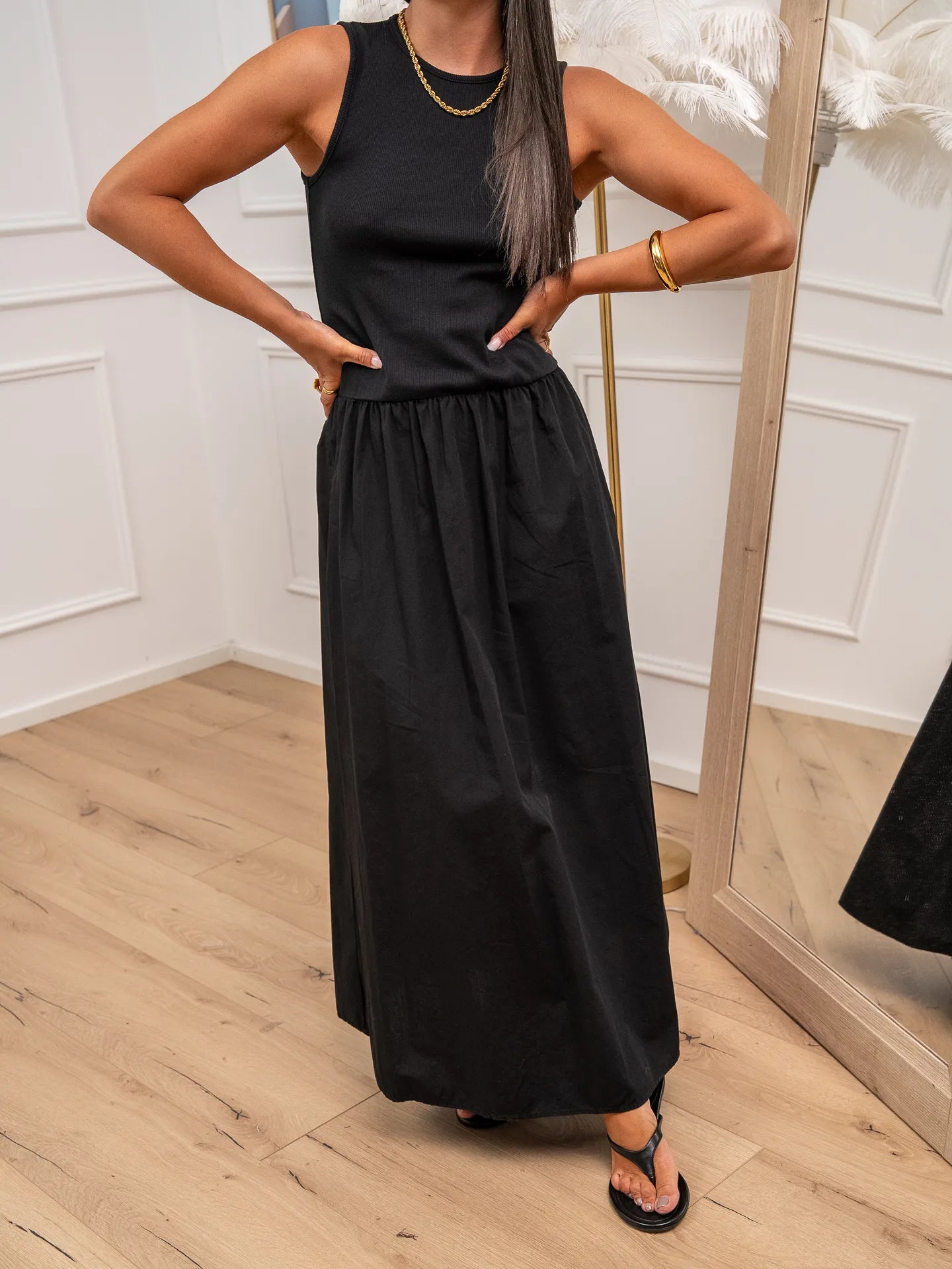 Vestito Cassandra in bimateriale color nero Vicolo. Modello con canotta a costine girocollo, e gonna lunga a palloncino in popeline di cotone.