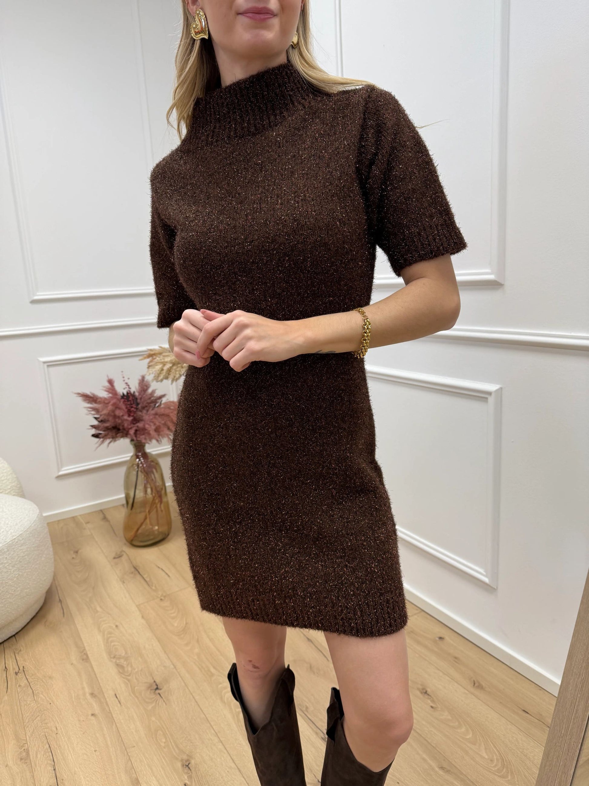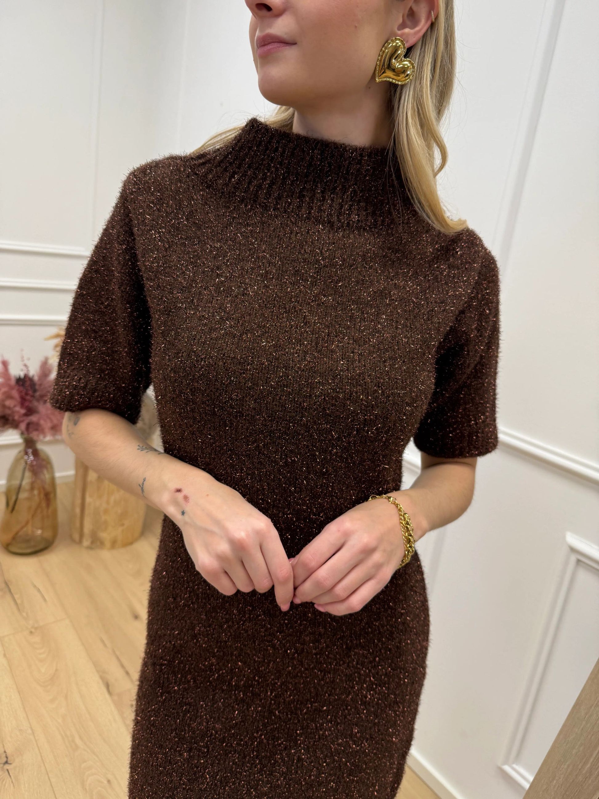 Vestito mini color moro con filo lamè HaveOne. Modello fit morbido con mezza manica e collo a vulcano. Finiture a coste.
