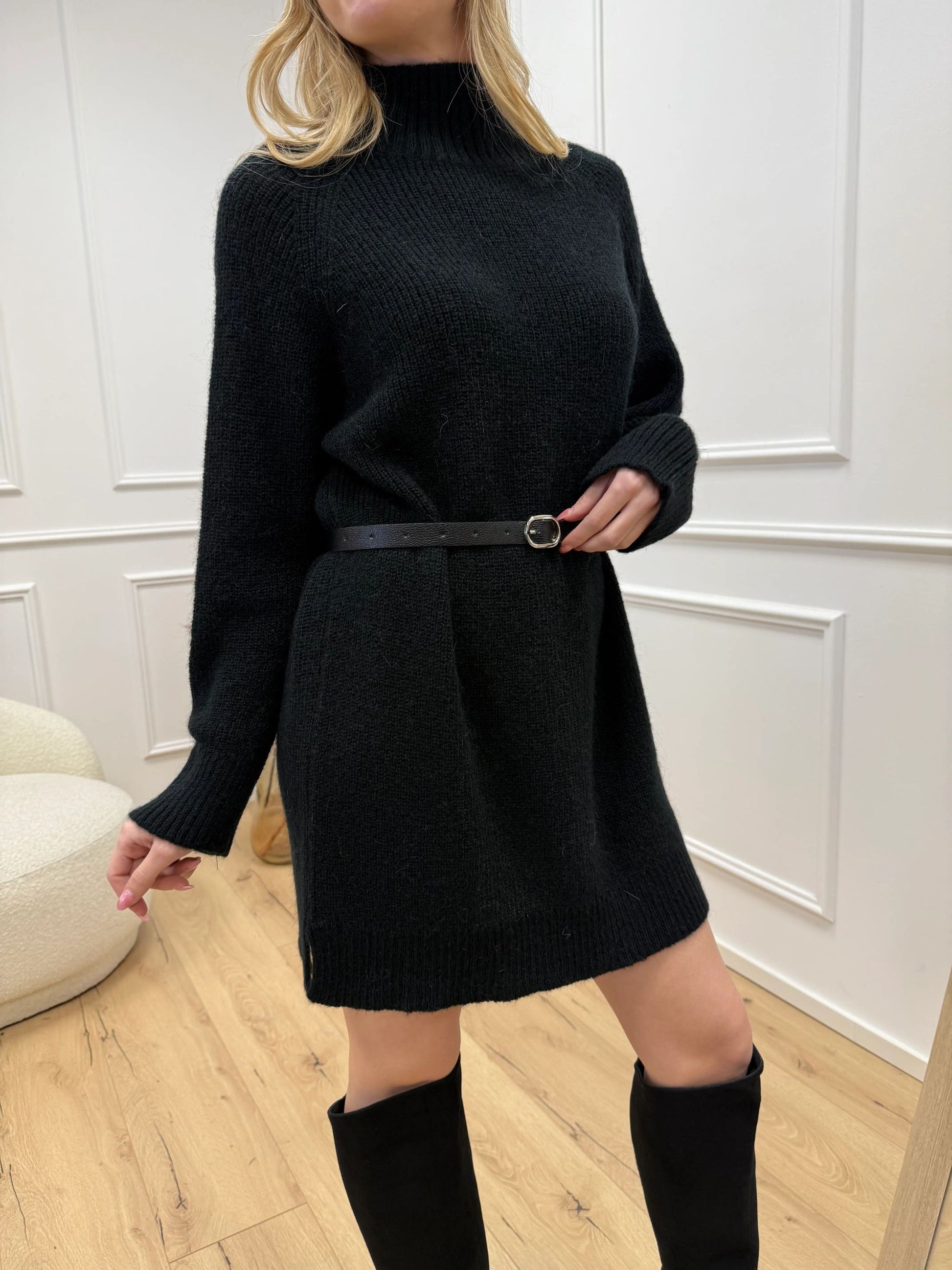 Vestito corto color nero Kontatto. Modello dolcevita fit morbido con dettaglio di cintura in vita. Finiture a coste e spacchetti laterali.