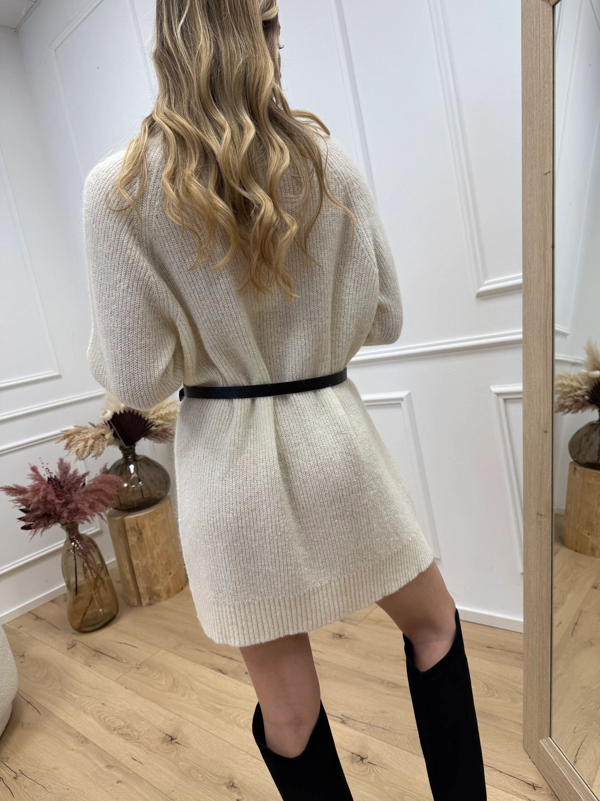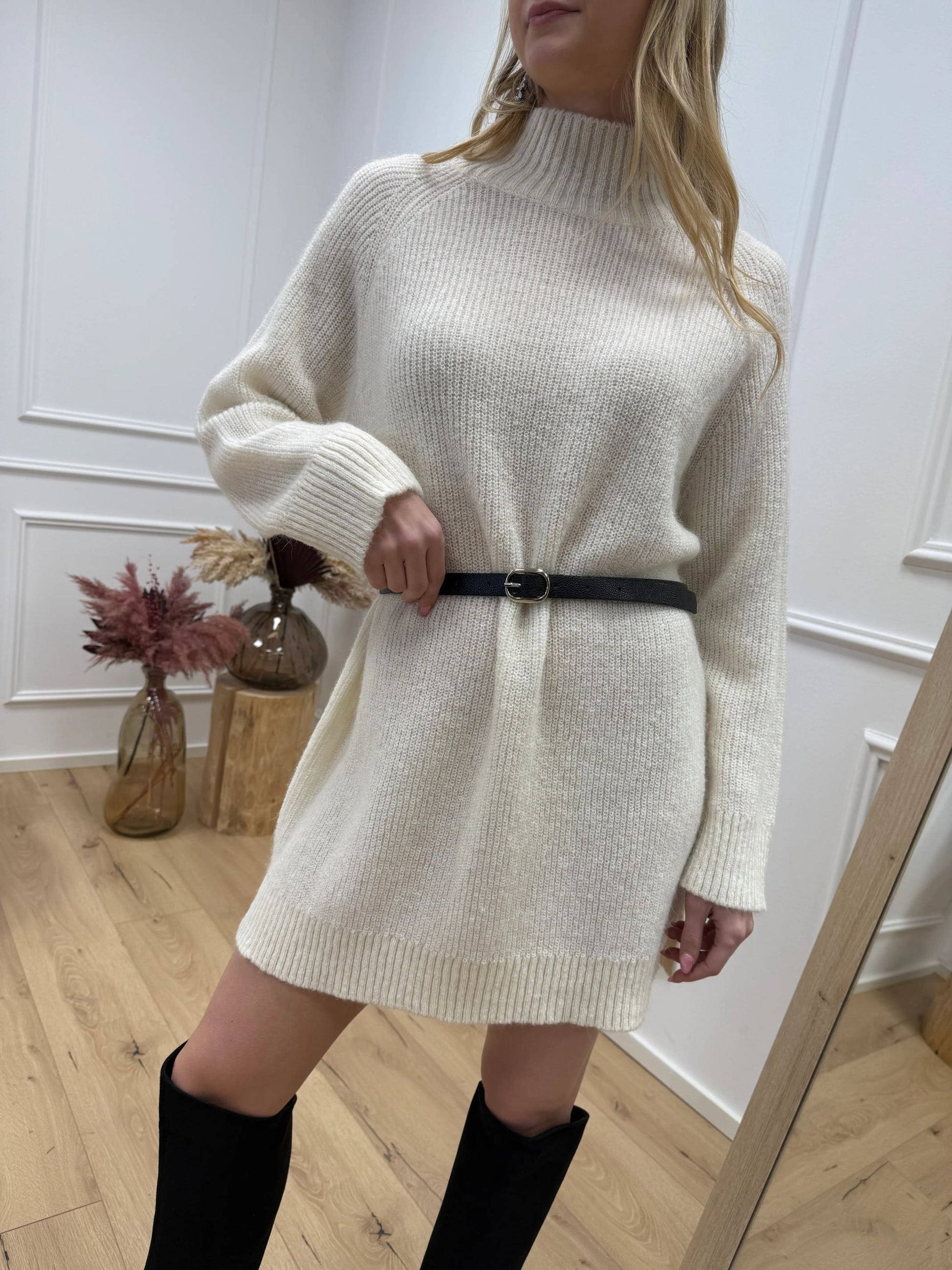 Vestito corto color panna Kontatto. Modello dolcevita fit morbido con dettaglio di cintura in vita. Finiture a coste e spacchetti laterali.