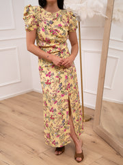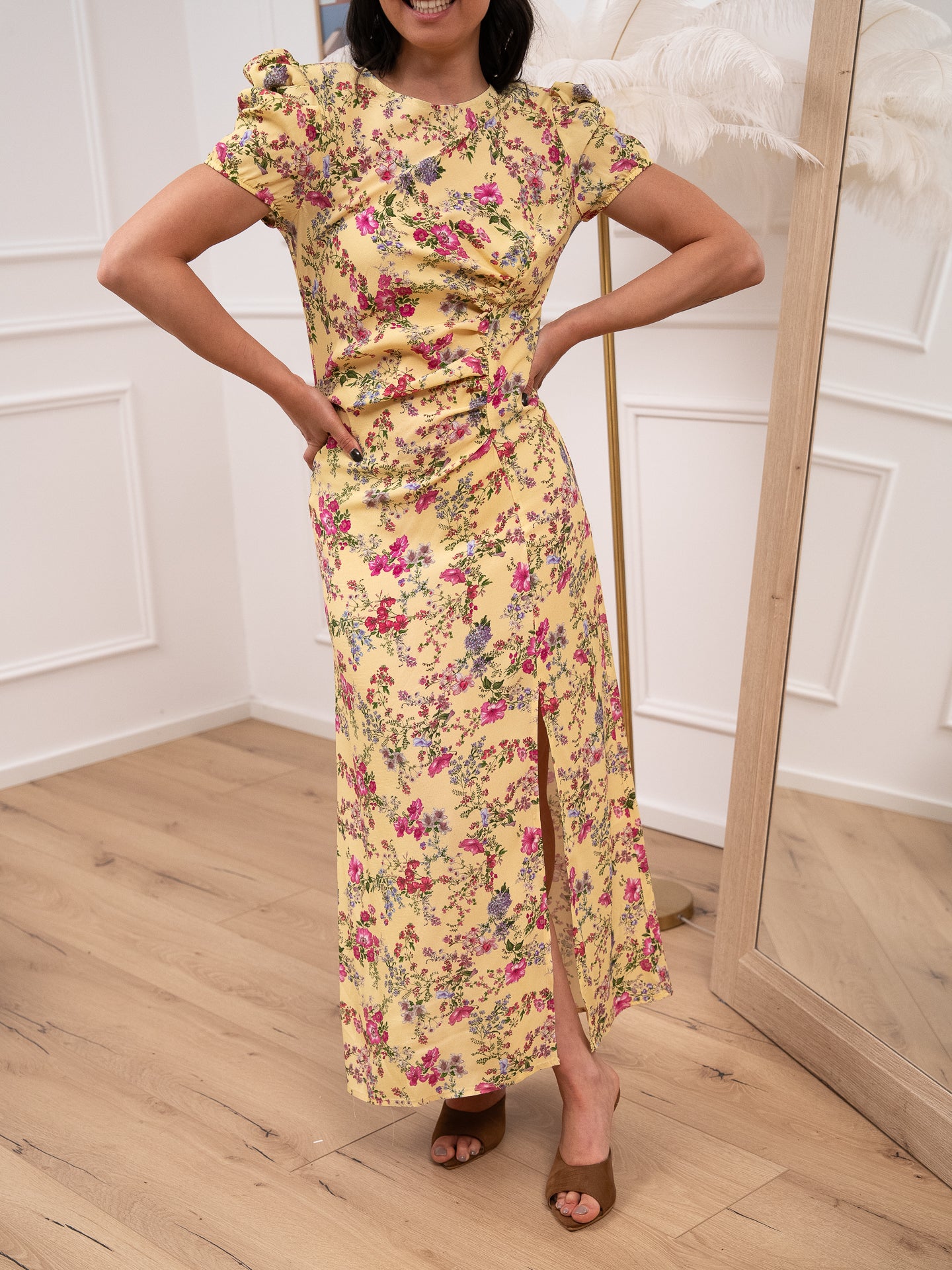 Vestito giallo con fiorellini Vicolo. Modello lungo fit aderente girocollo con mezza manica a palloncino. Cucitura obliqua laterale con arriccio e spacco.