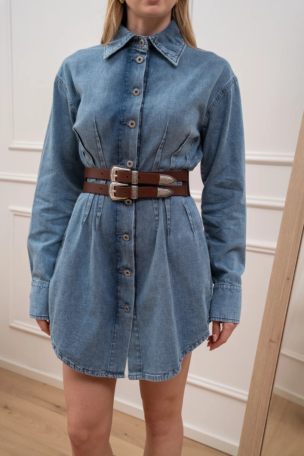 Vestito in denim Dixie. Modello fit sfiancato con impunture e chiusura su tutta la lunghezza. Manica lunga con polsino sul fondo. Fondo stondato.