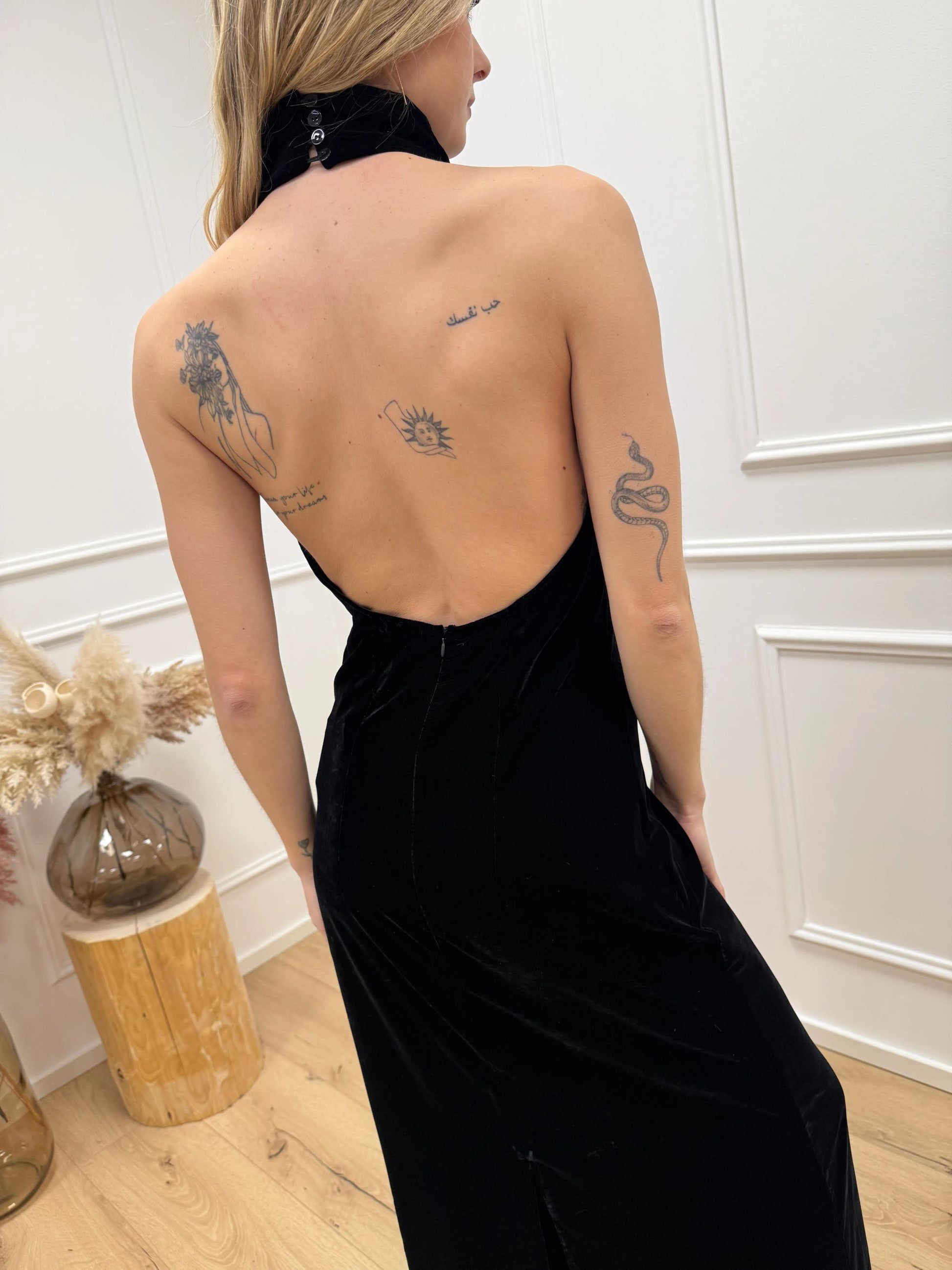 Vestito in velluto color nero Vicolo. Modello lungo scollo america con schiena scoperta. Chiusura con zip sul retro. Spacco sul retro.