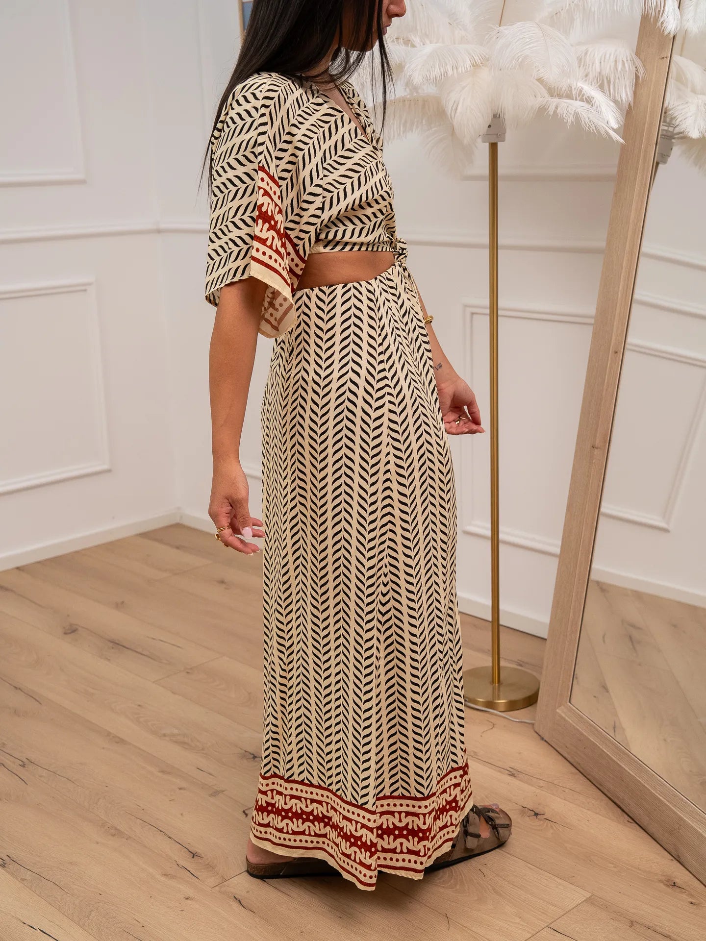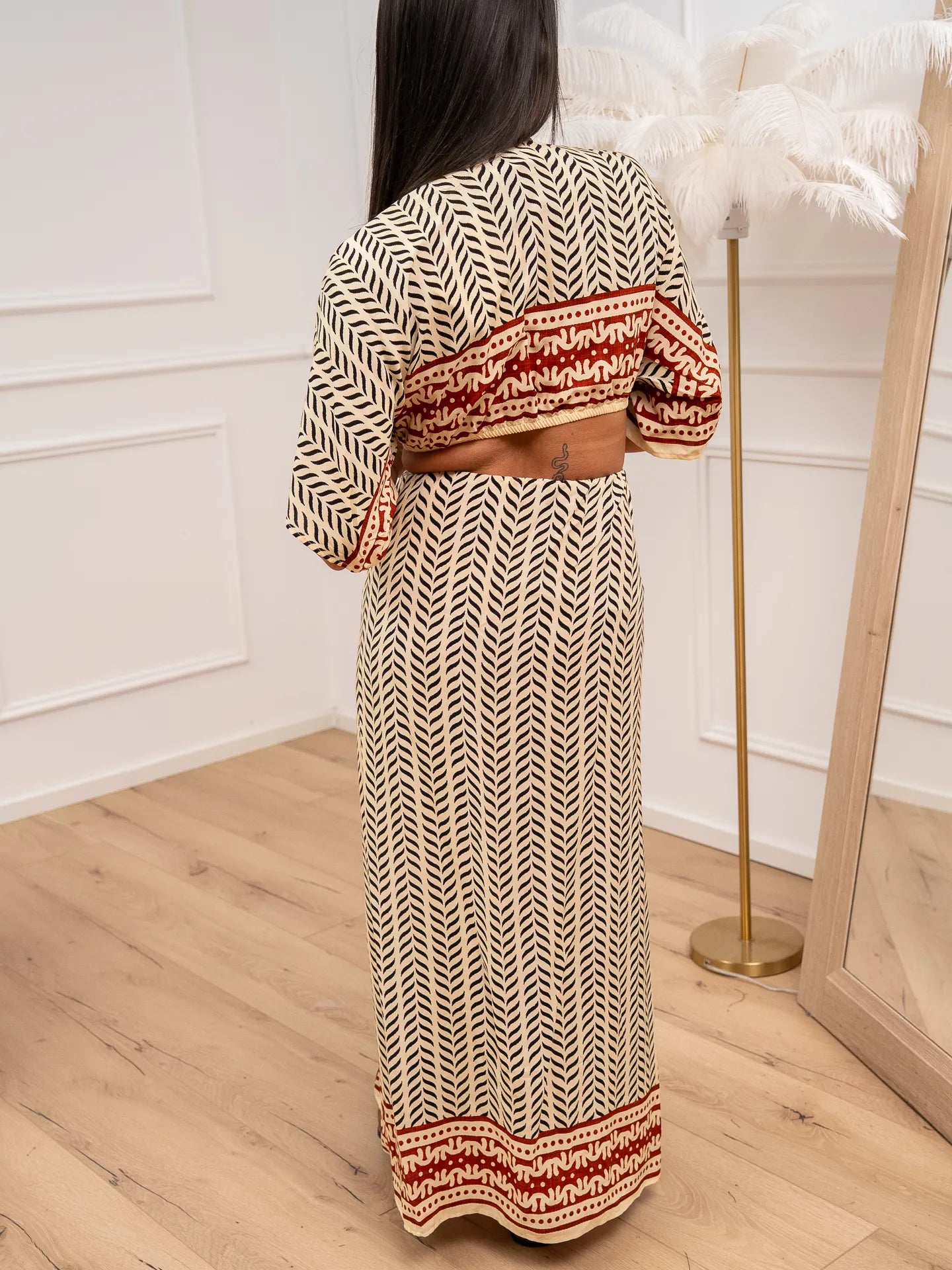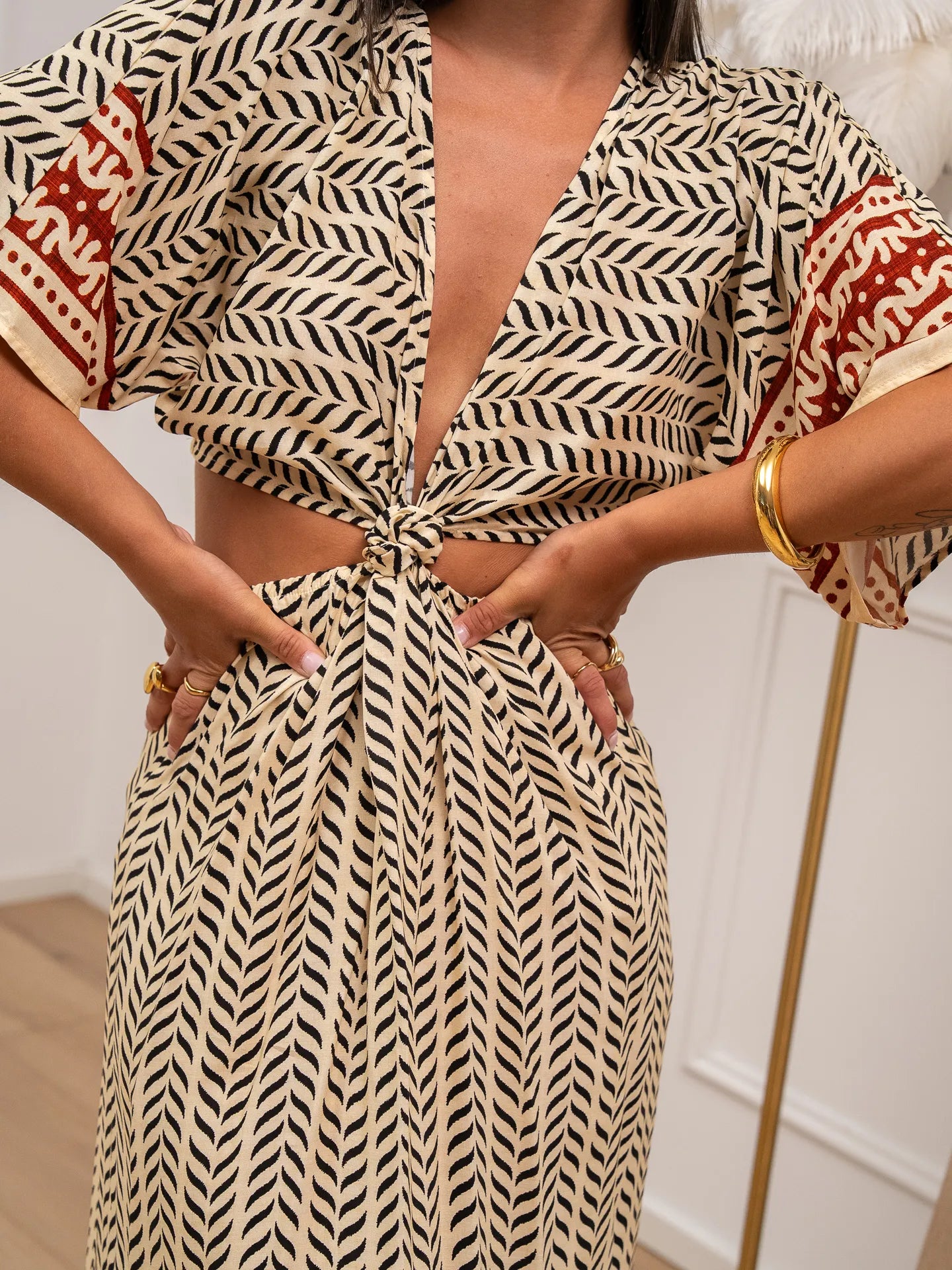 Vestito fantasia Nomad in viscosa HaveOne. Modello stile kimono lungo con scollo a v e nodo frontale. Mezza manica ampia e cut out laterali con elastico sul retro.
