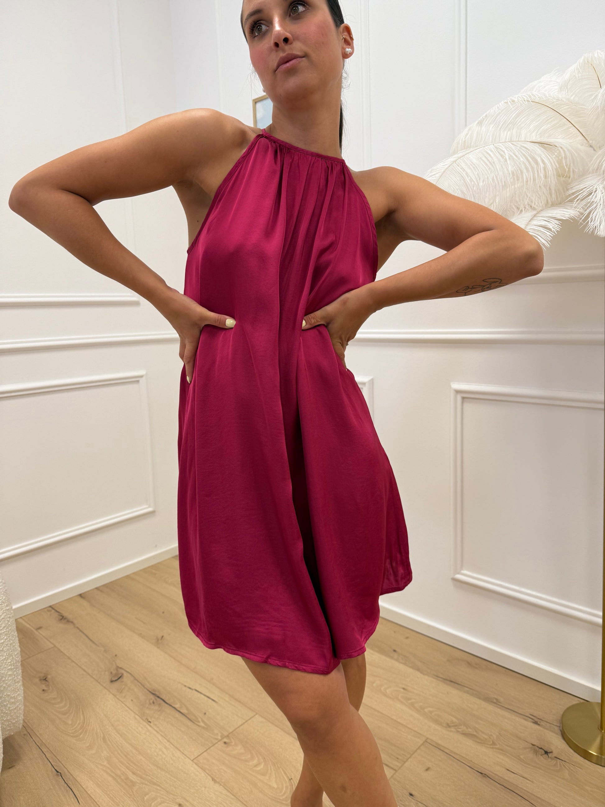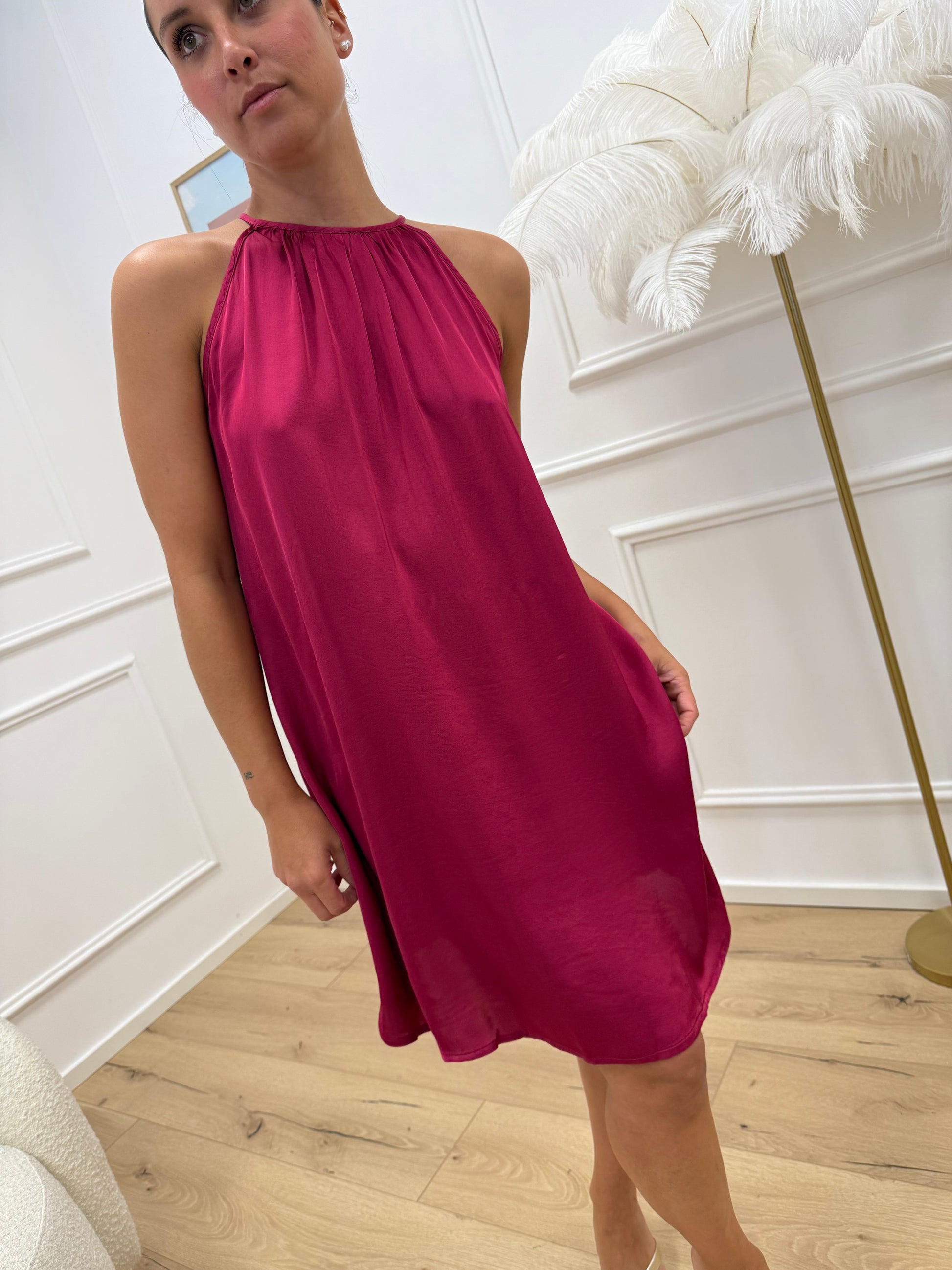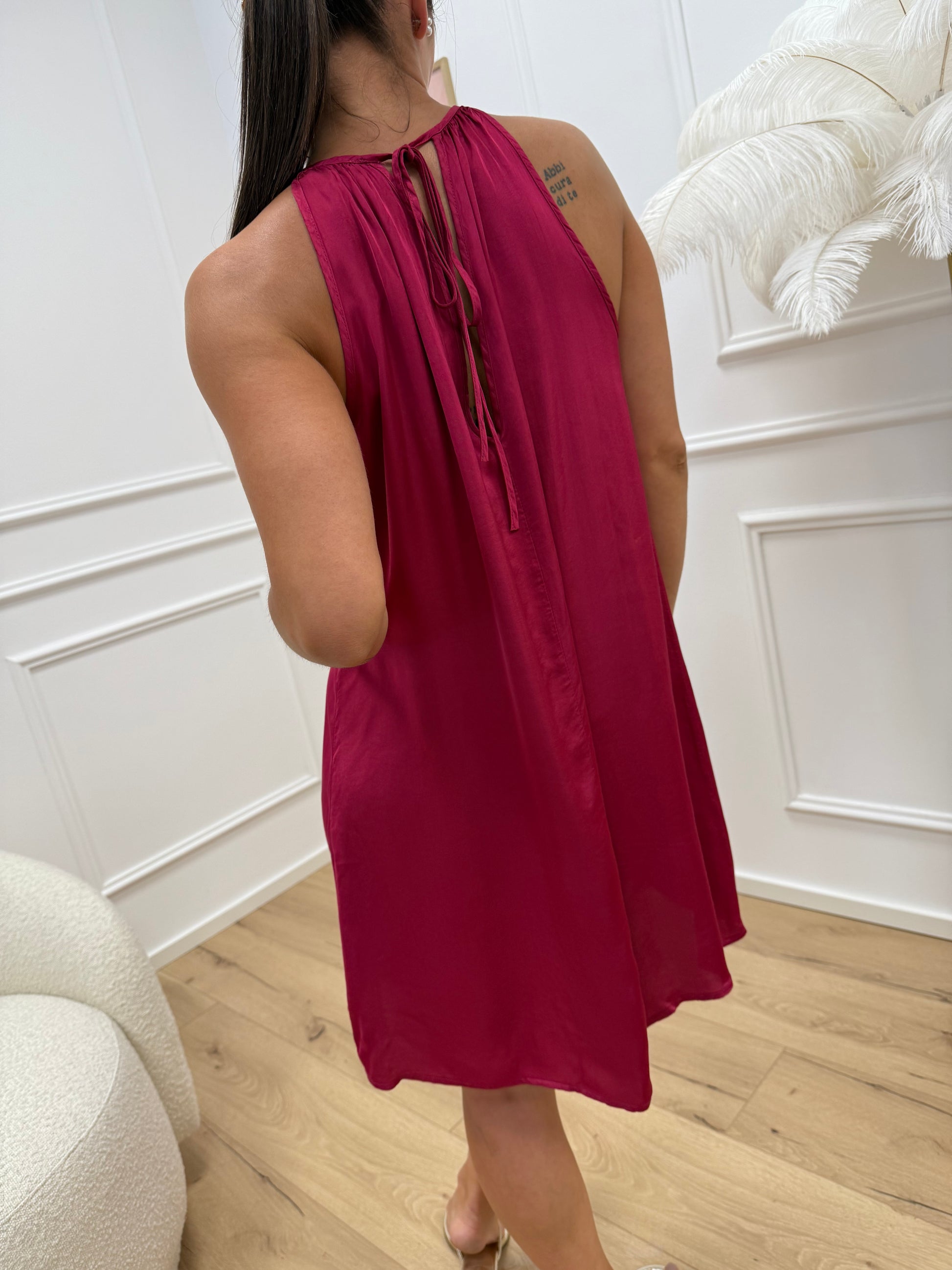 Vestito Lily in viscosa color lampone Vicolo. Modello fit morbido svasato con scollo rotondo e spalline sottili. Laccetti da annodare sul retro.