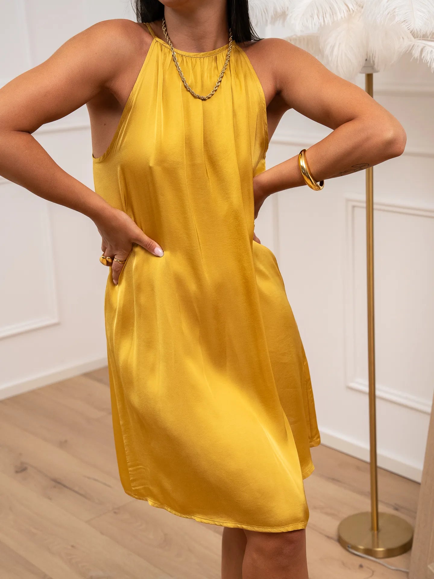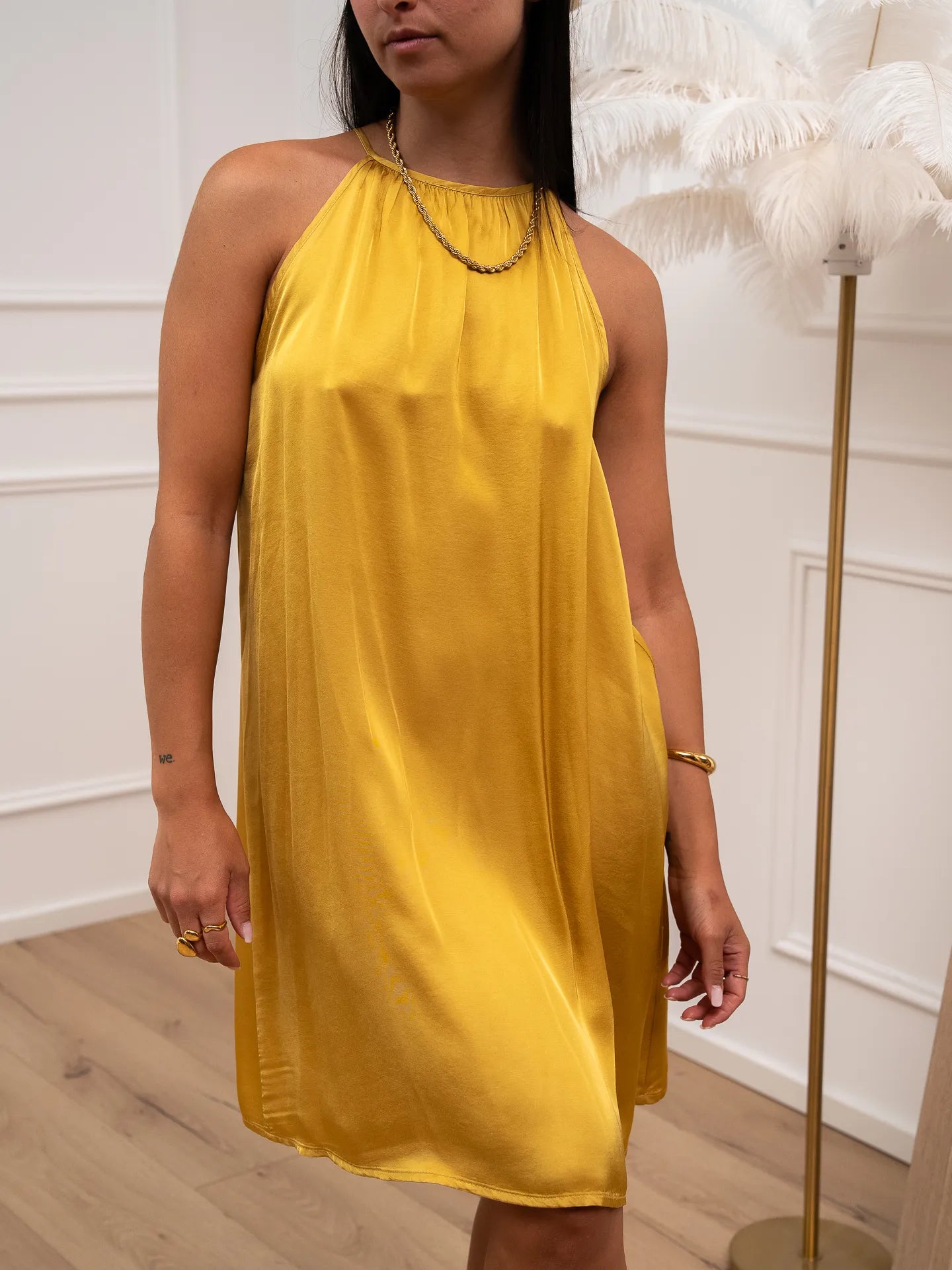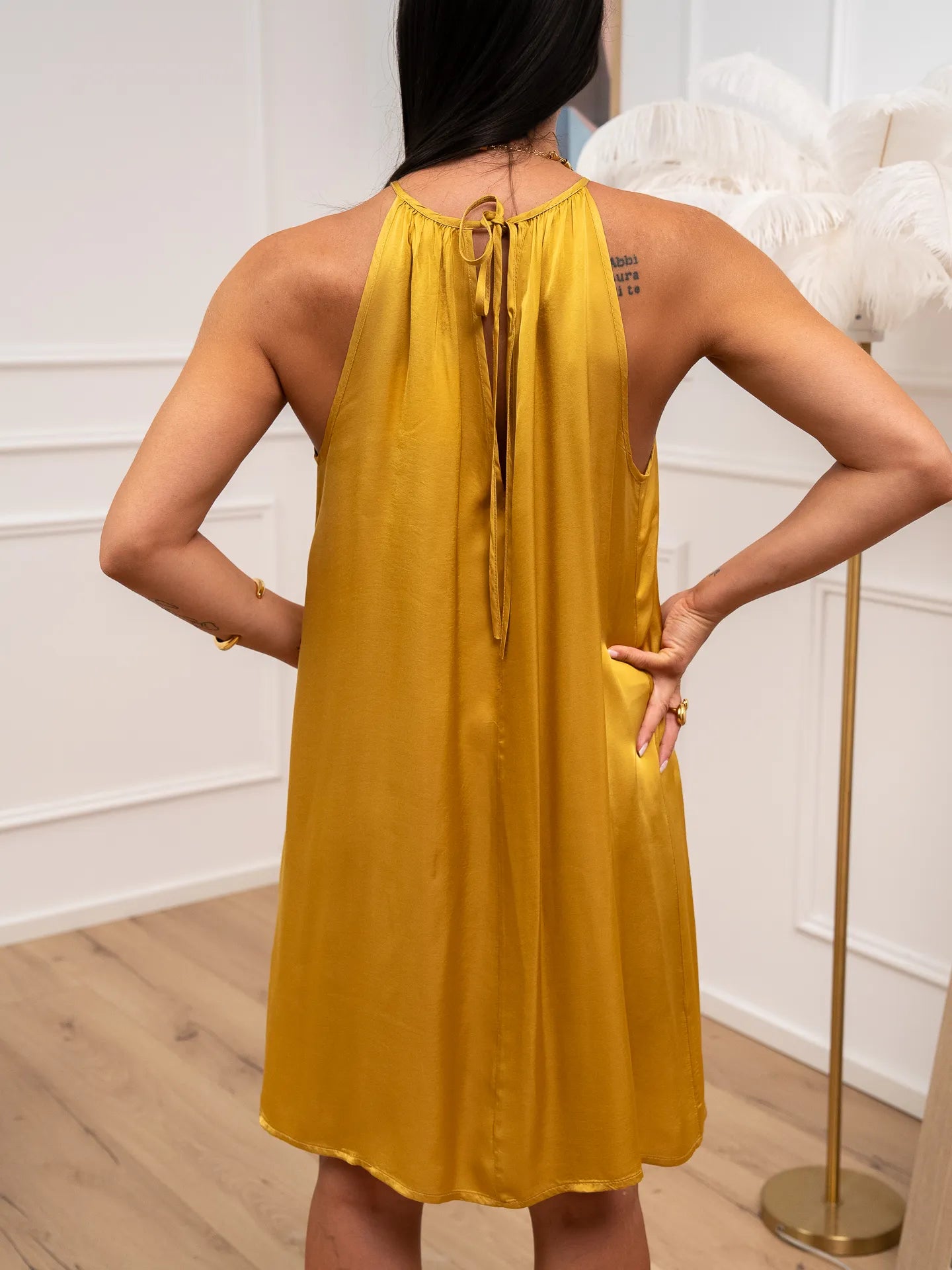 Vestito Lily in viscosa color senape Vicolo. Modello fit morbido svasato con scollo rotondo e spalline sottili. Laccetti da annodare sul retro.