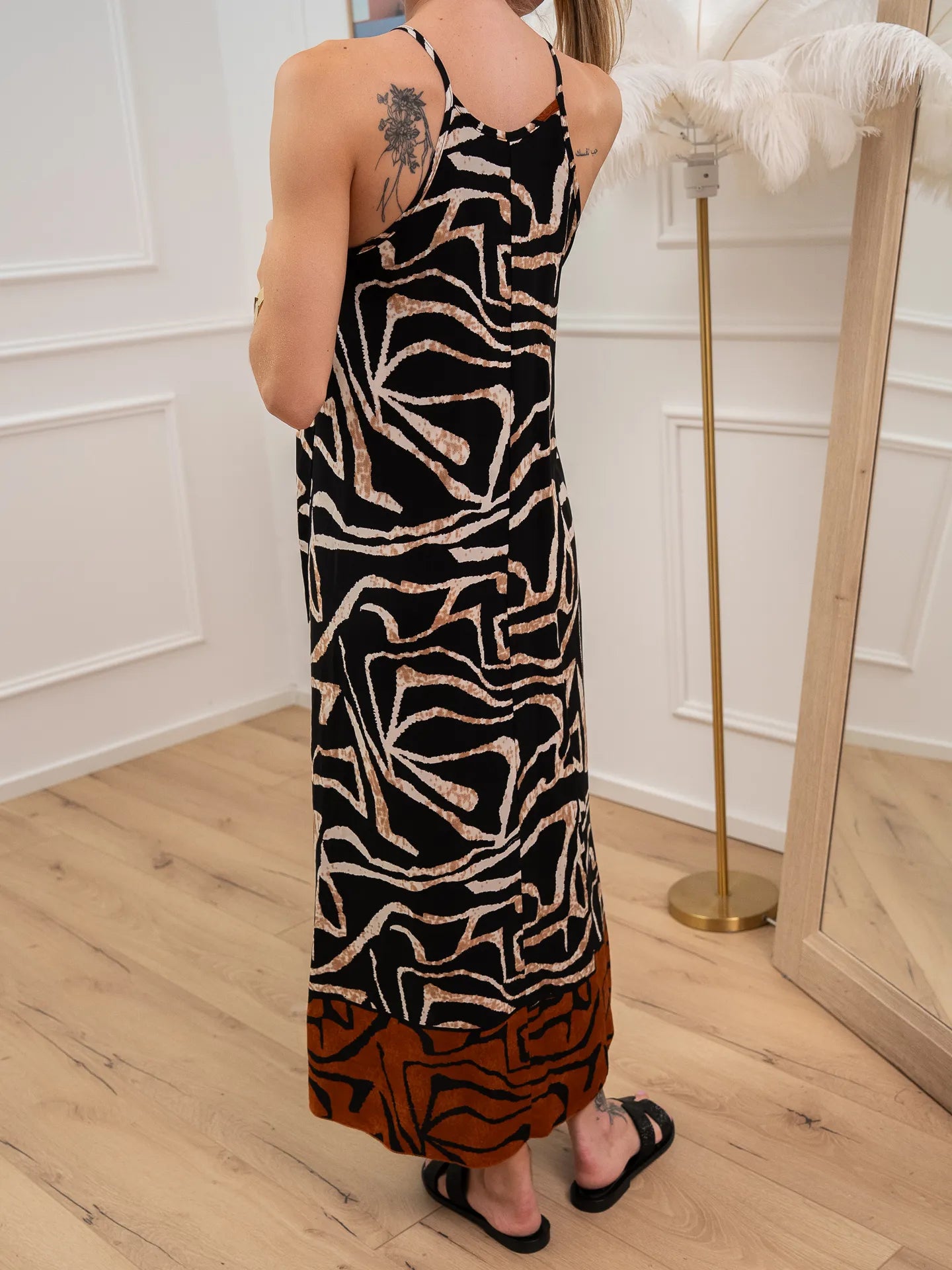 Vestito fantasia Animalier sui toni del bruciato, burro e nero HaveOne. Modello scollo trapezio con spalline sottili