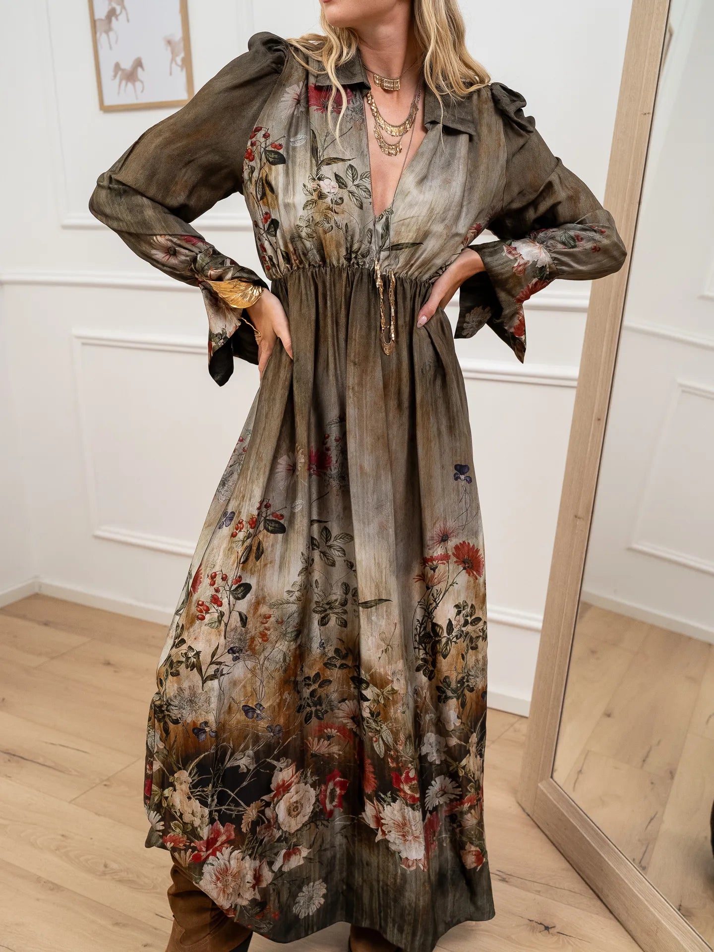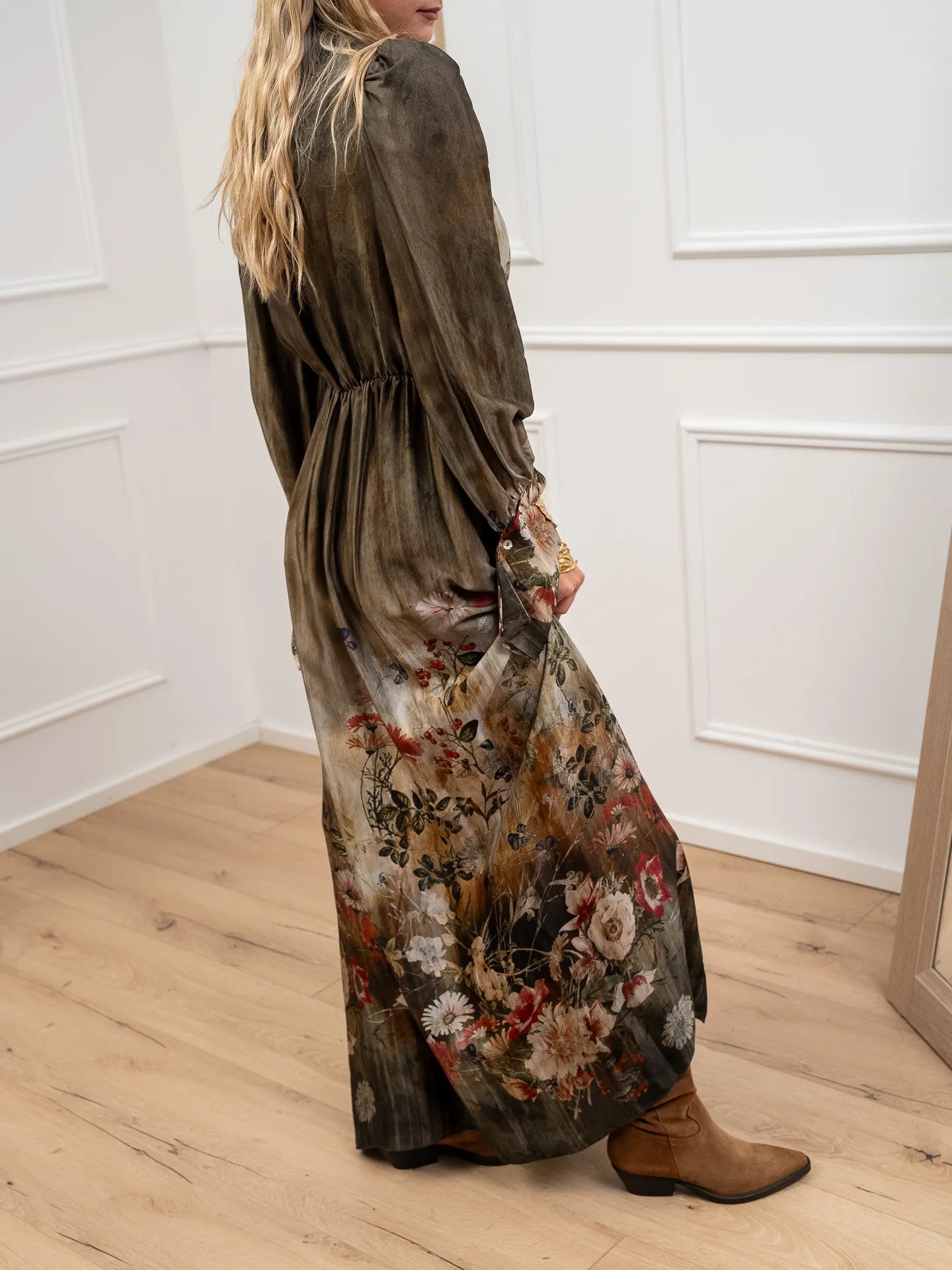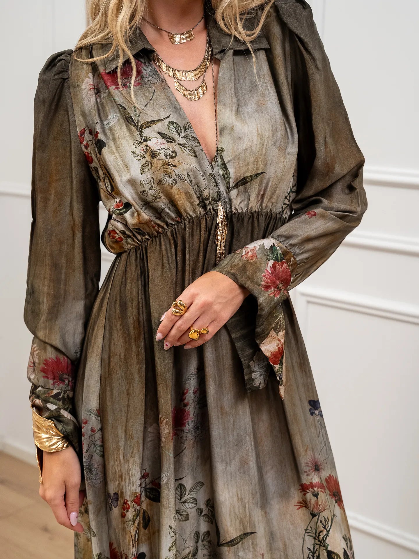 Vestito stampa Botanic fango in viscosa Vicolo. Modello lungo con scollo a v e colletto. Banda elastica sotto al seno. Maniche lunghe con maxi polsino. Gonna morbida.