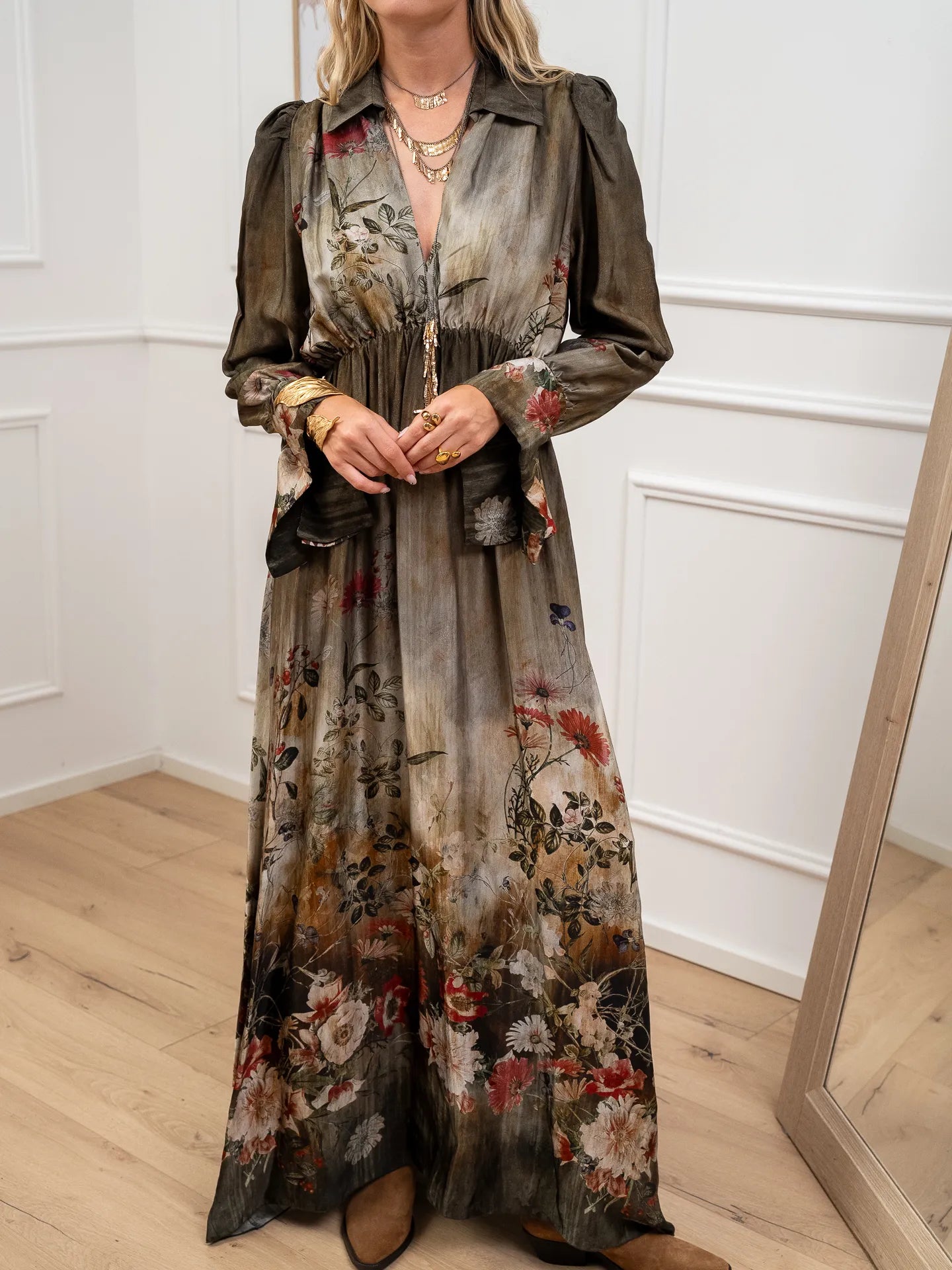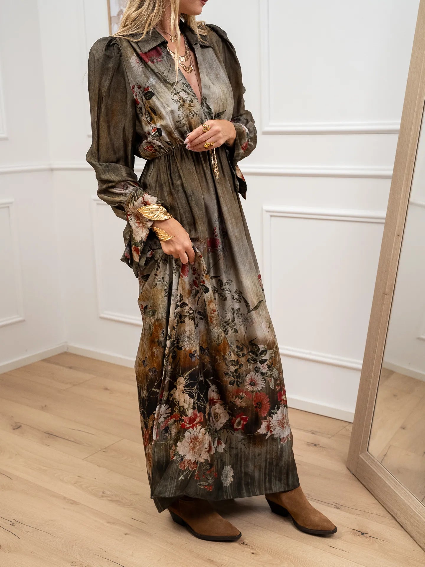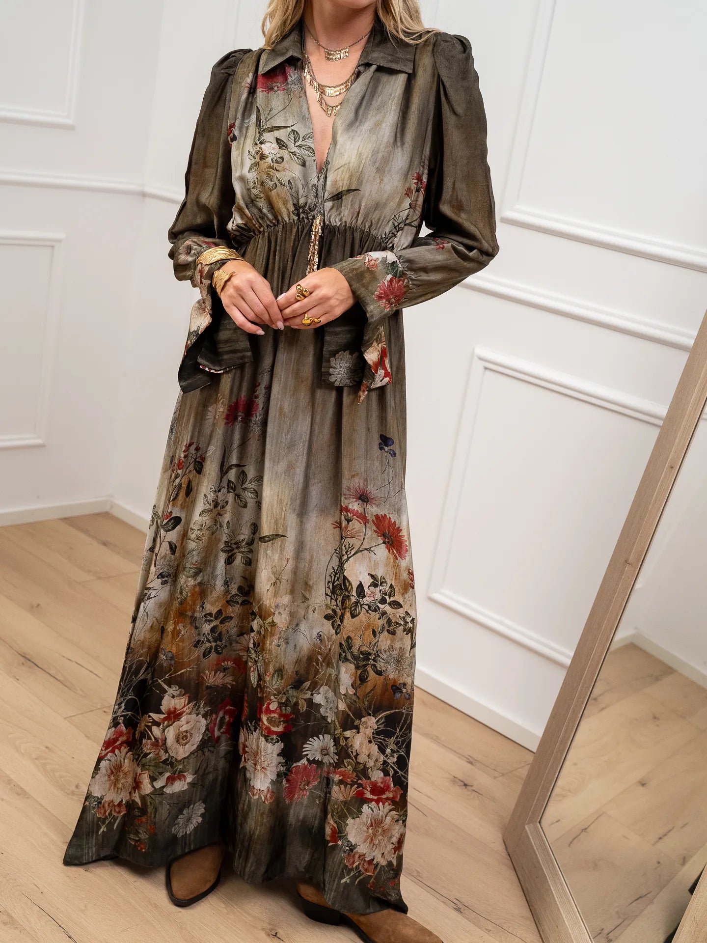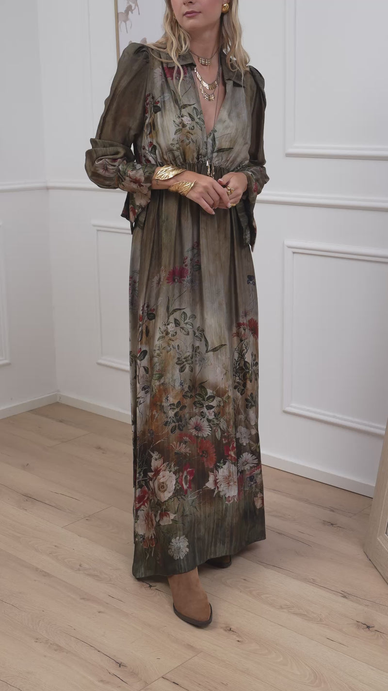 Vestito stampa Botanic fango in viscosa Vicolo. Modello lungo con scollo a v e colletto. Banda elastica sotto al seno. Maniche lunghe con maxi polsino. Gonna morbida.