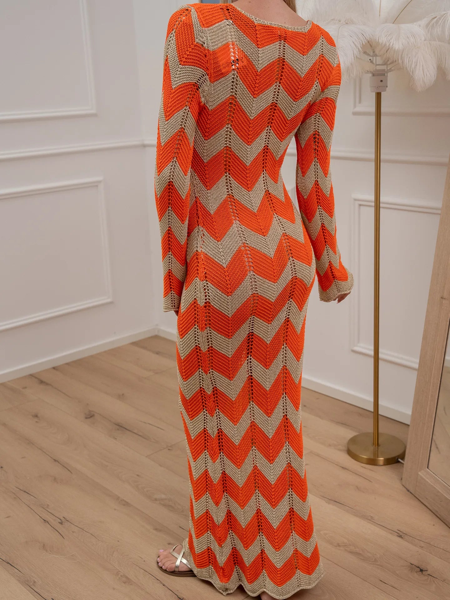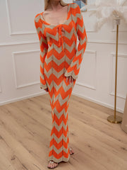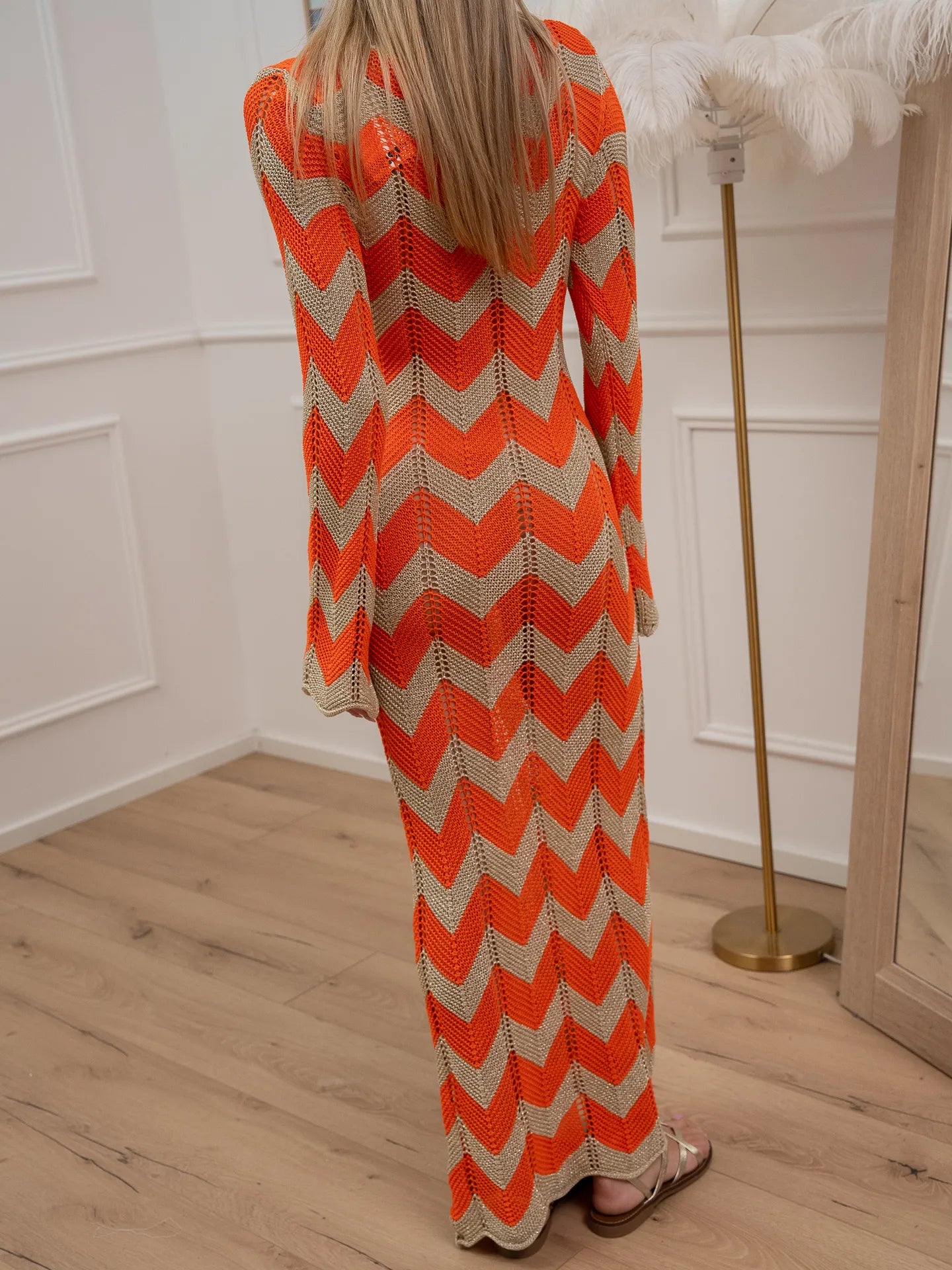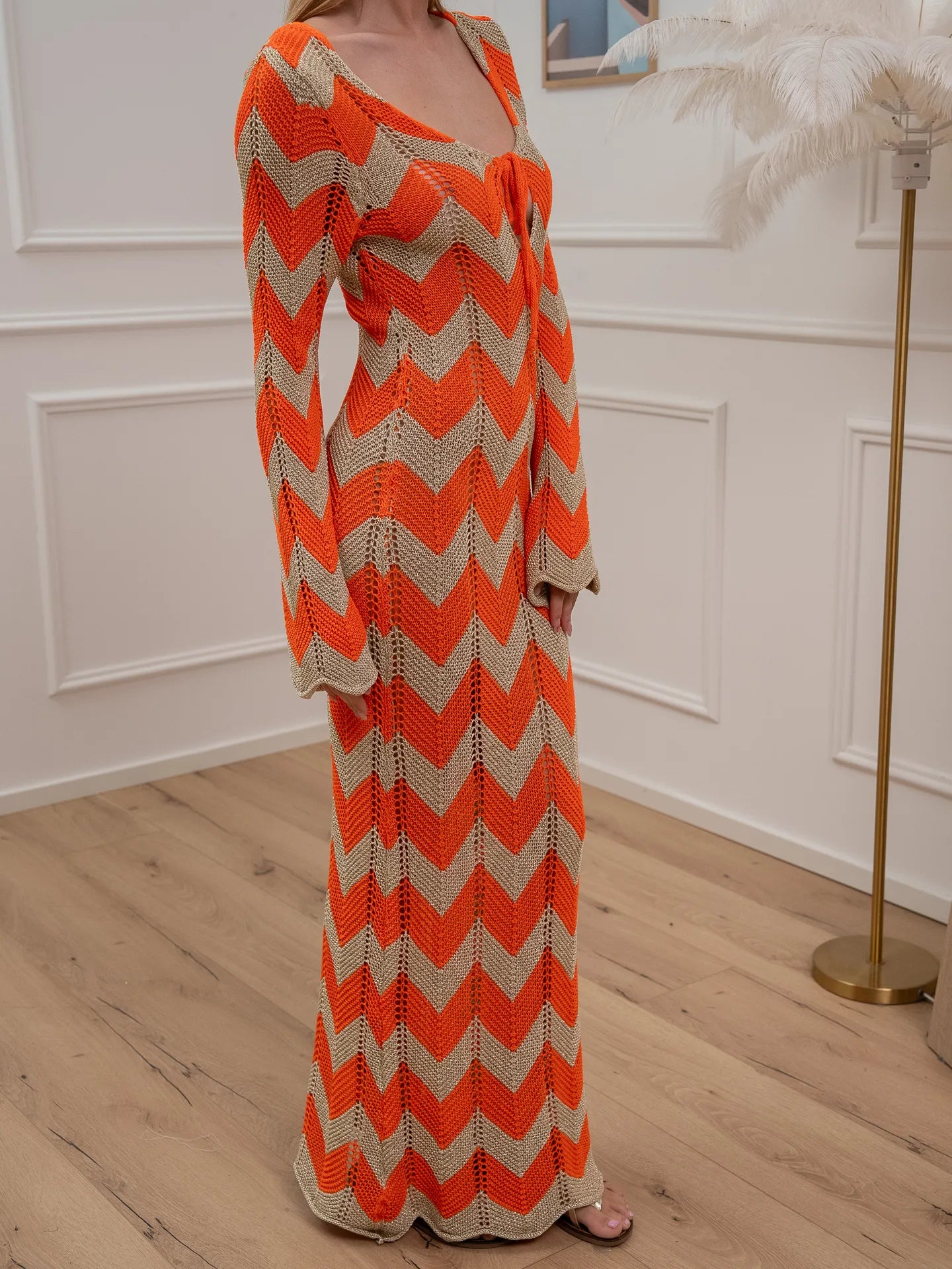 Vestito lungo crochet sui toni arancio e oro Crispy. Modello lungo con scollo a v profondo e laccetti da annodare davanti. Fit dritto aderente leggermente svasato sul fondo.