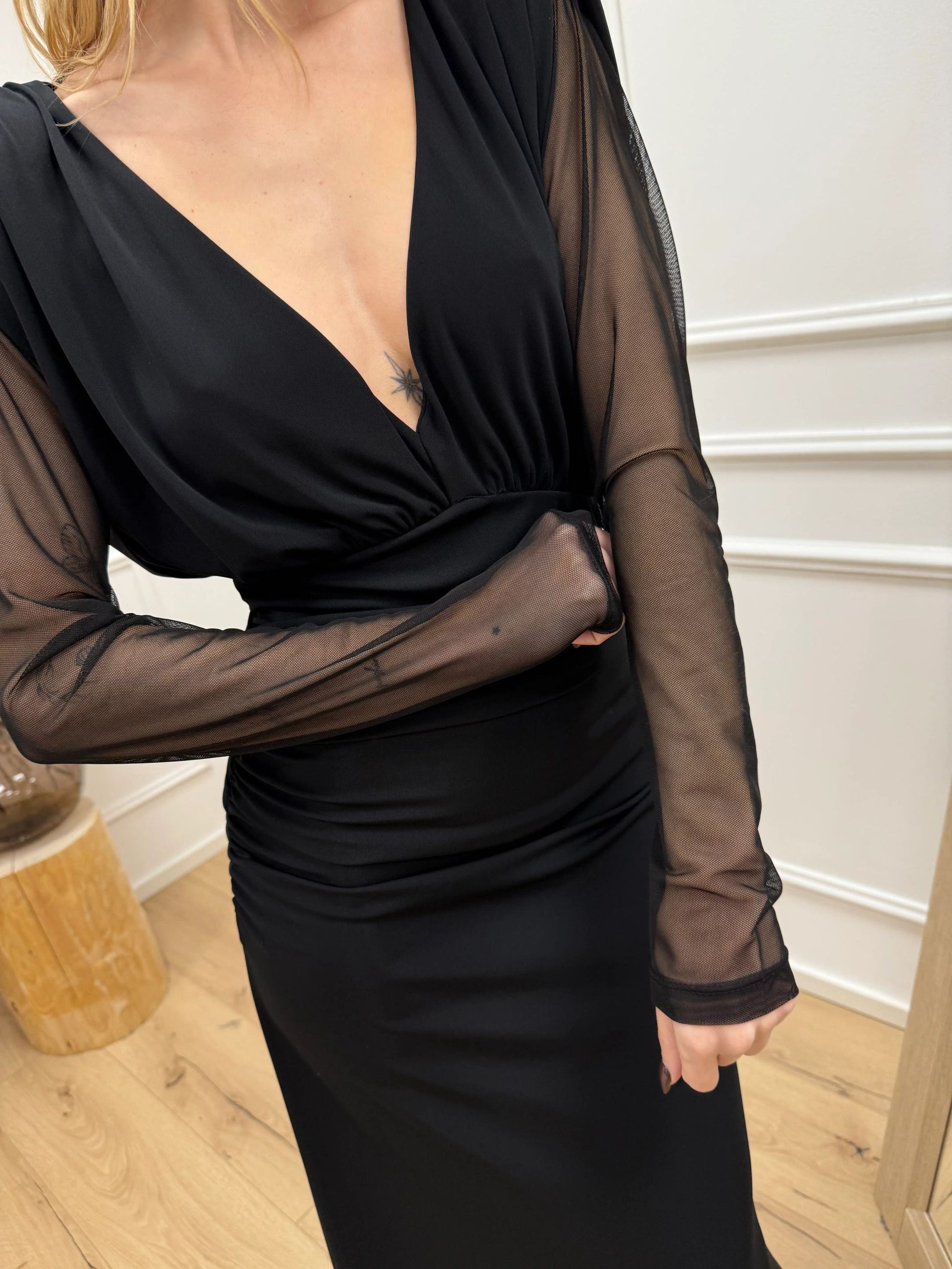 Vestito lungo nero con maniche in tulle - HaveOne