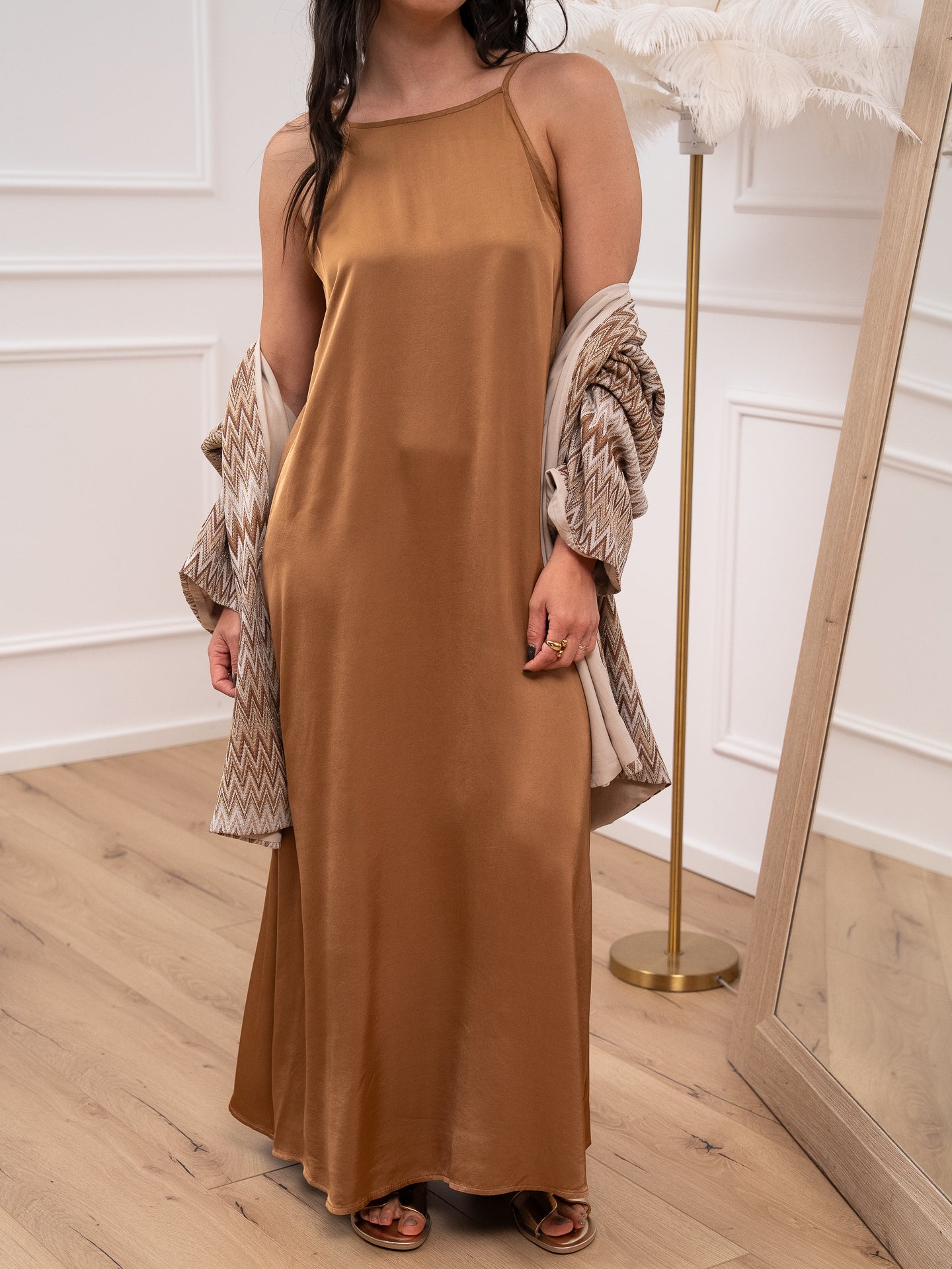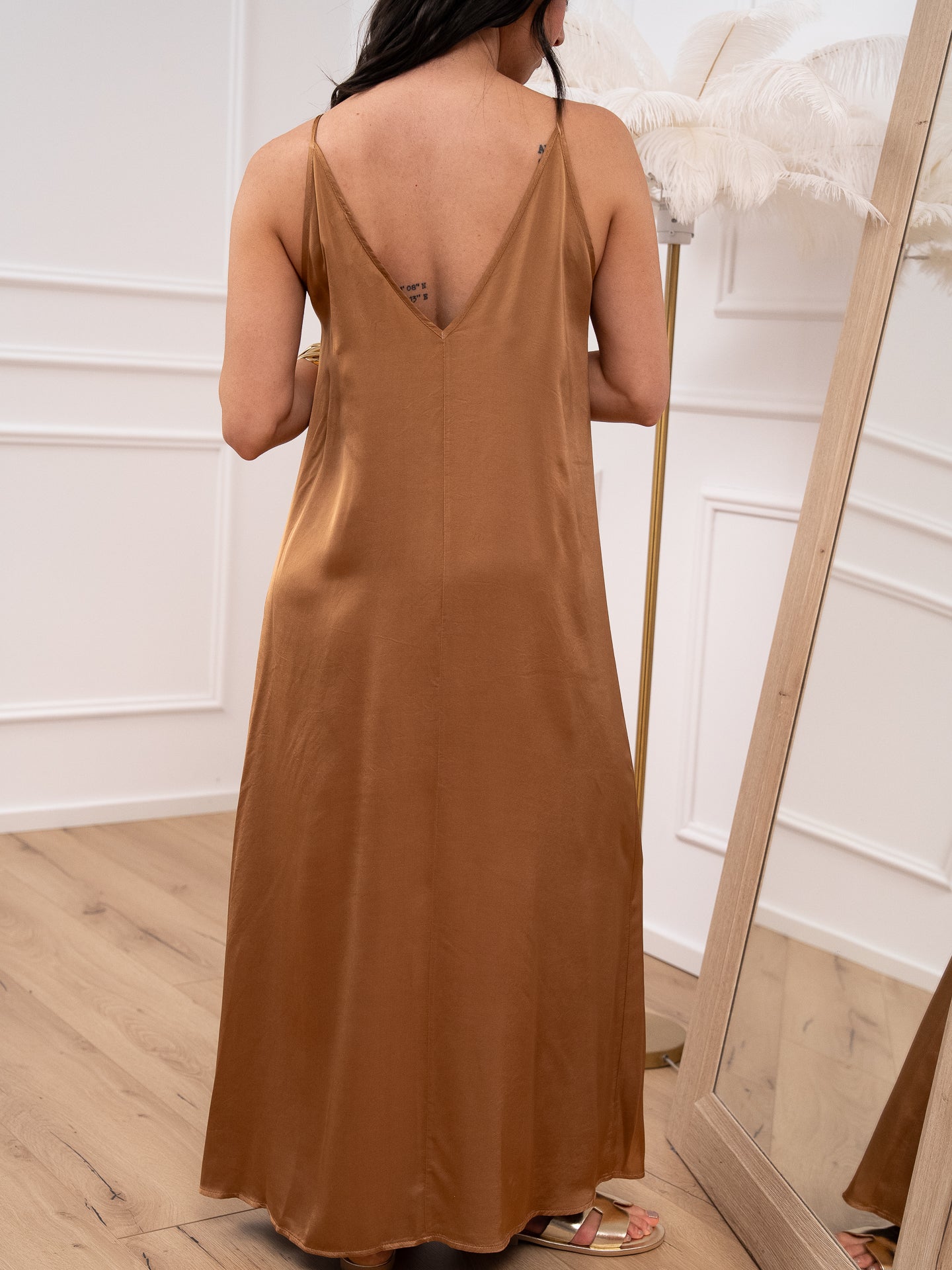 Vestito color terra in viscosa HaveOne. Modello lungo scollo trapezio frontale con spallini sottili e scollo a v sul retro.