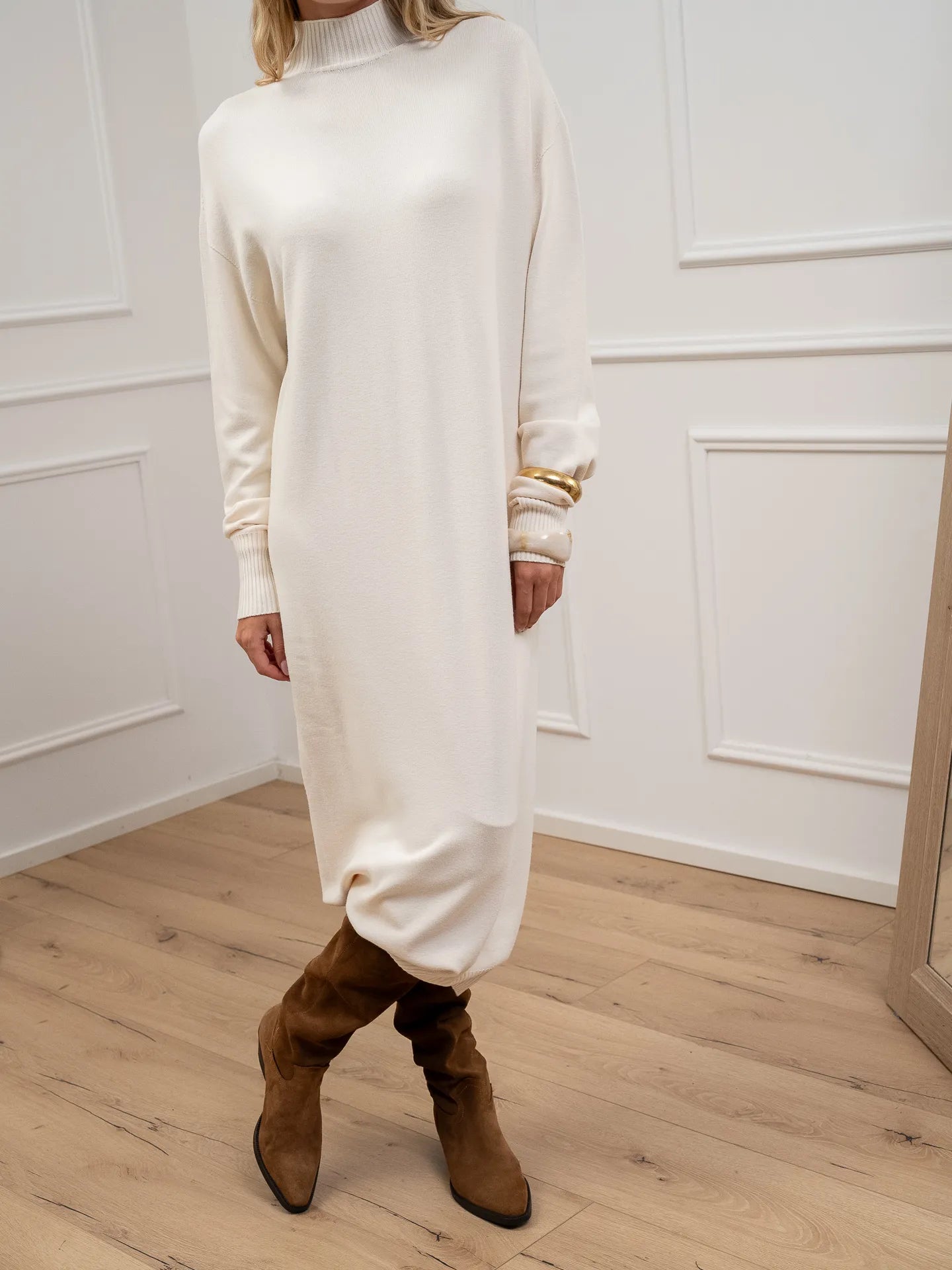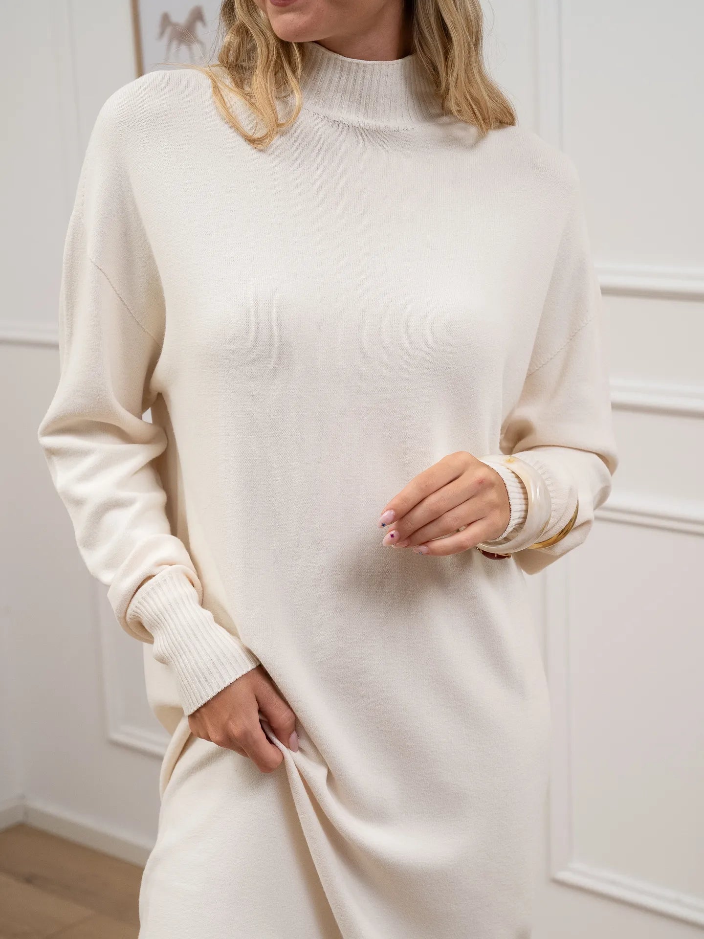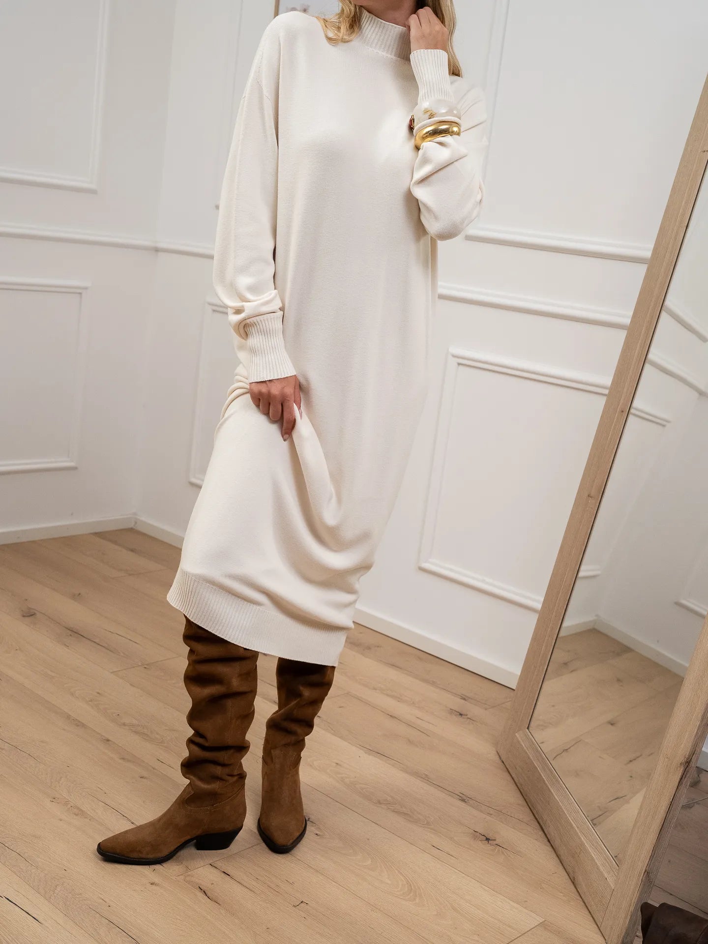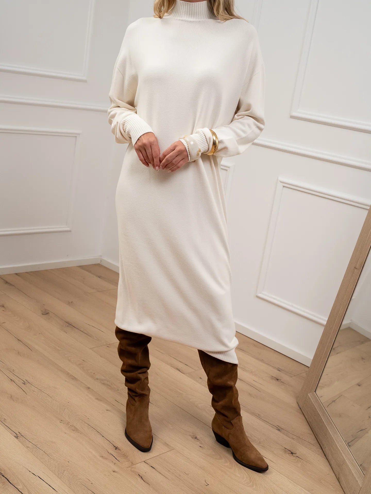 Vestito color avorio in viscosa Kontatto. Modello lupetto a mezzo collo, fit morbido e maniche lunghe. Finiture a costine.