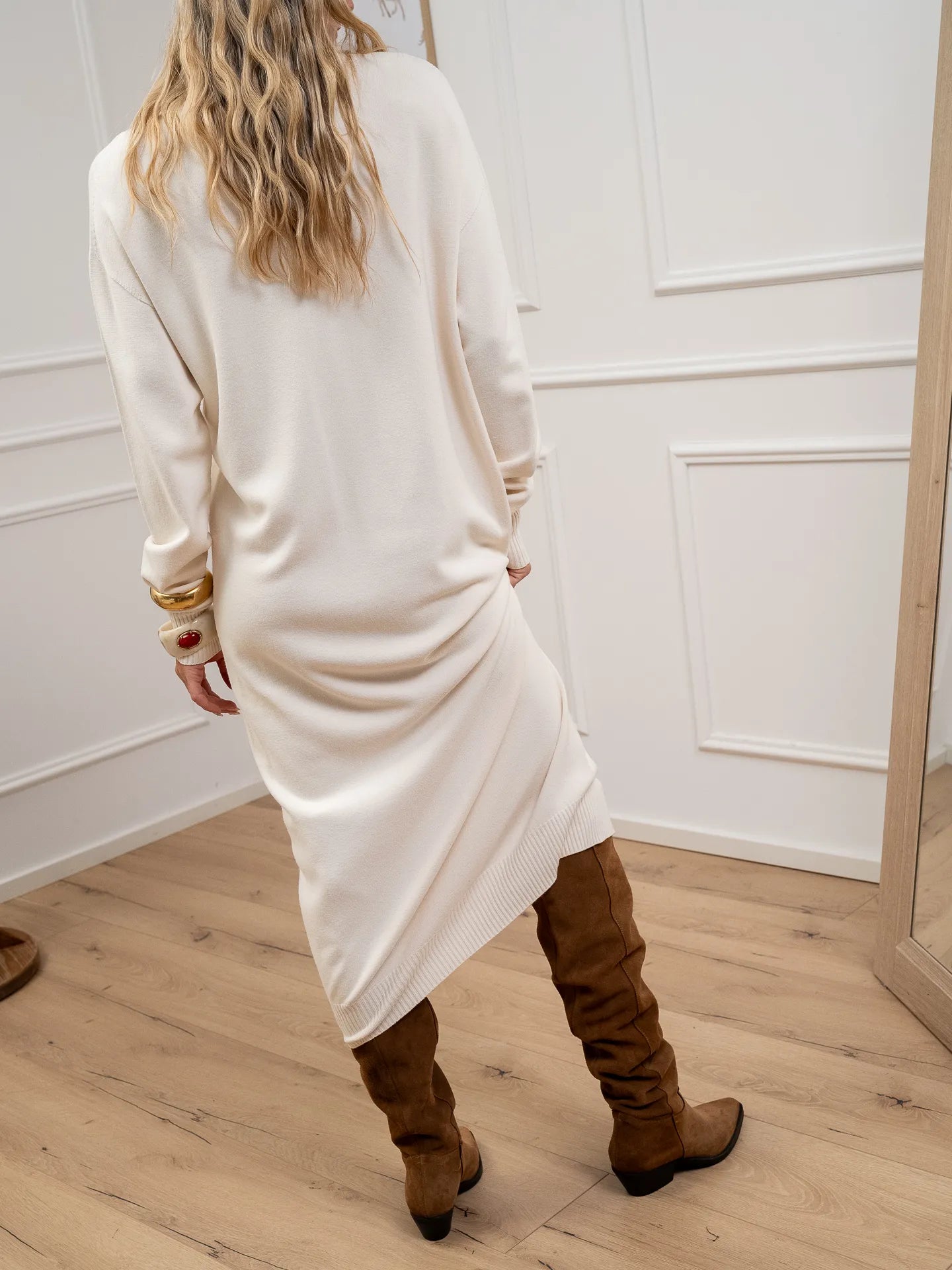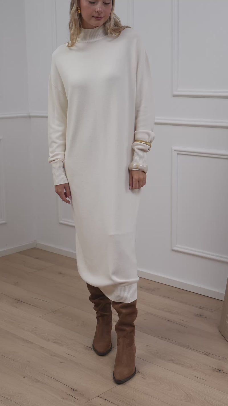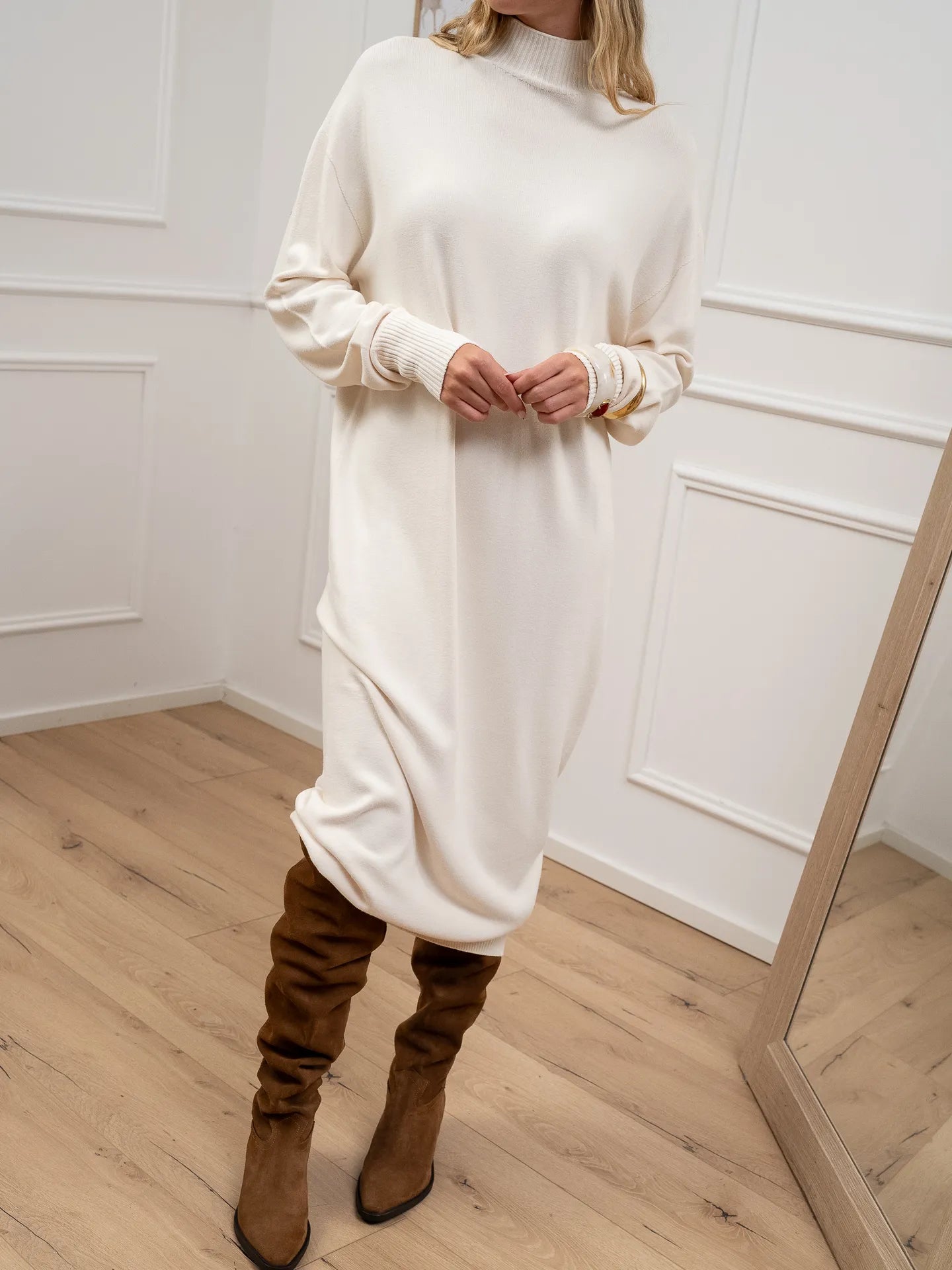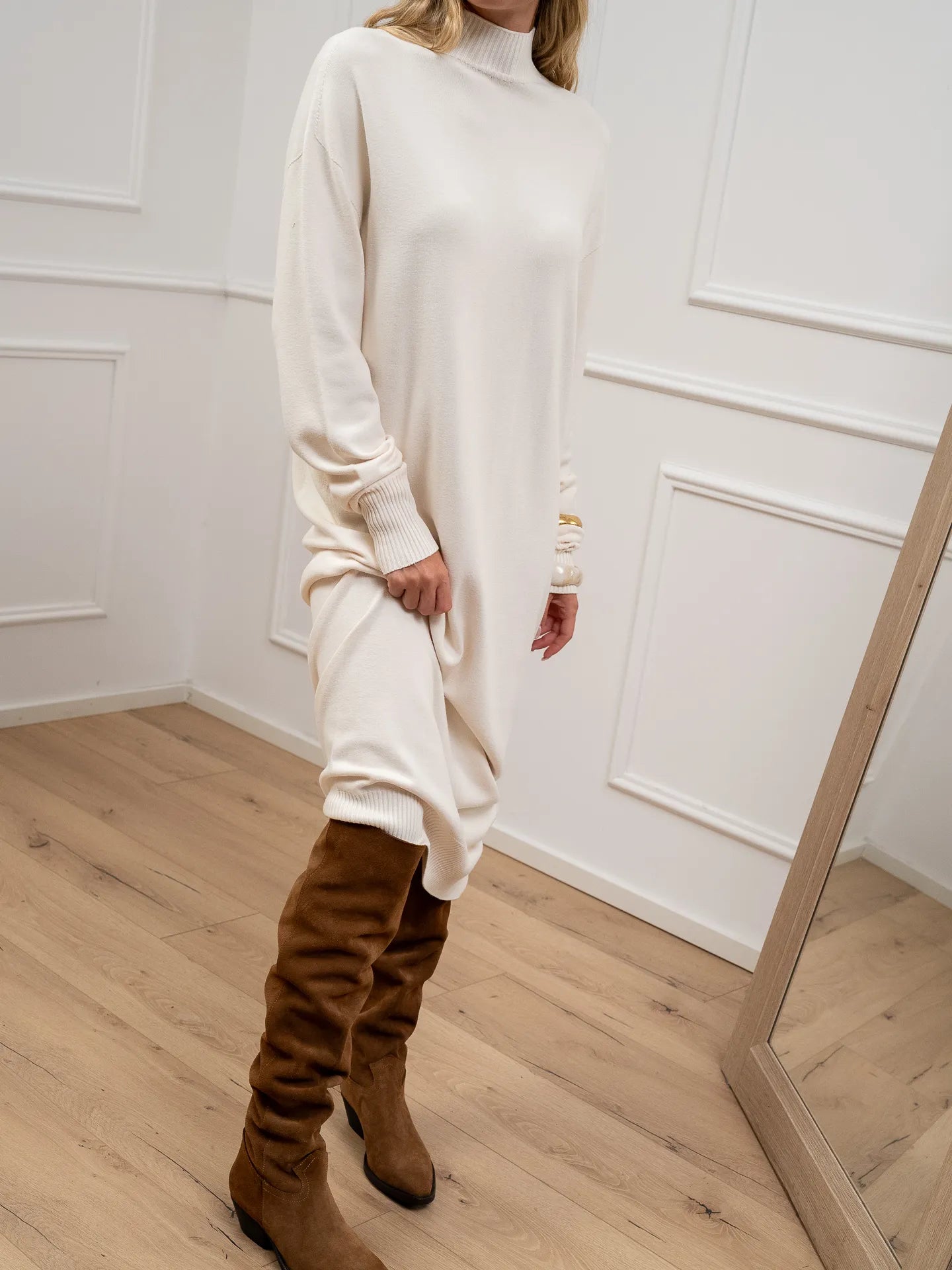 Vestito color avorio in viscosa Kontatto. Modello lupetto a mezzo collo, fit morbido e maniche lunghe. Finiture a costine.