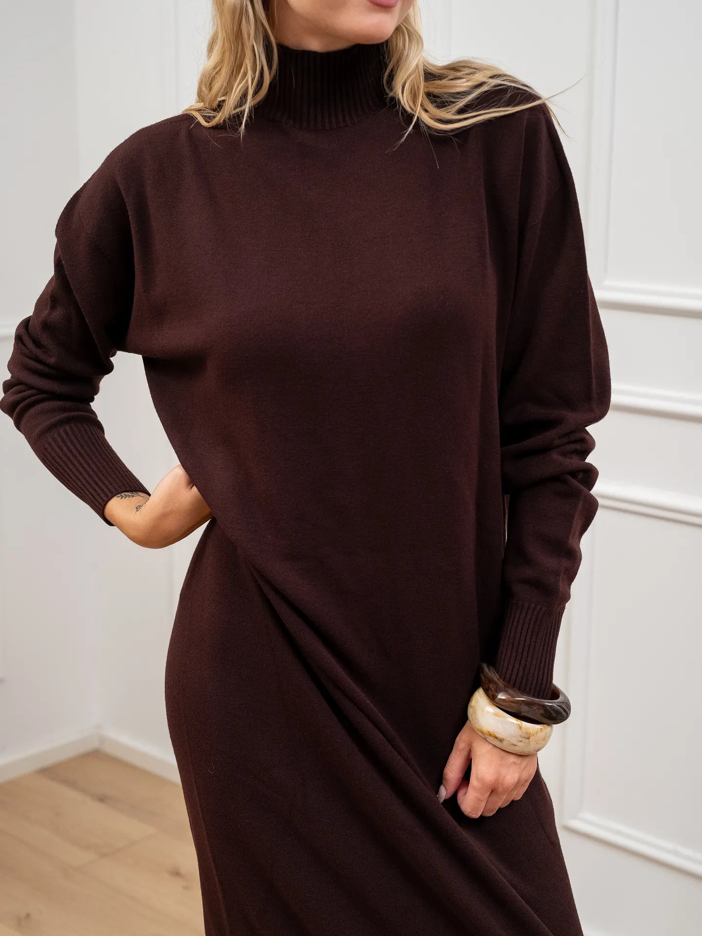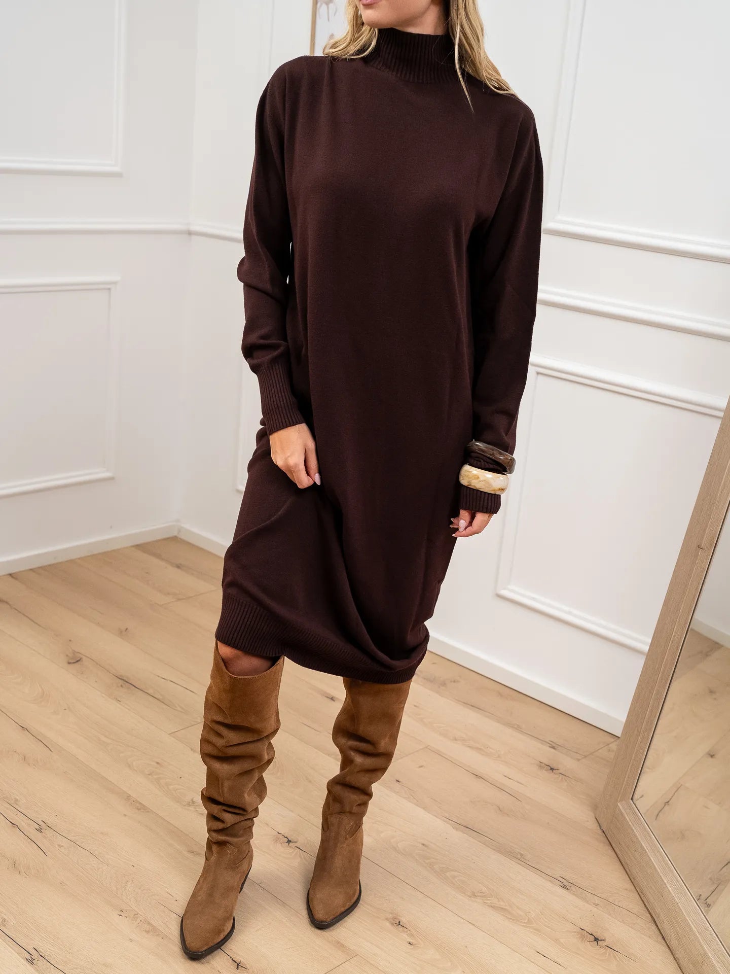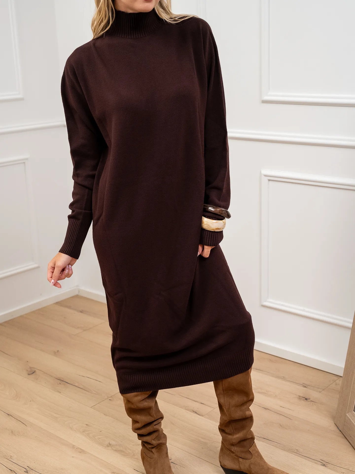Vestito color mogano in viscosa Kontatto. Modello lupetto a mezzo collo, fit morbido e maniche lunghe. Finiture a costine.