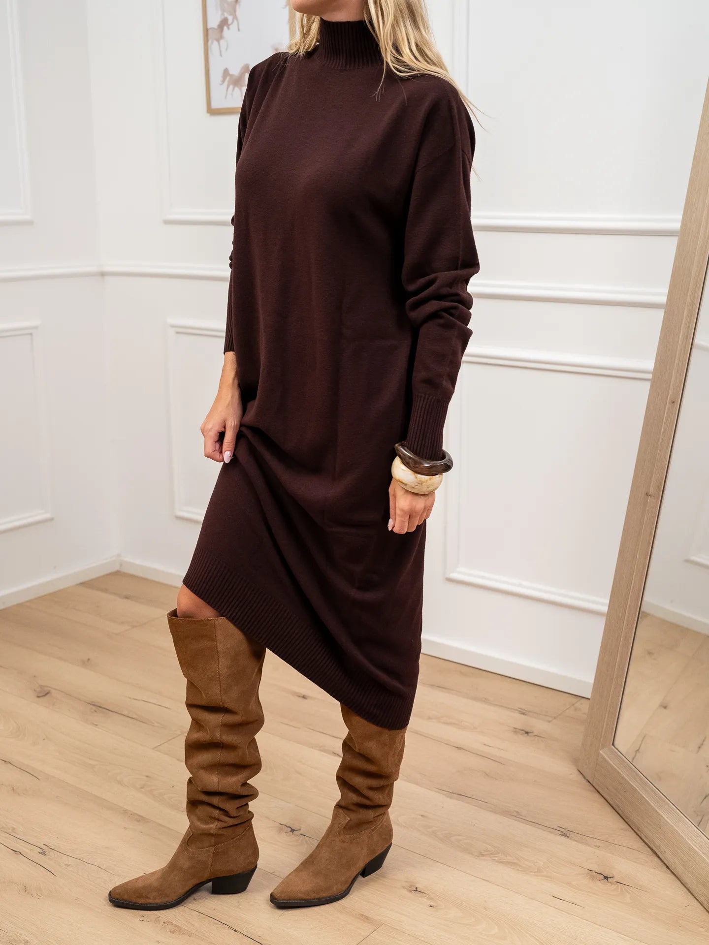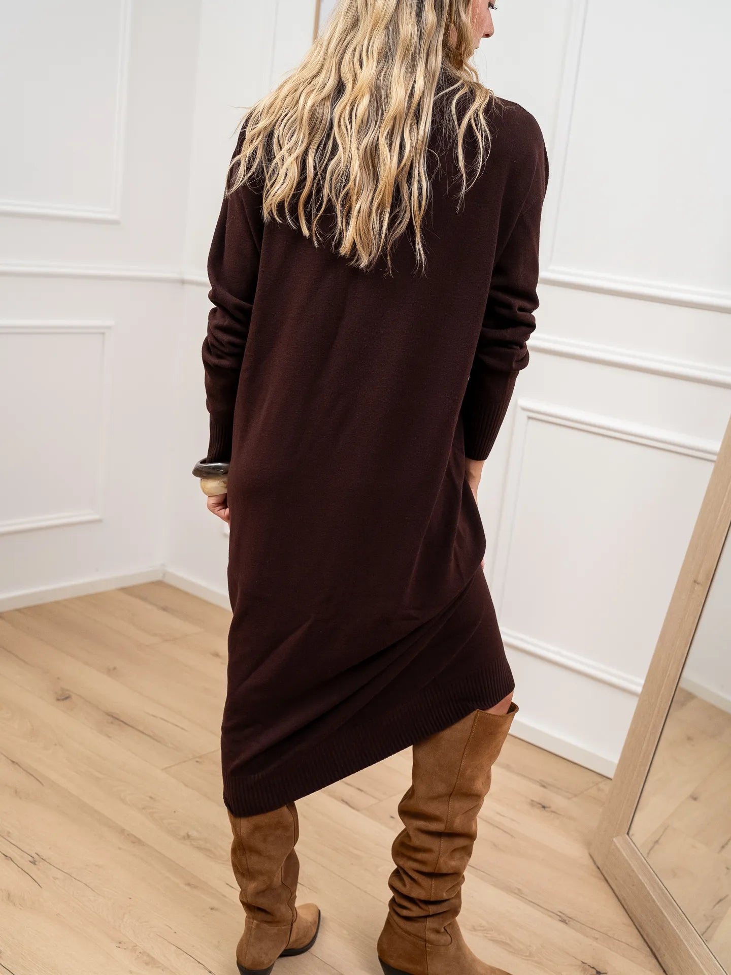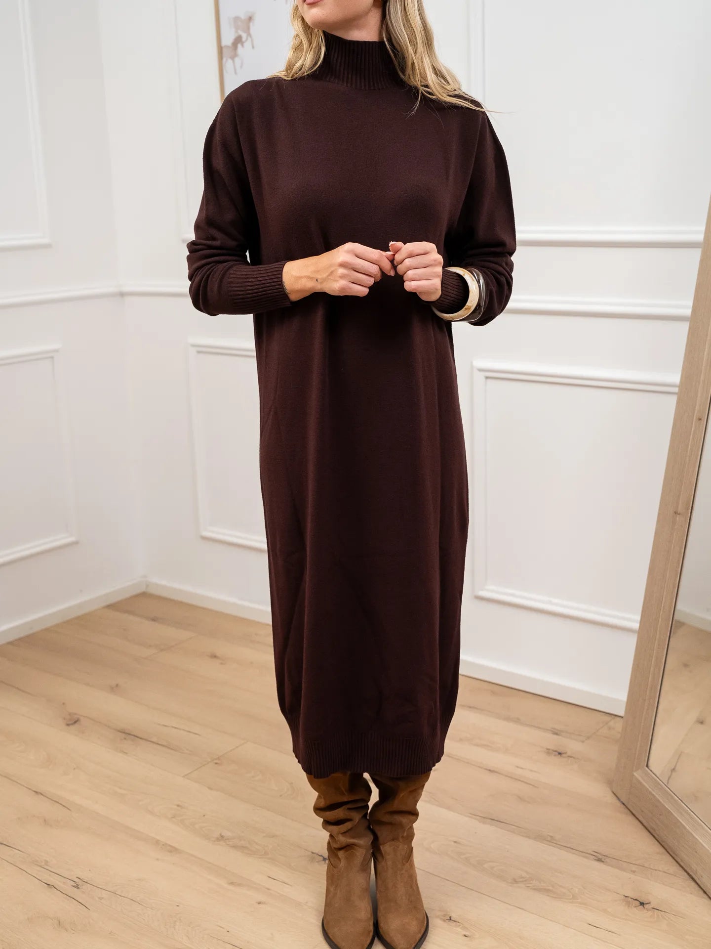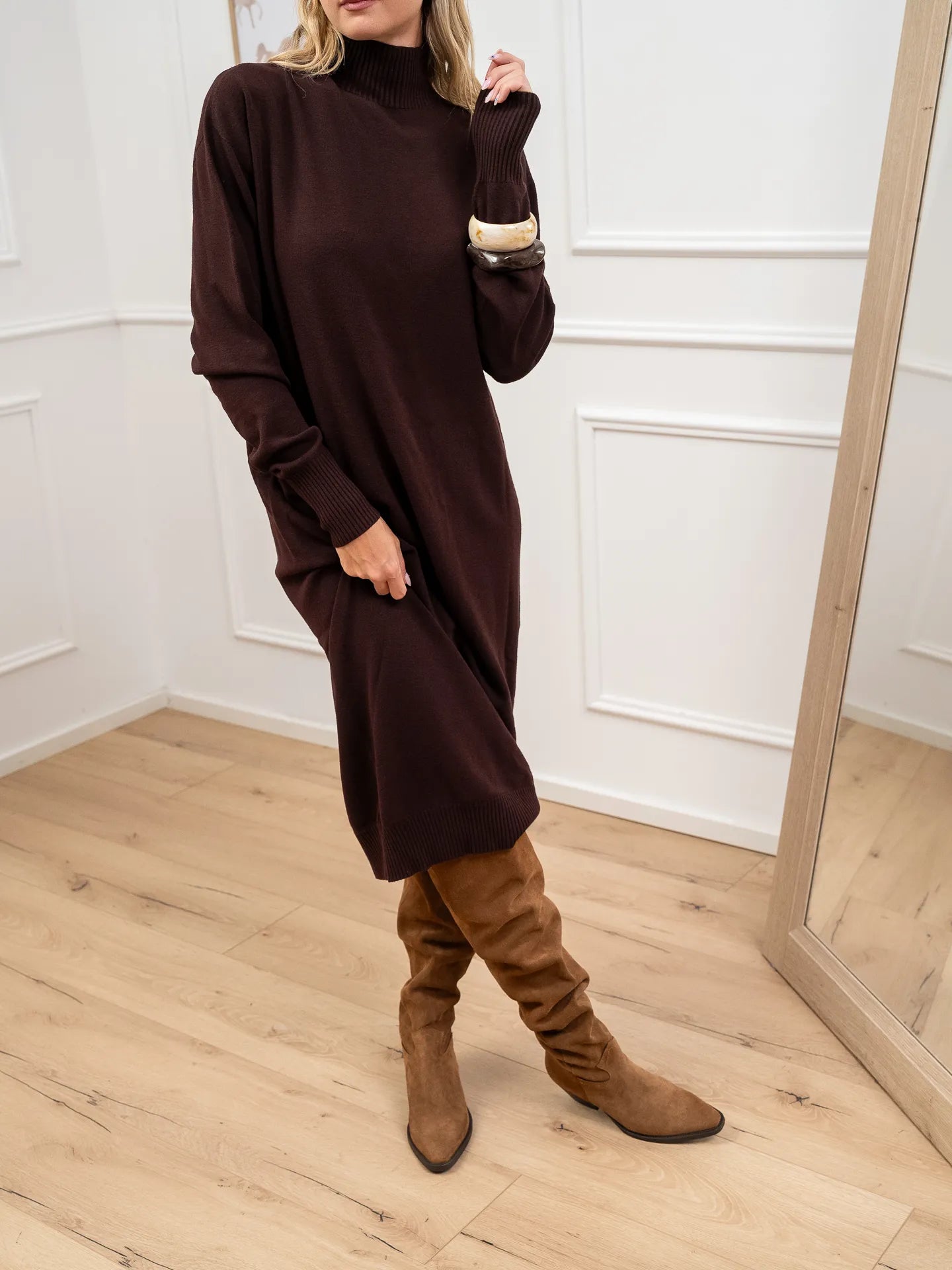 Vestito color mogano in viscosa Kontatto. Modello lupetto a mezzo collo, fit morbido e maniche lunghe. Finiture a costine.