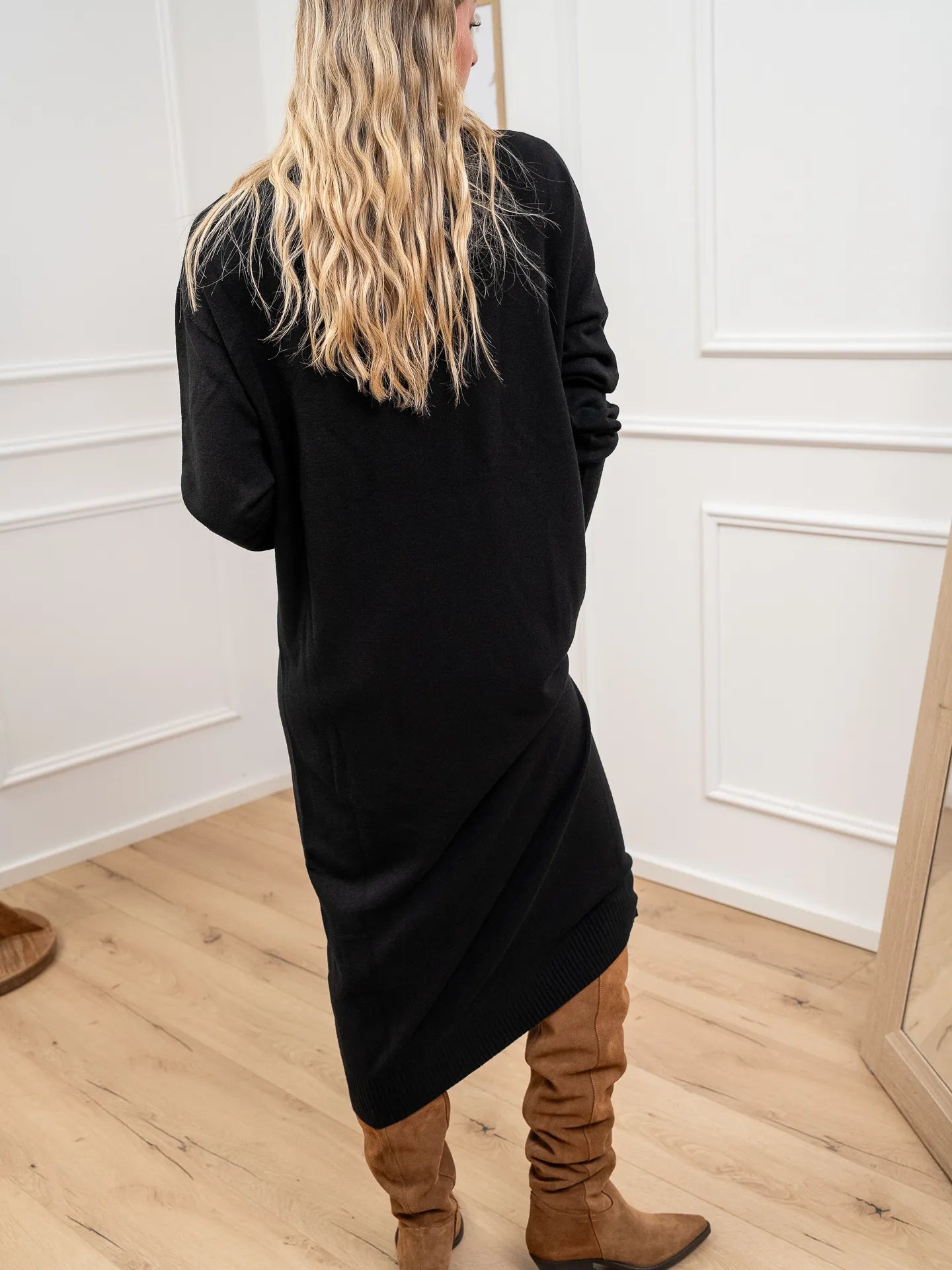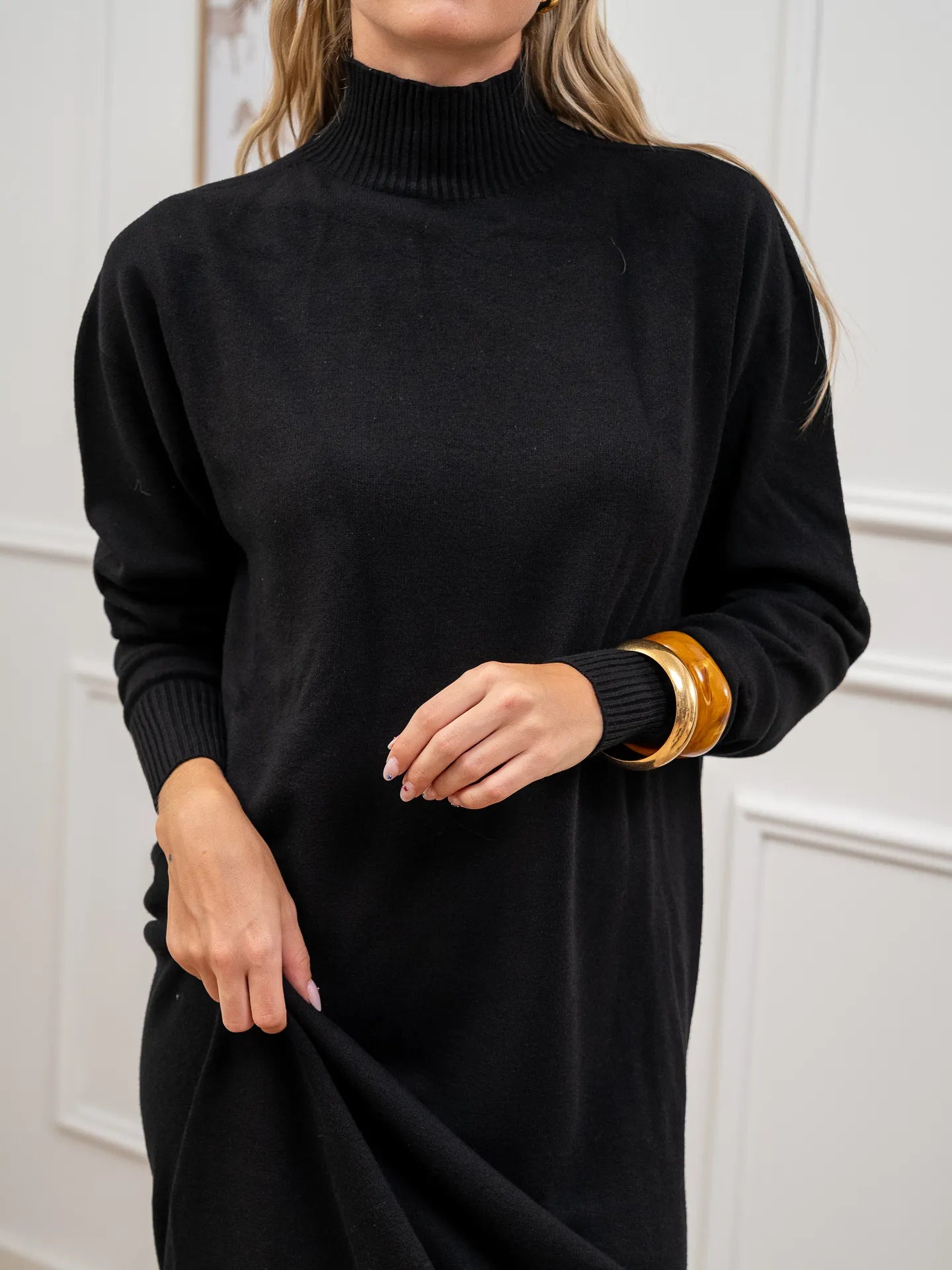 Vestito color nero in viscosa Kontatto. Modello lupetto a mezzo collo, fit morbido e maniche lunghe. Finiture a costine.
