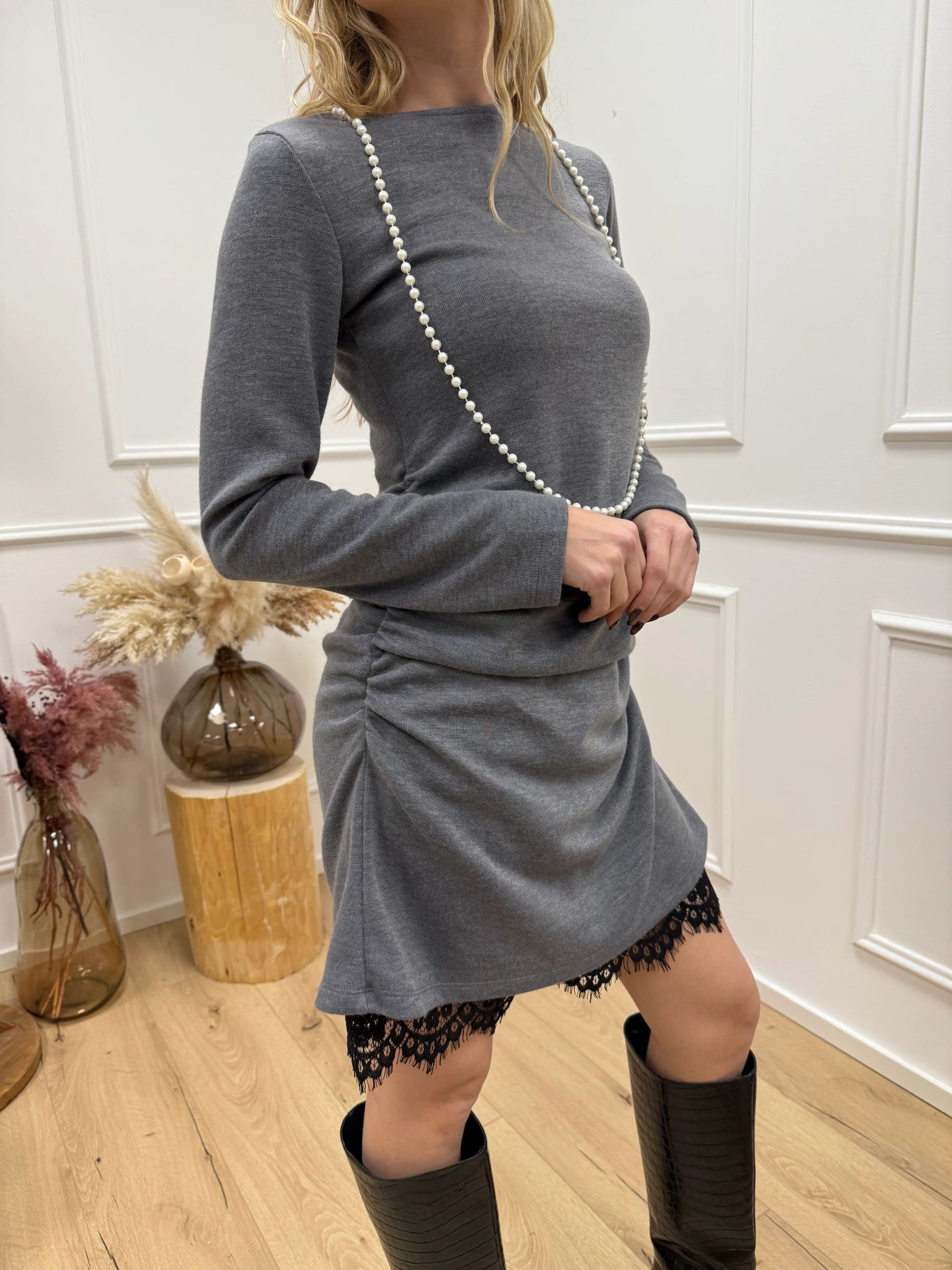 Vestito color grigio misto viscosa Dixie. Modello corto con arricci laterali. Girocollo a maniche lunghe, dettaglio di sottoveste satin con pizzo sul fondo a contrasto panna e collana di perle lunga.