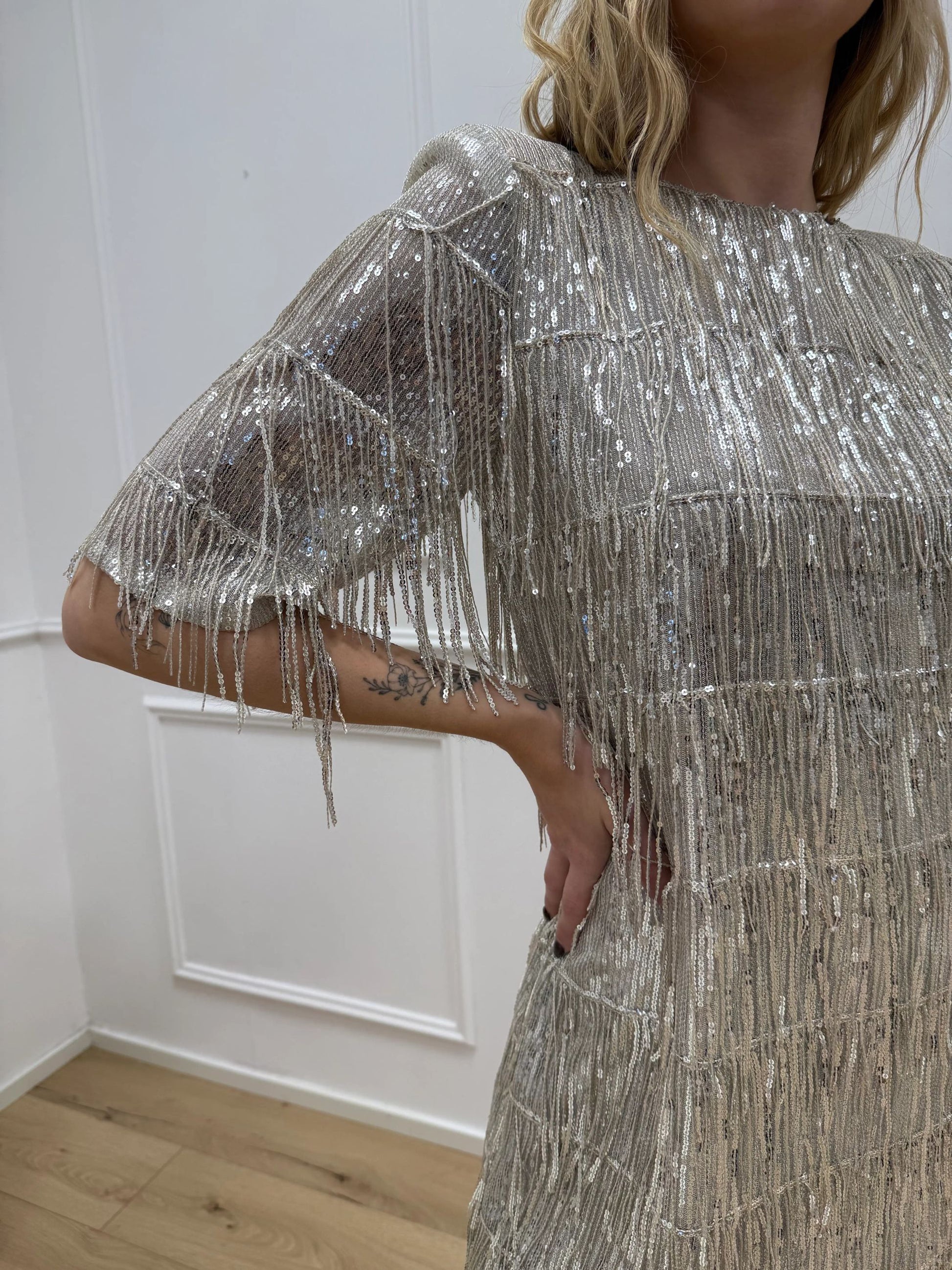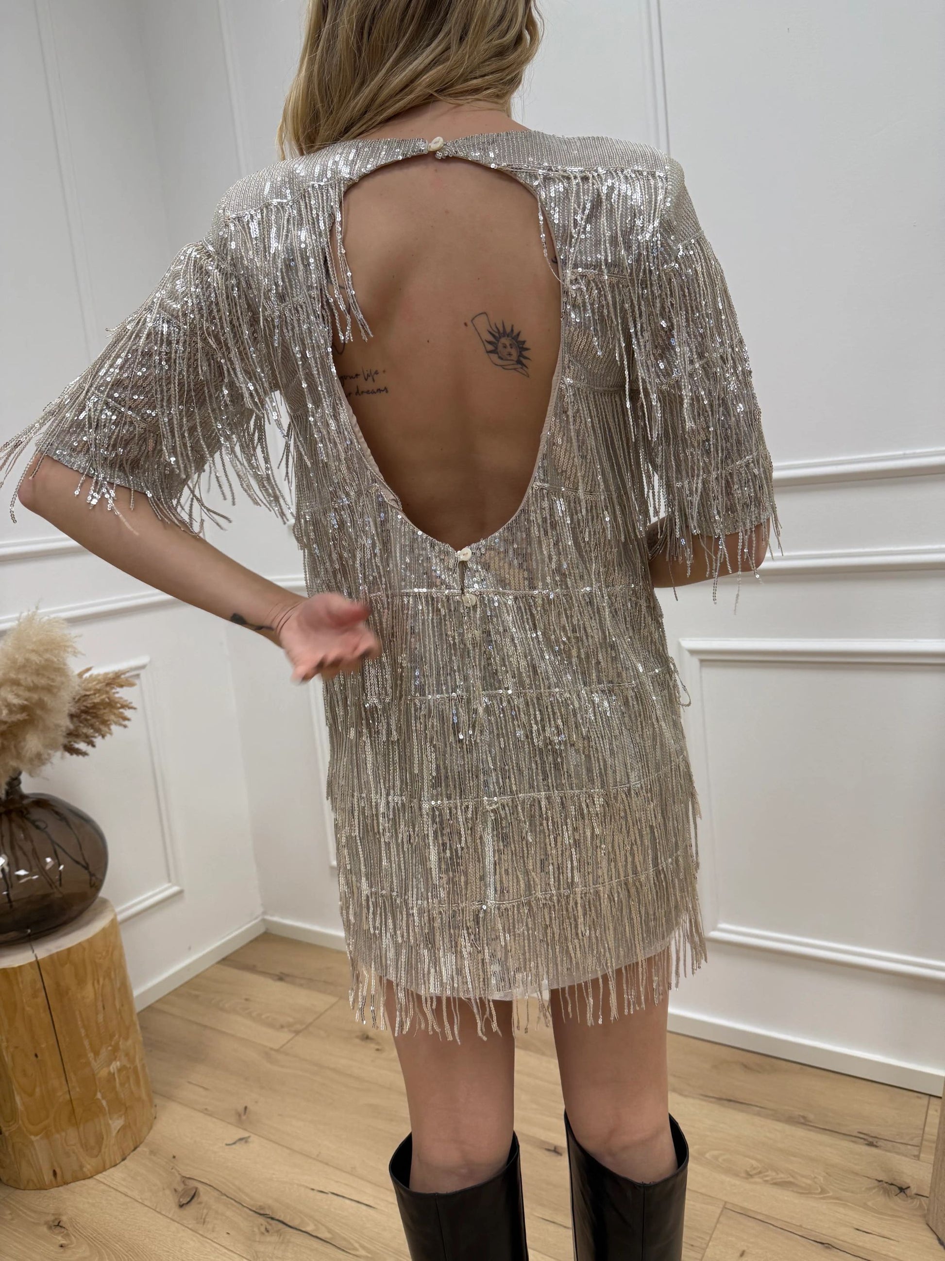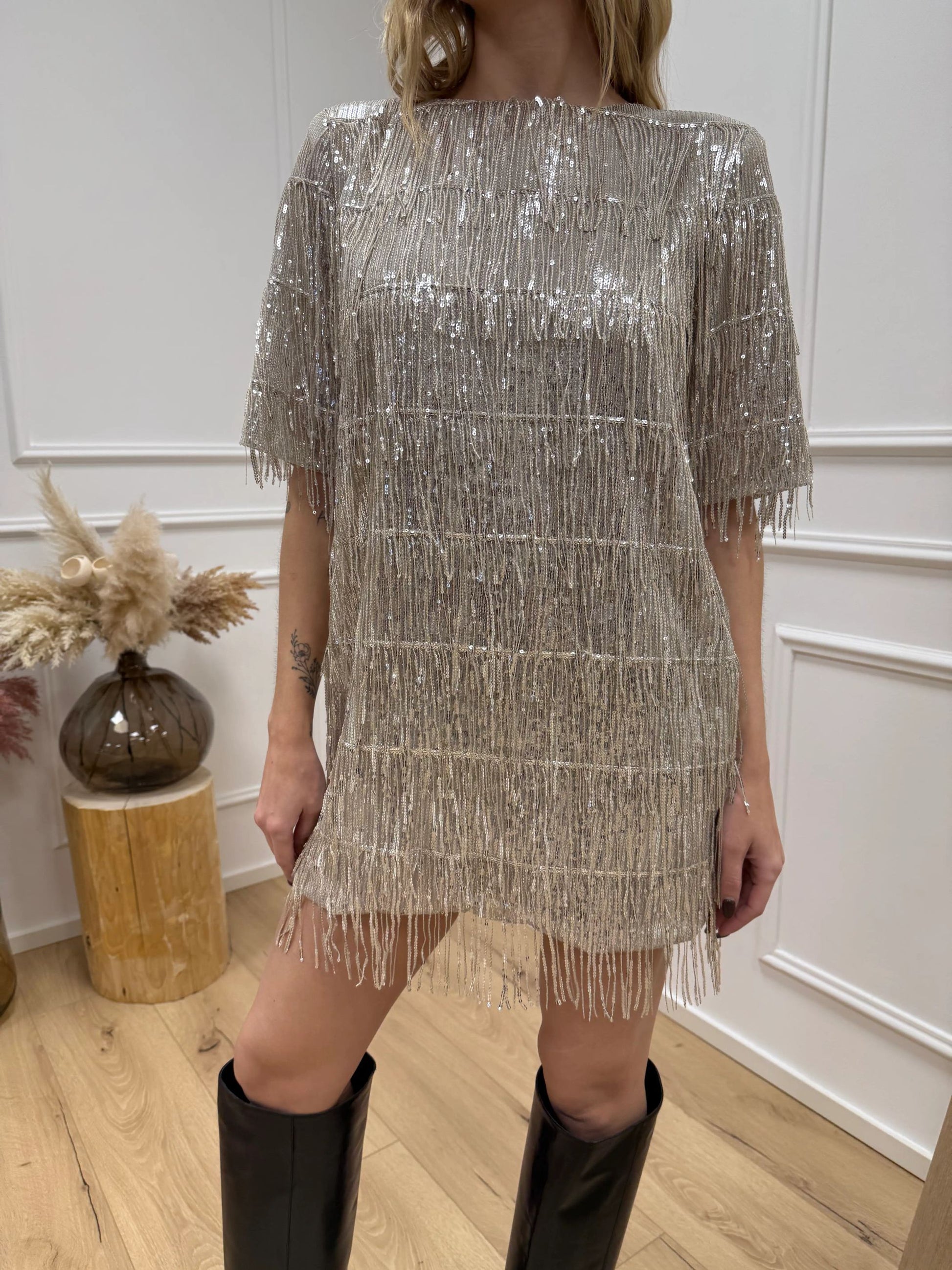 Vestito in paillettes color champagne HaveOne. Modello girocollo a mezza manica. Scollo rotondo sulla schiena e dettaglio di frange all over. Chiusura con bottoncini sul retro.