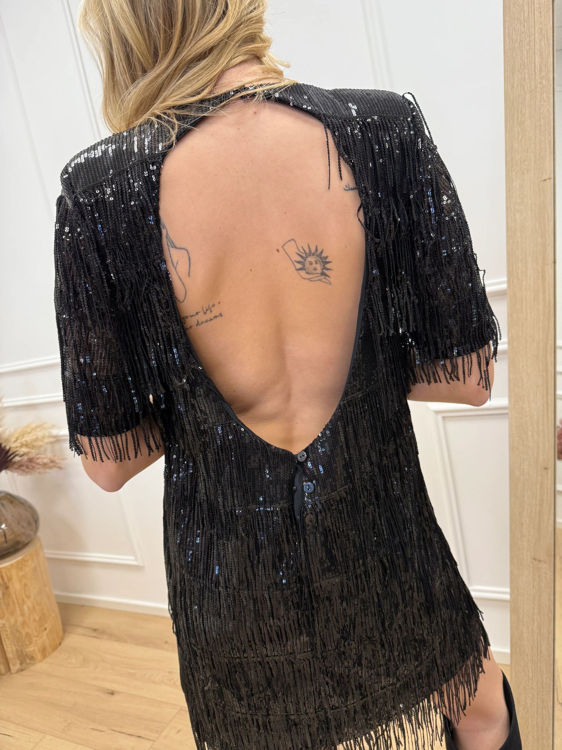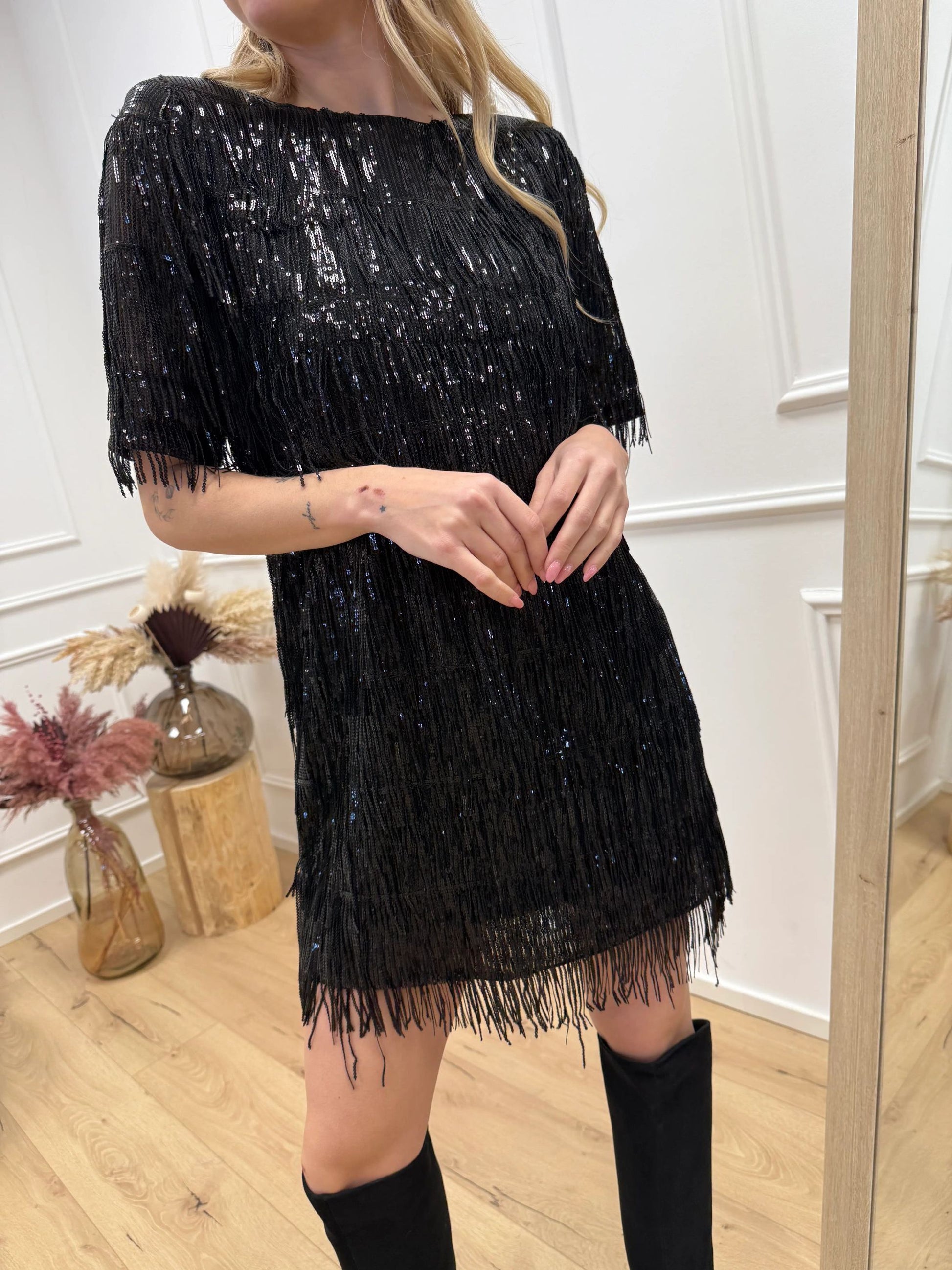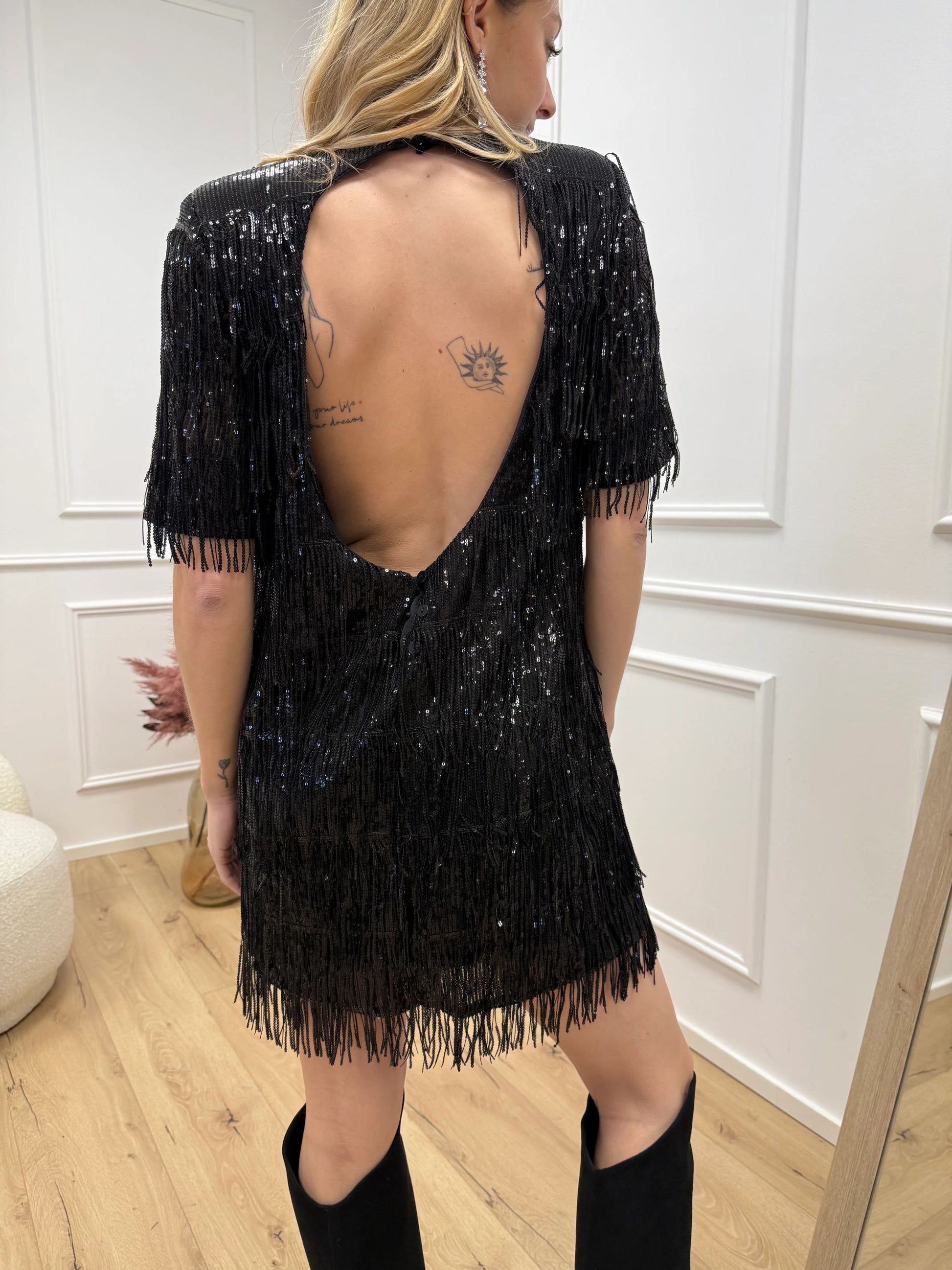 Vestito in paillettes color nero HaveOne. Modello girocollo a mezza manica. Scollo rotondo sulla schiena e dettaglio di frange all over. Chiusura con bottoncini sul retro.