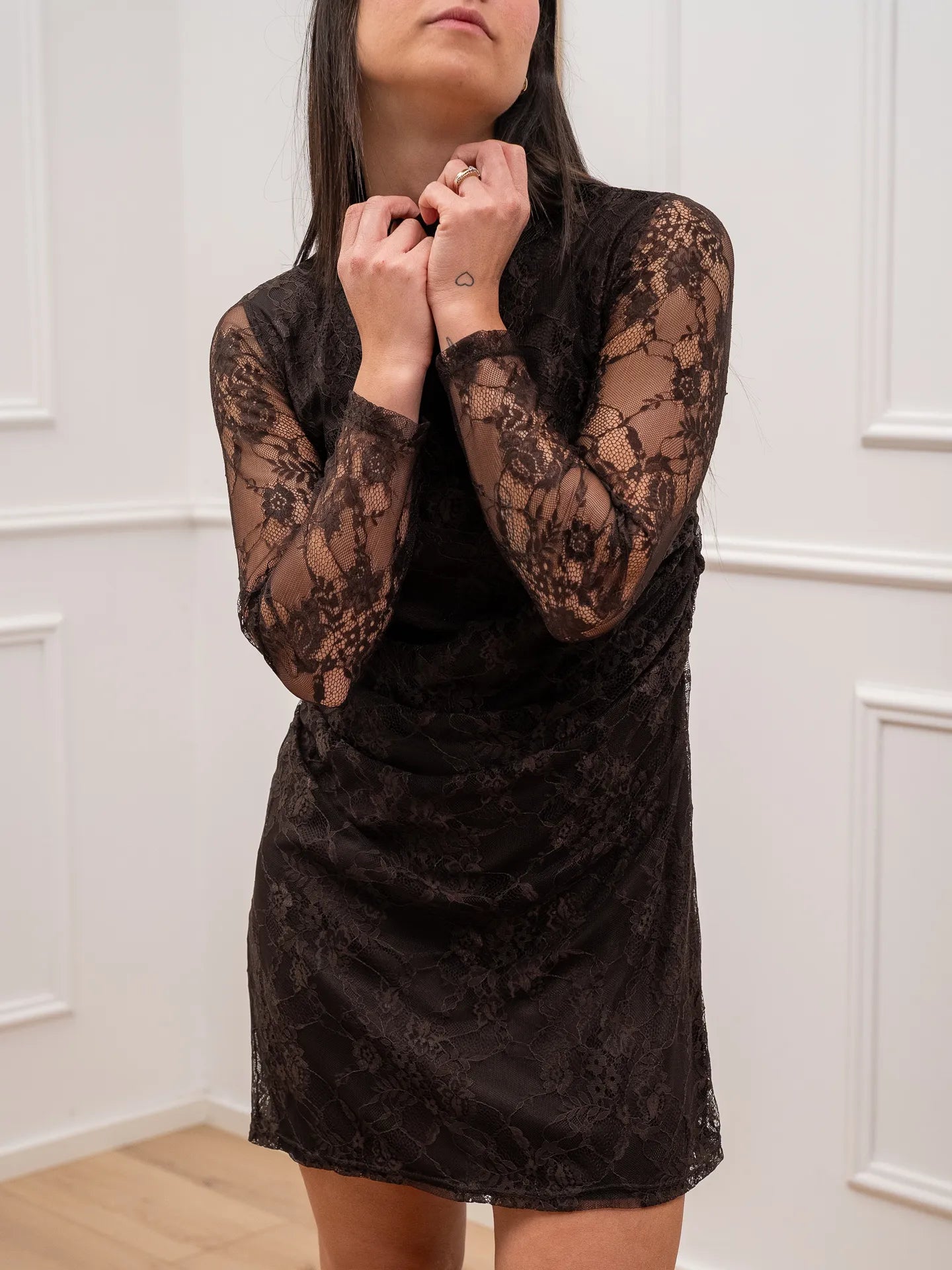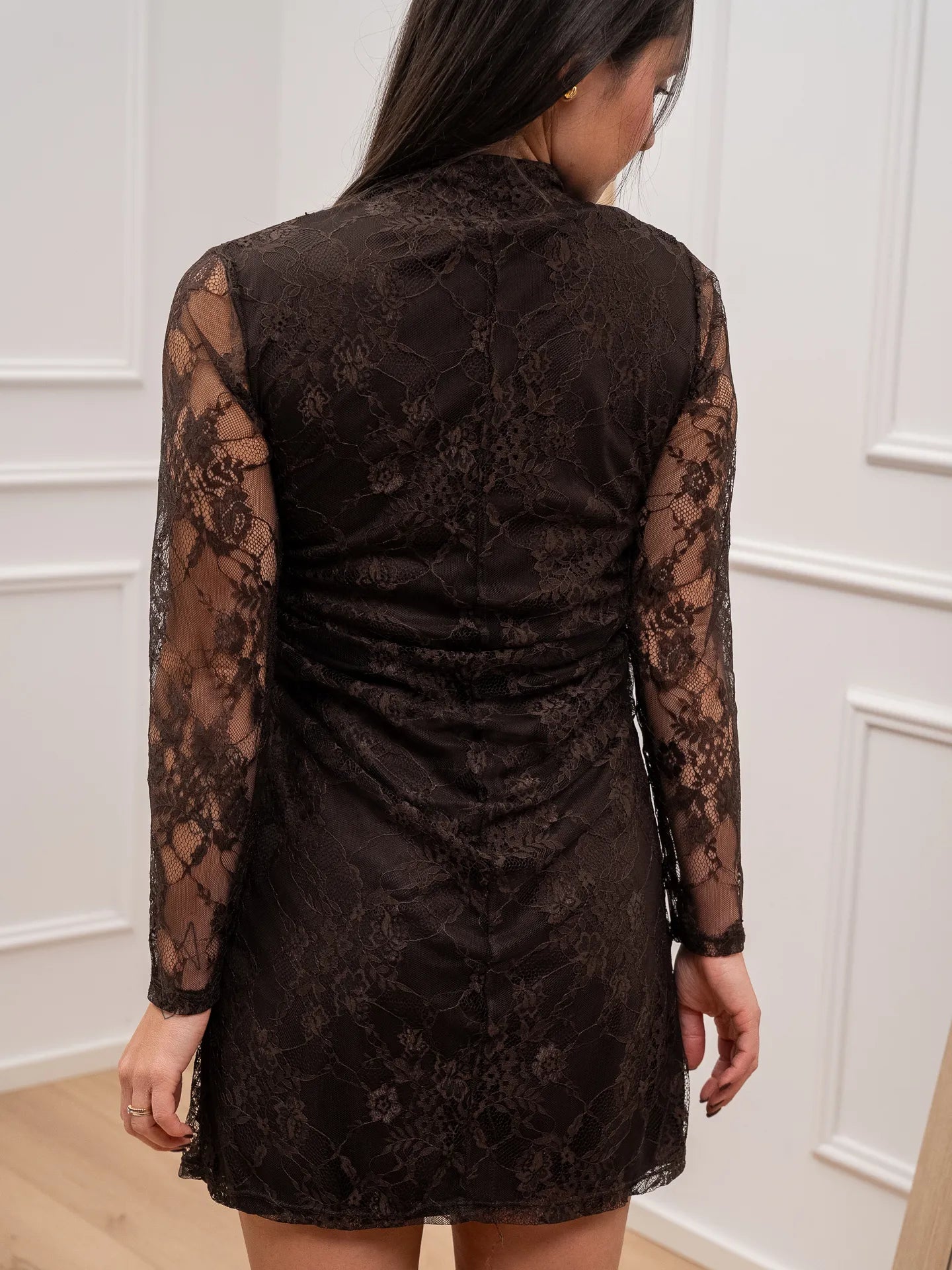 Vestito in pizzo color moro HaveOne. Modello mini a collo alto e maniche lunghe. Fodera tono su tono.
