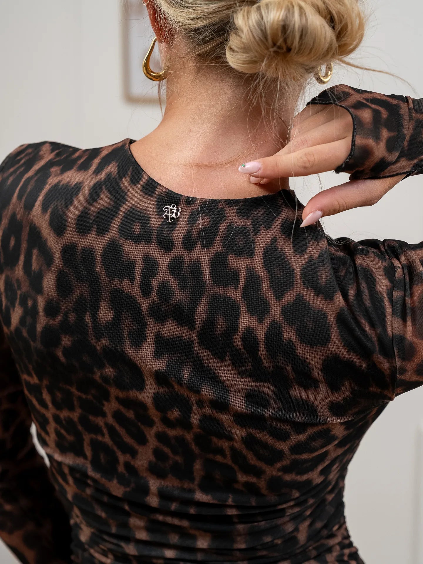 Vestito Judy fantasia maku in tulle Aniye By. Modello mini girocollo a manica lunga con manicotto. Dettaglio di arricci laterali.