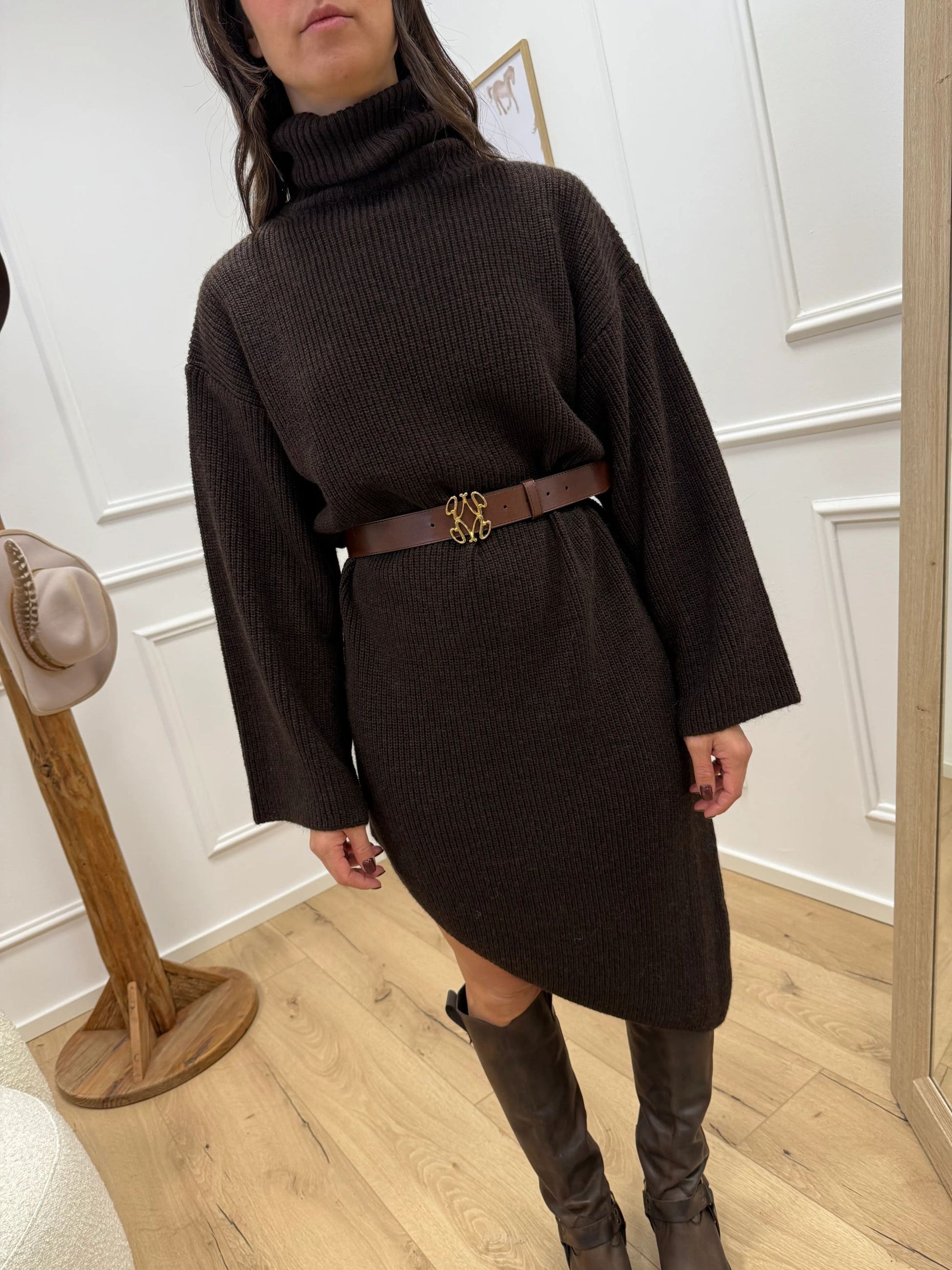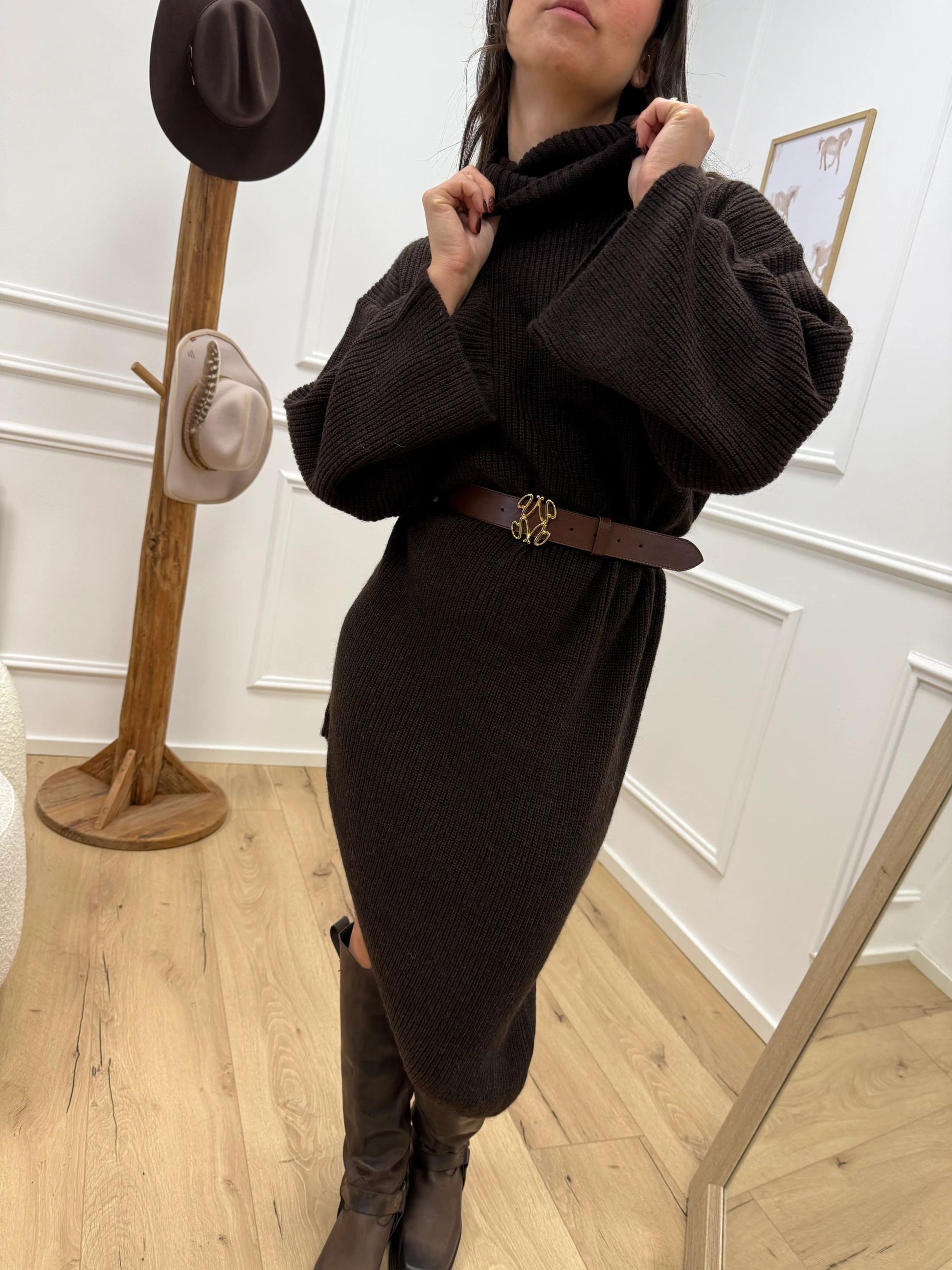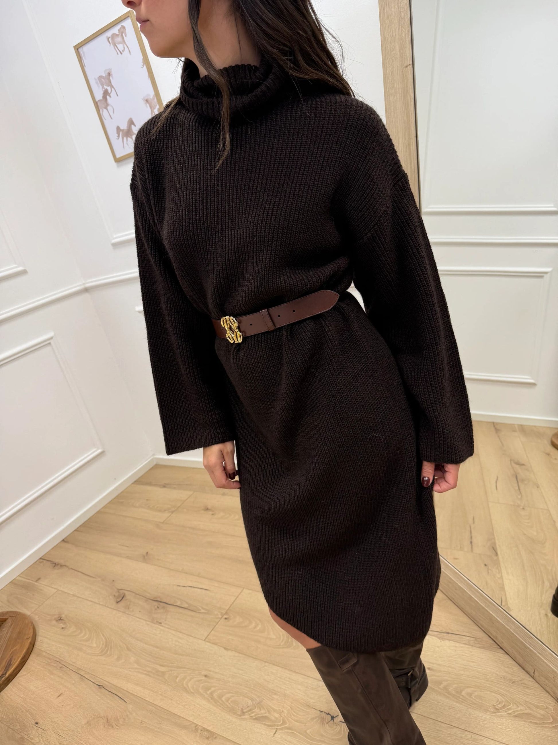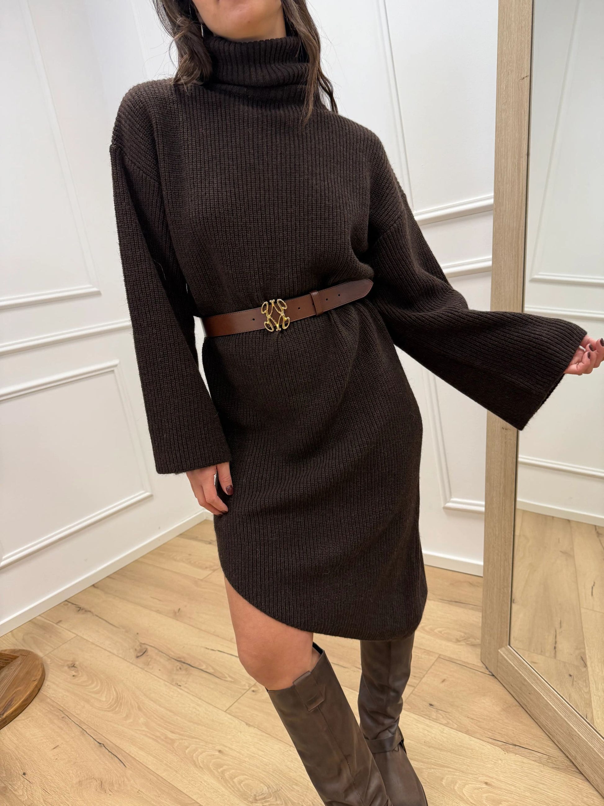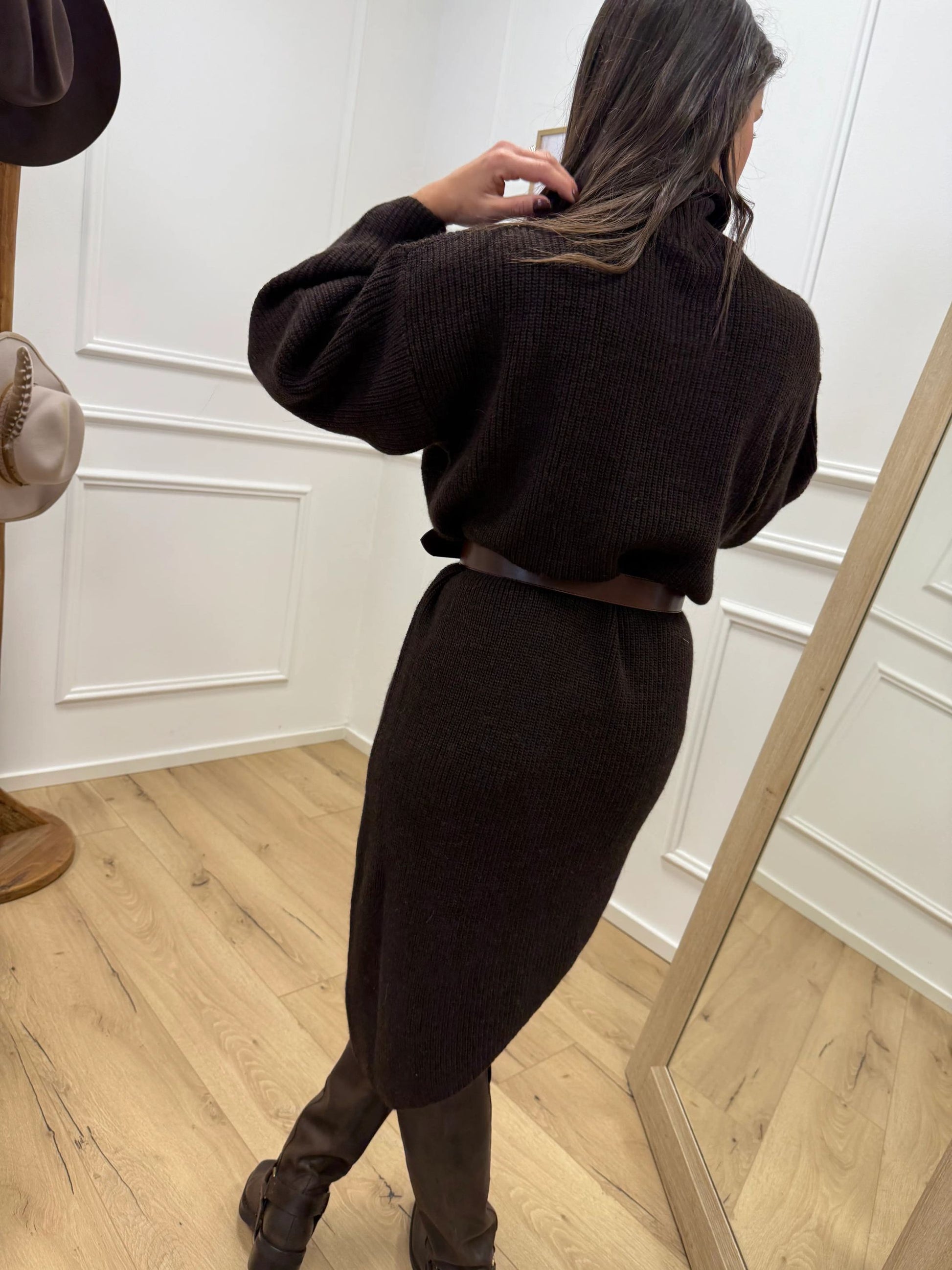 Vestito color moro Kontatto. Modello longuette fit morbido con collo alto e manica lunga ampia. Dettaglio di taglio asimmetrico sul fondo.