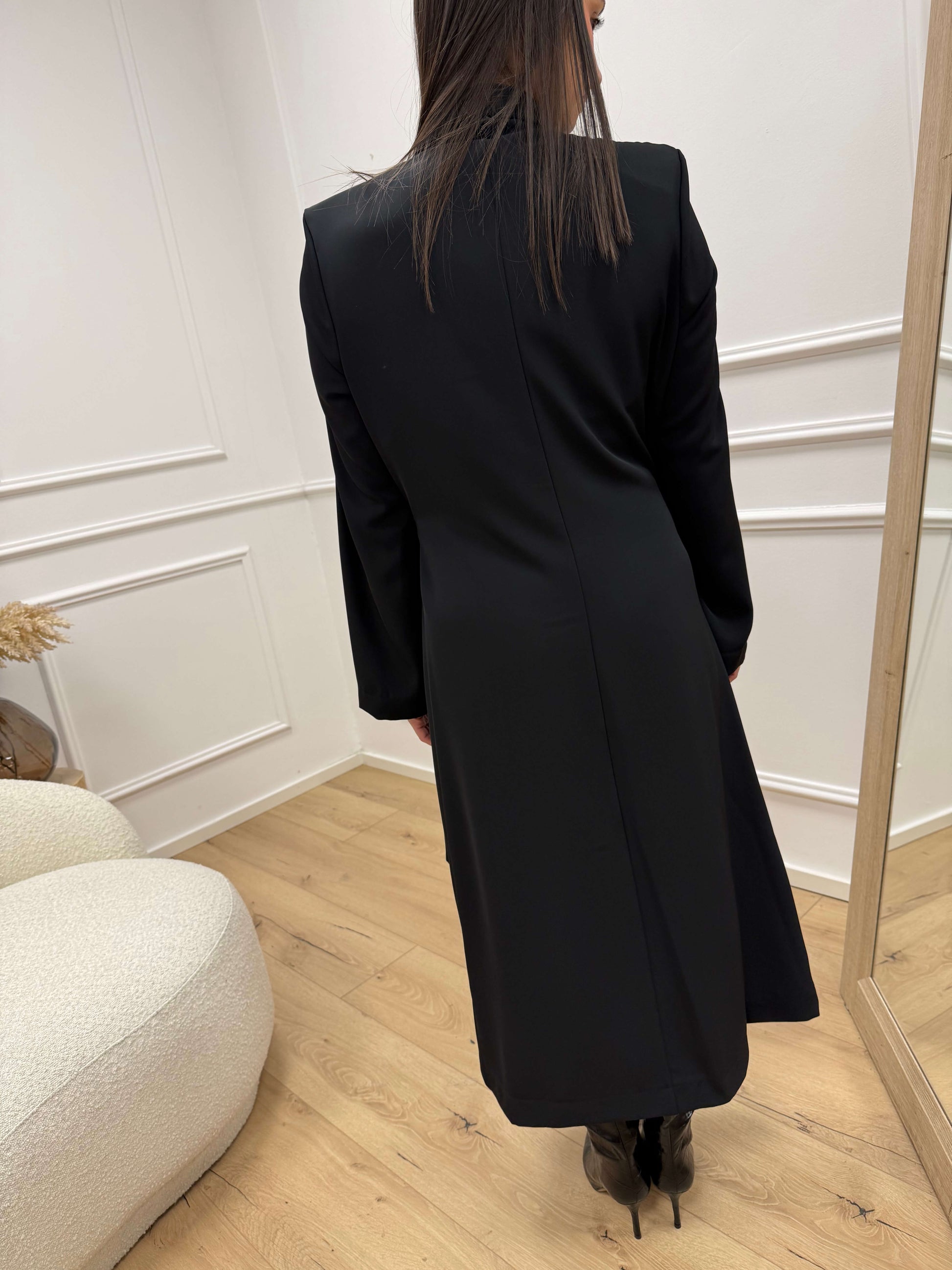 Vestito color nero Tensione In. Modello chiusura a portafoglio con collo revers e laccio da annodare laterale. Lunghezza caviglia e maniche lunghe. Spalle imbottite.