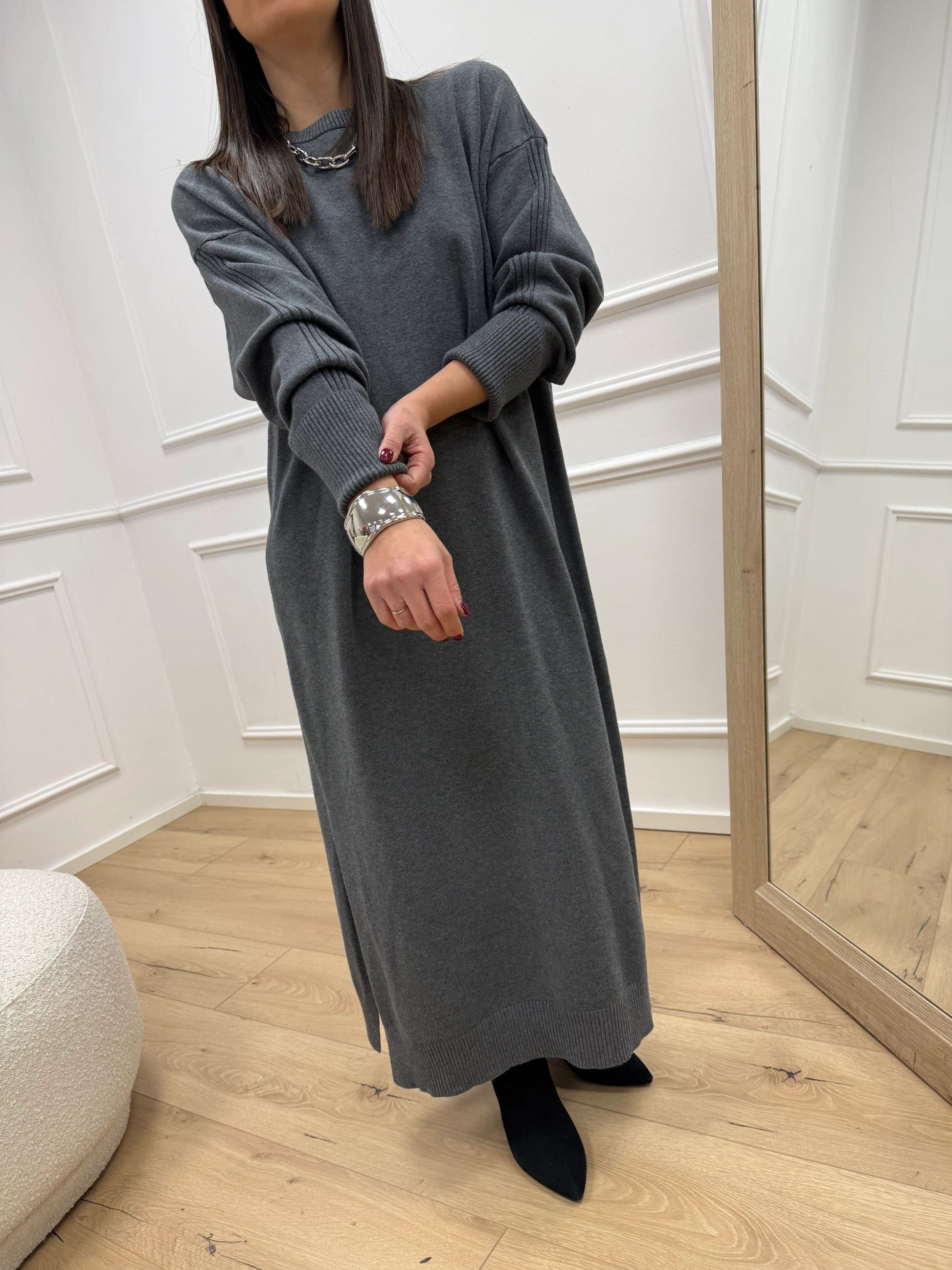 Vestito color grigio misto viscosa Philia Loft. Modello fit oversize girocollo a manica lunga, finiture a coste e spacco laterale.
