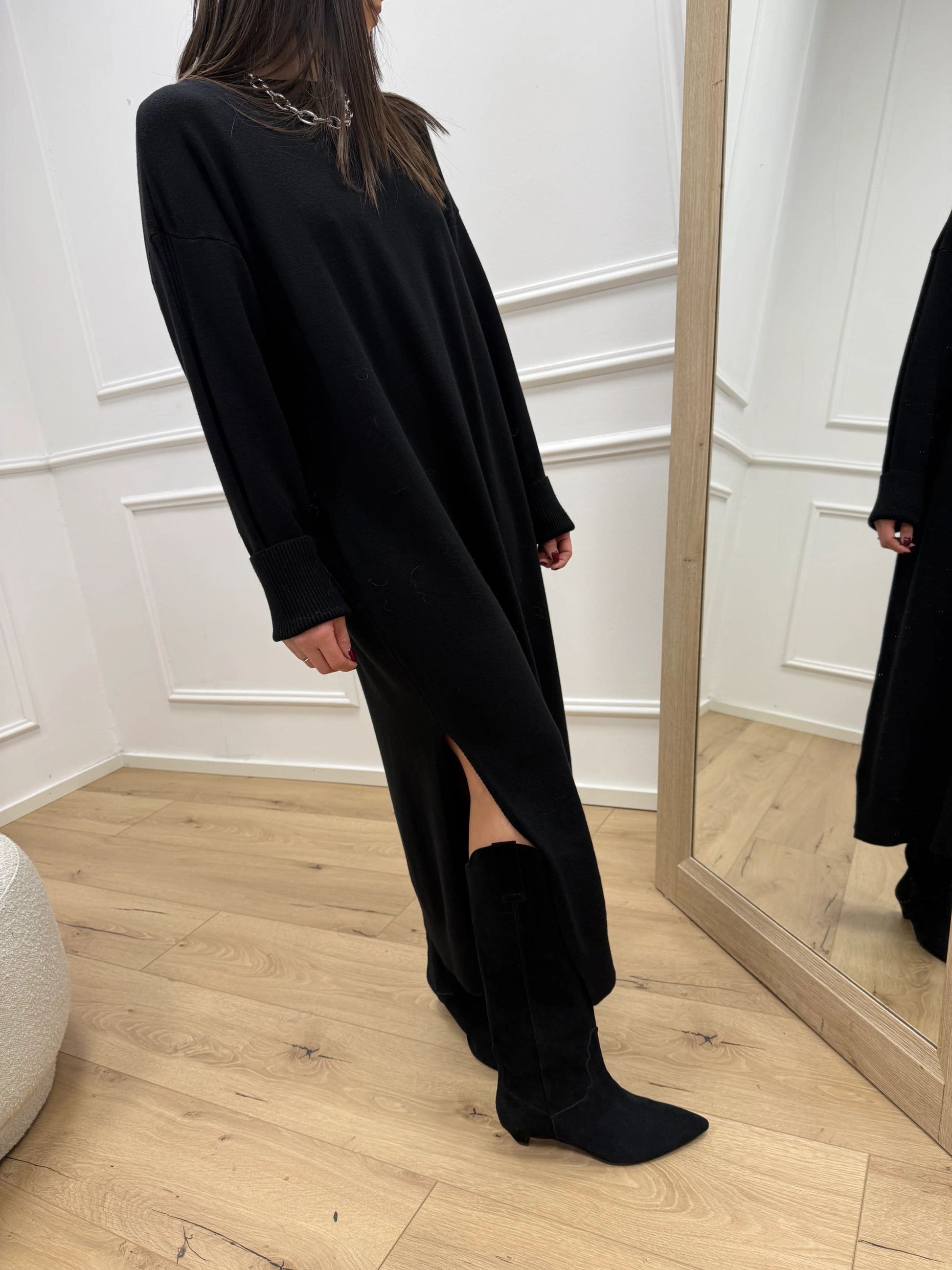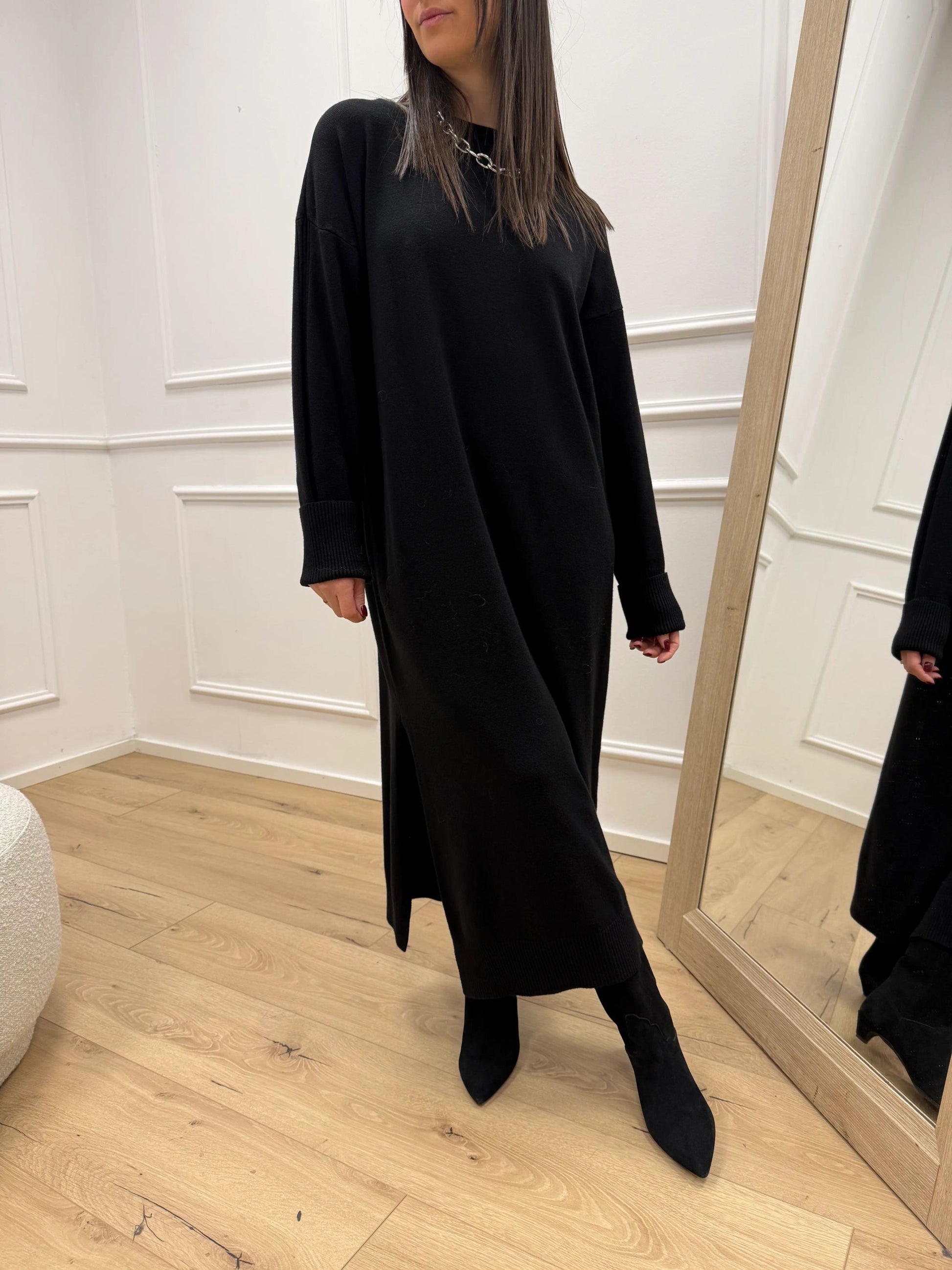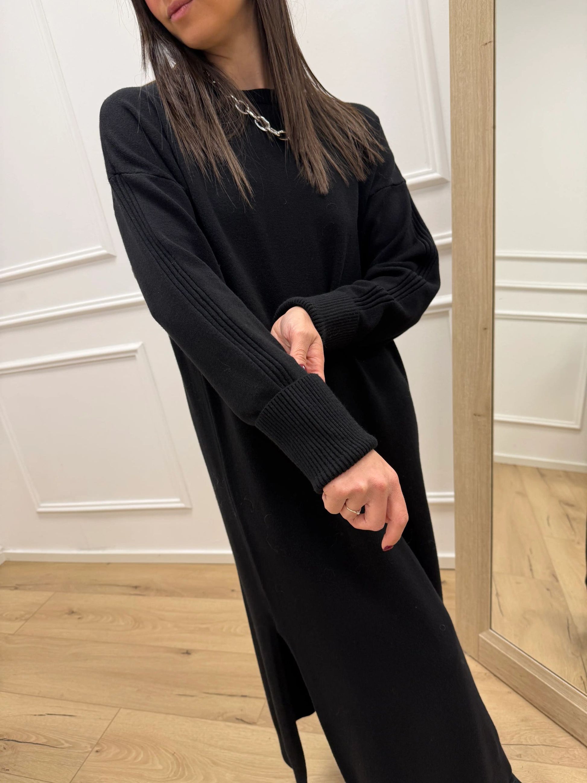 Vestito color nero misto viscosa Philia Loft. Modello fit oversize girocollo a manica lunga, finiture a coste e spacco laterale.