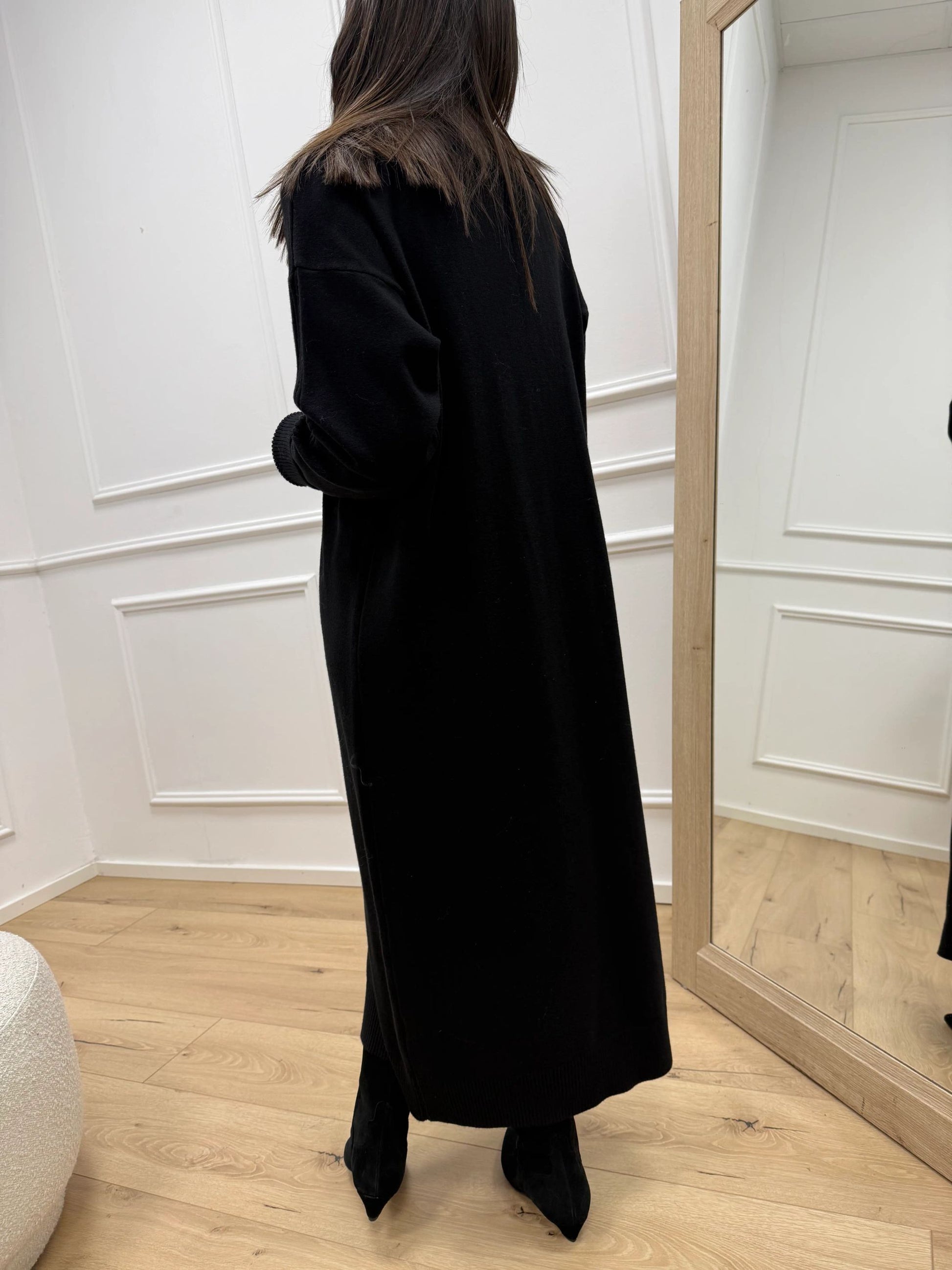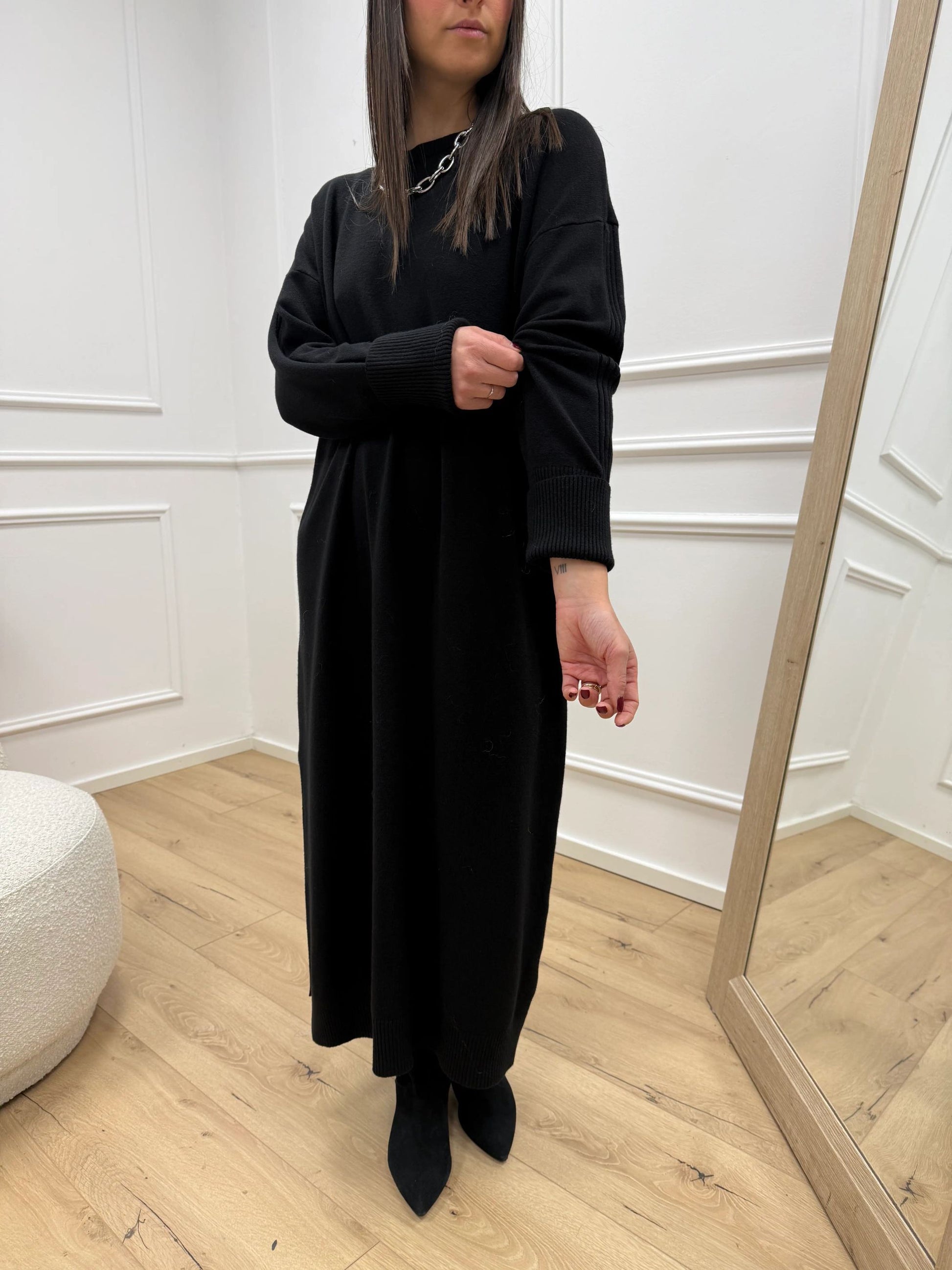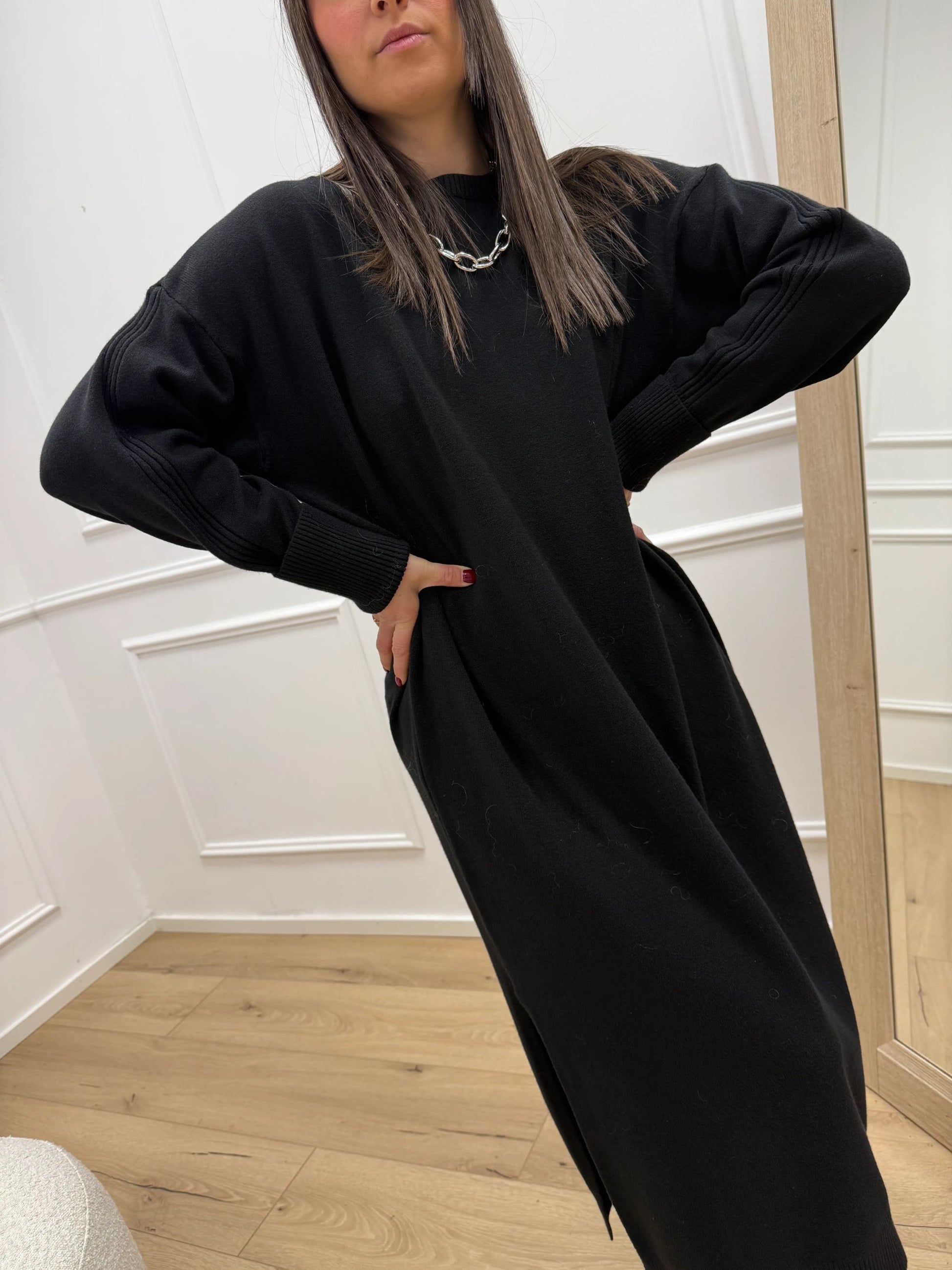 Vestito color nero misto viscosa Philia Loft. Modello fit oversize girocollo a manica lunga, finiture a coste e spacco laterale.