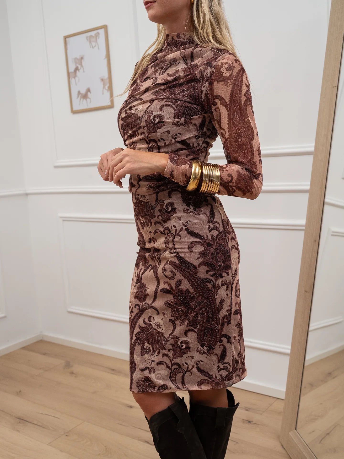 Vestito paisley color malva HaveOne. Modello foderato a manica lunga. Dettaglio di arricciature frontali. Fit aderente.