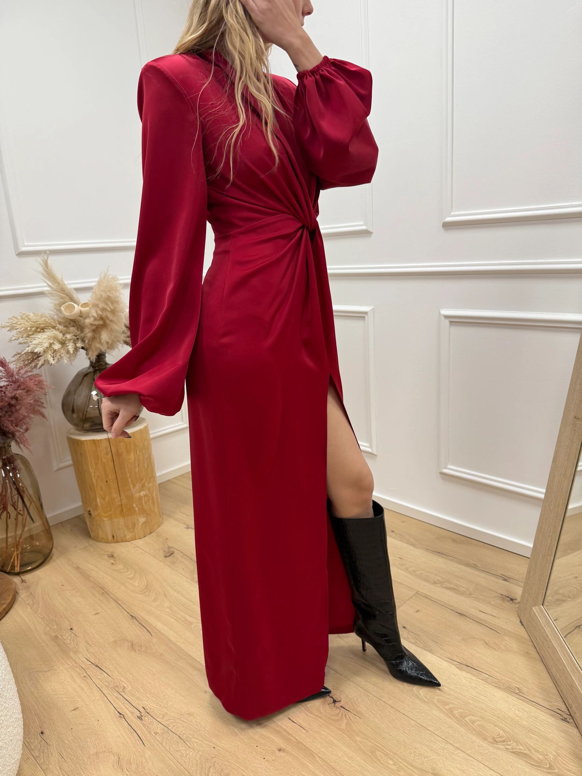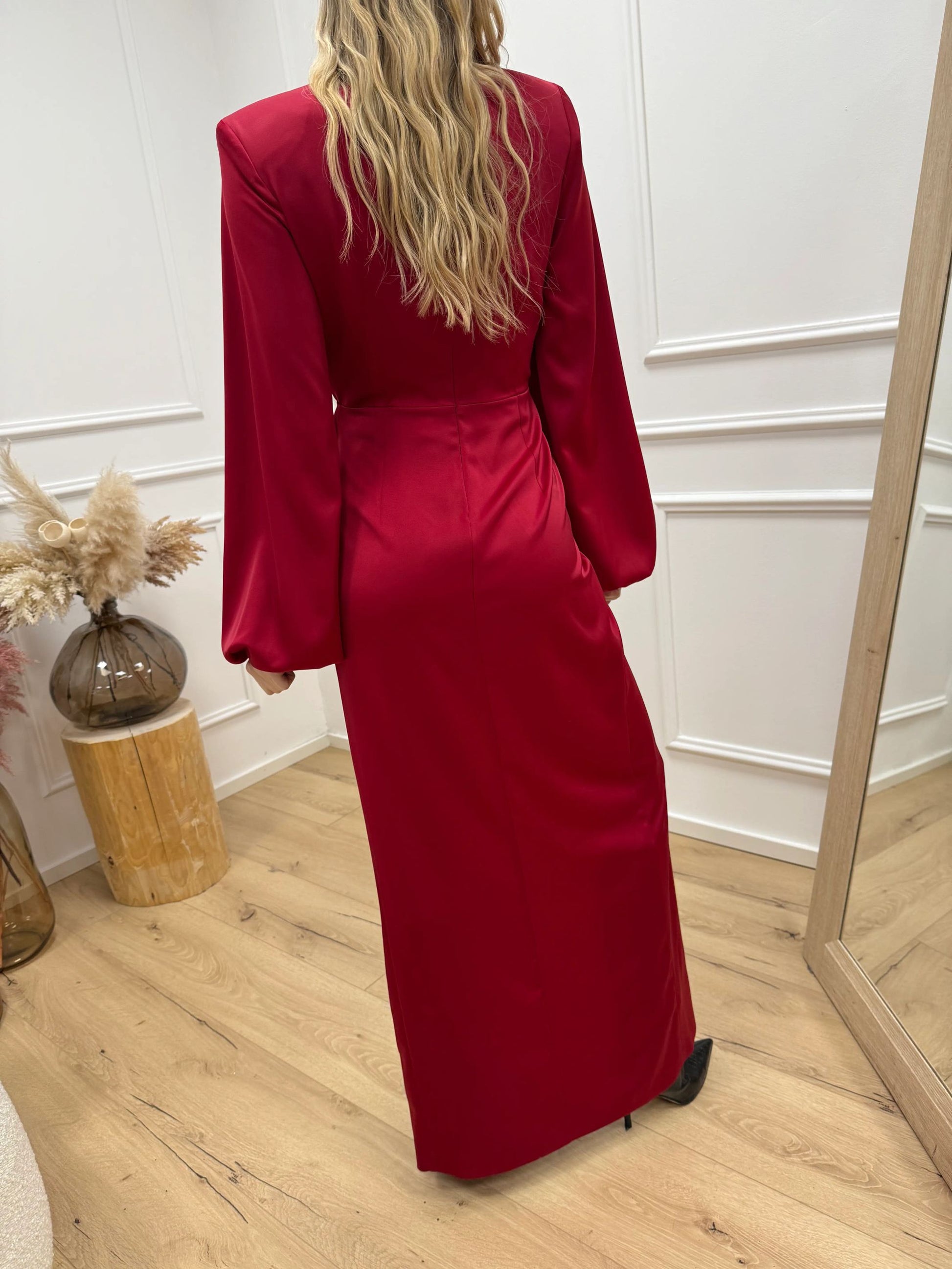 Vestito Tokyo color rosso in raso Silence. Modello lungo con scollo a v e nodo frontale. Spalle imbottite e spacco frontale. Manica balloon con elastico arricciato sul fondo.